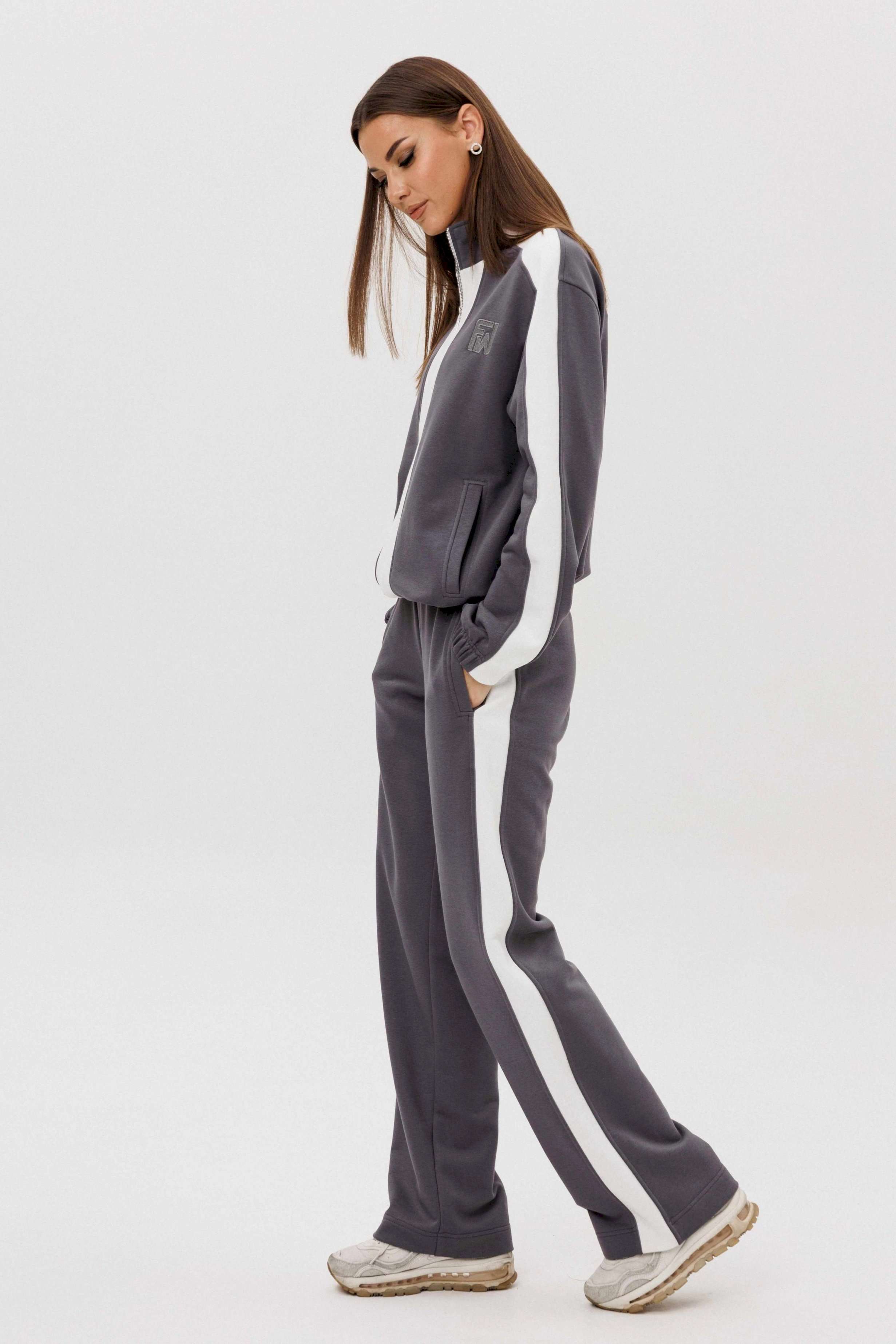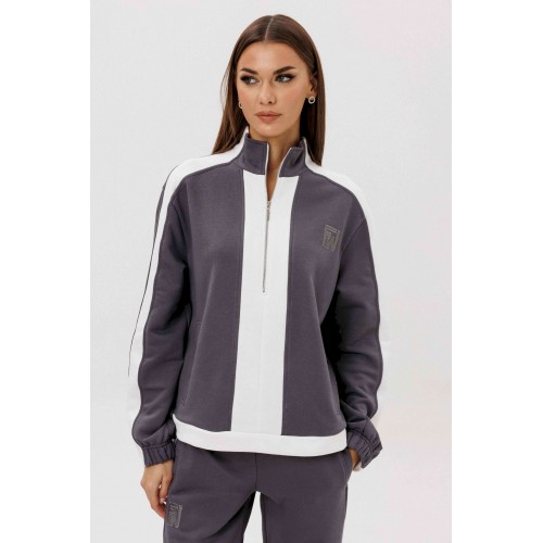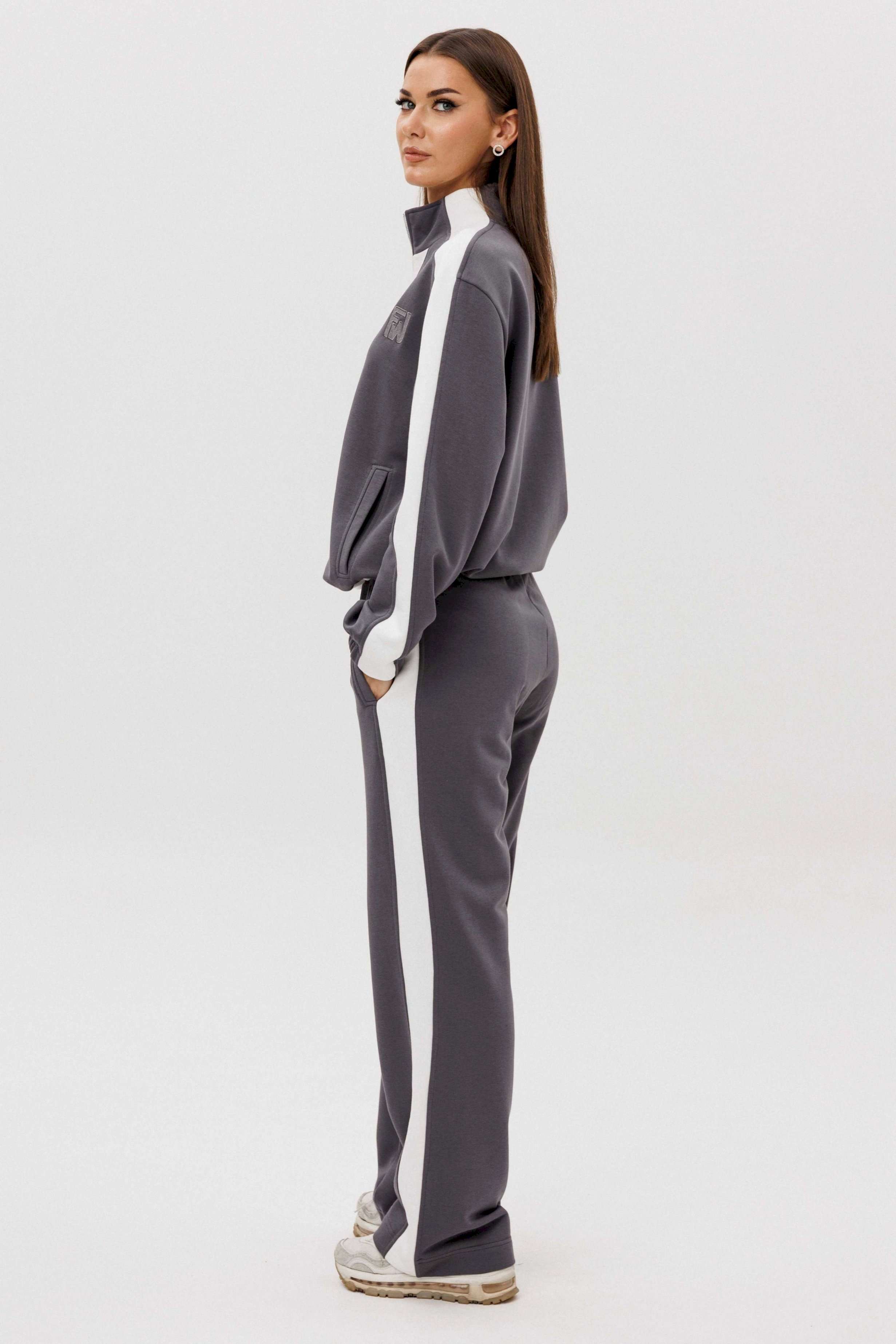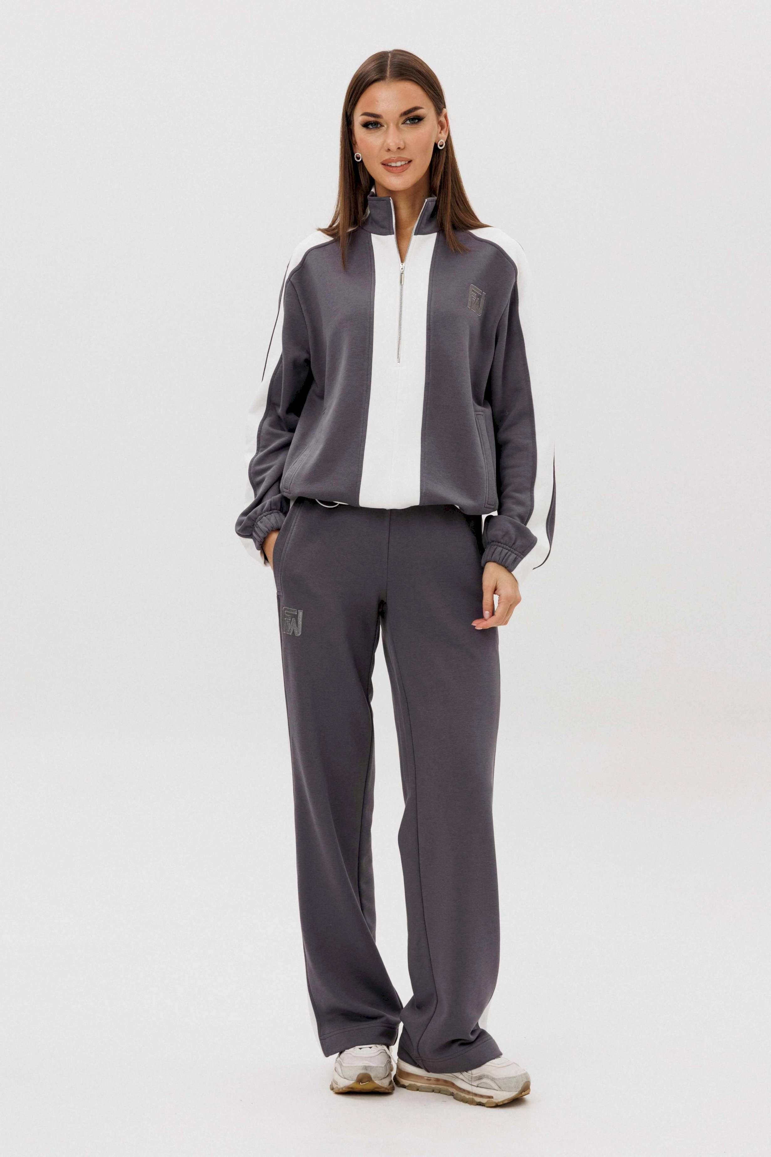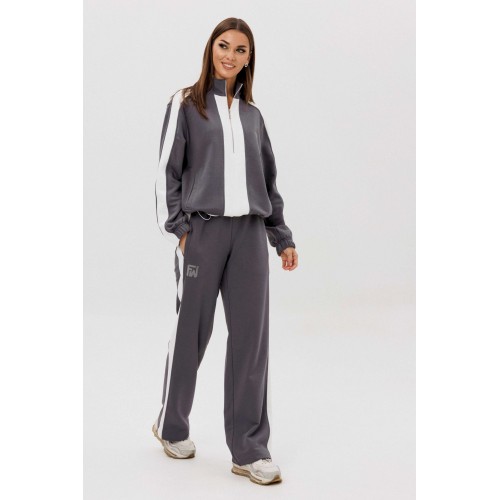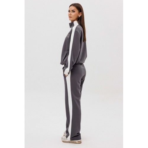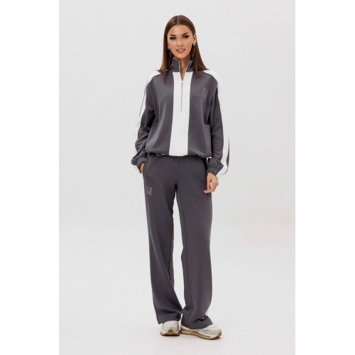 Комфорт - один из ключевых трендов современной действительности, который отлично реализуется в контексте стиля спорт-кэжуал. Его выбирает тот, кто не желает ограничивать себя жёсткими рамками, стремится выглядеть модно и динамично и не считает, что красота требует жертв. Свободный, упрямлённый свитшот с заниженной линией плеча, воротником-стойкой, частичной застёжкой на тесьму-молнию, прорезными карманами, рукавом, состоящим из 3-х частей с притачной манжетой и кулисой с регулирующей эластичной тесьмой и фиксаторами по низу изделия. Брюки свободные, прямые на притачном эластичном поясе с контрастными лампасами и карманами с листочками в боковых швах. Контрастные лампасы на брюках, рукавах, по центру переда и низу придают модели особую динамичность и изысканность. Длина свитшота около 62 см. Длина рукава с плечом около 76 см. Длина брюк около 104 см.