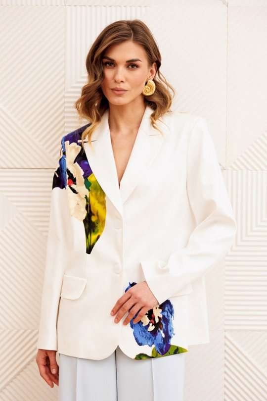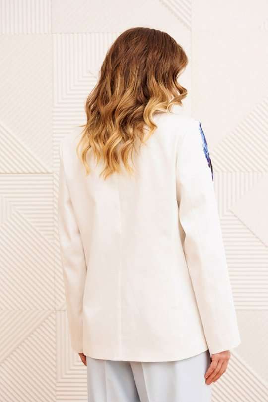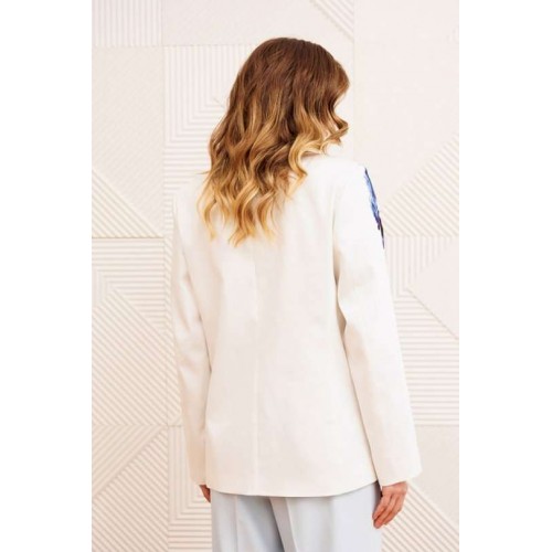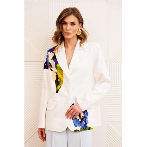Жакет полуприлегающего силуэта из хлопковой ткани. Застежка однобортная на две пуговицы, воротник пиджачного типа. Перед с талиевой вытачкой, рельефом и декоративным клапаном. Спинка с рельефами из проймы и средним швом. Рукав втачной двухшовный. Жакет на подкладке. Длина жакета - 68 см, длина рукава жакета - 60 см.