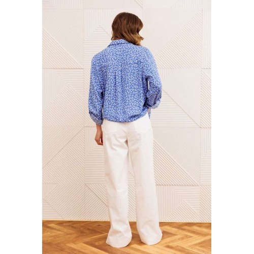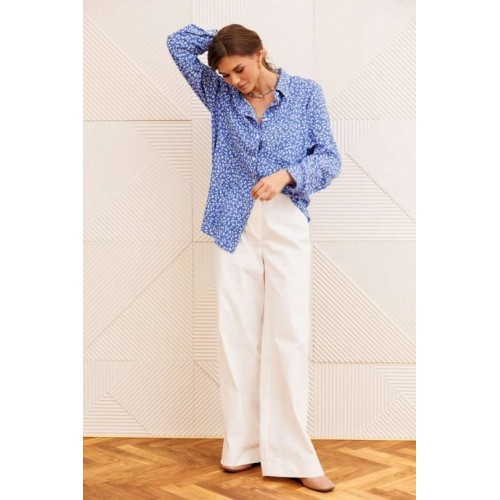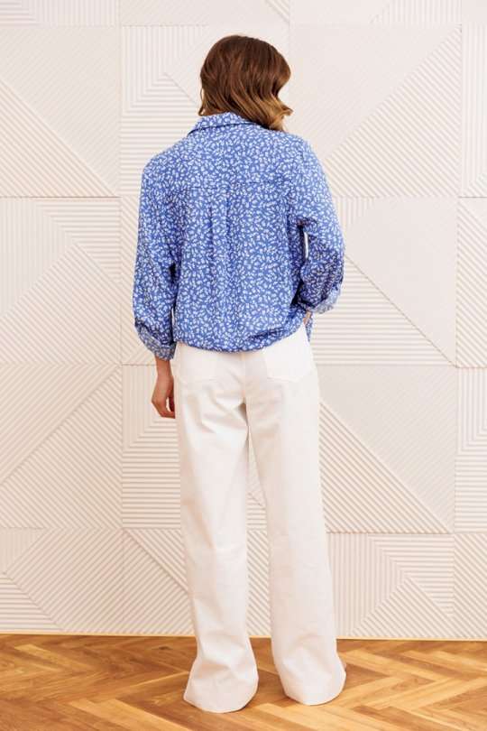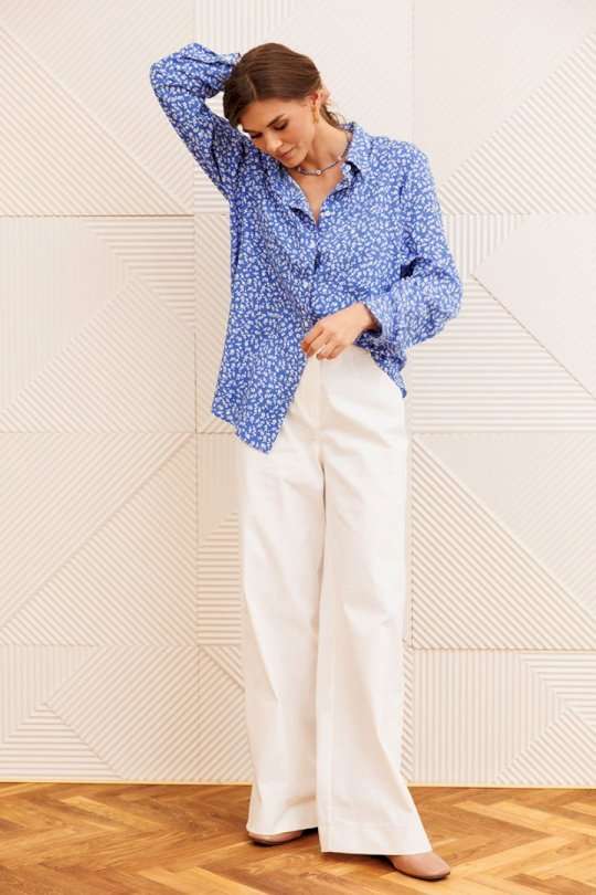 Брюки расширеные книзу на притачном поясе из джинсовой хлопковой ткани. по поясу настрочены шлевки. По передним и задним частям брюк вытачки. На задних частях брюк настрочены карманы. Карманы, вытачки, пояс, низ брюк отделаны отделочной строчкой. Длина брюк с учетом пояса - 107 см.