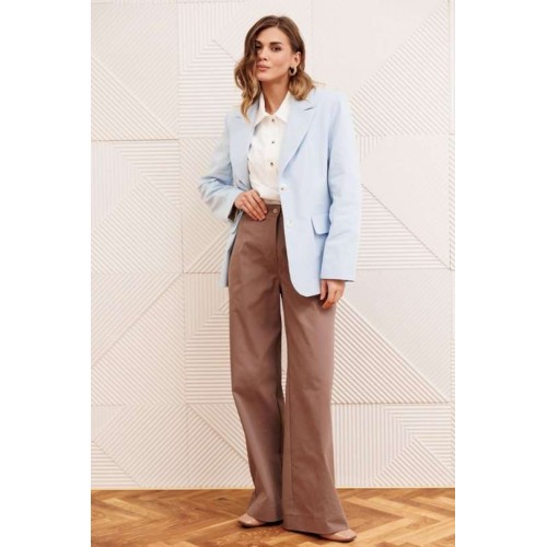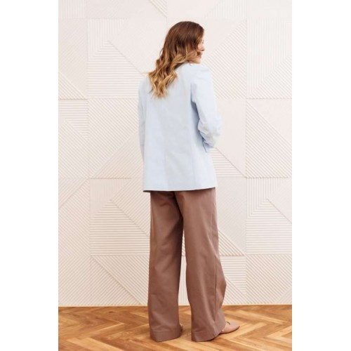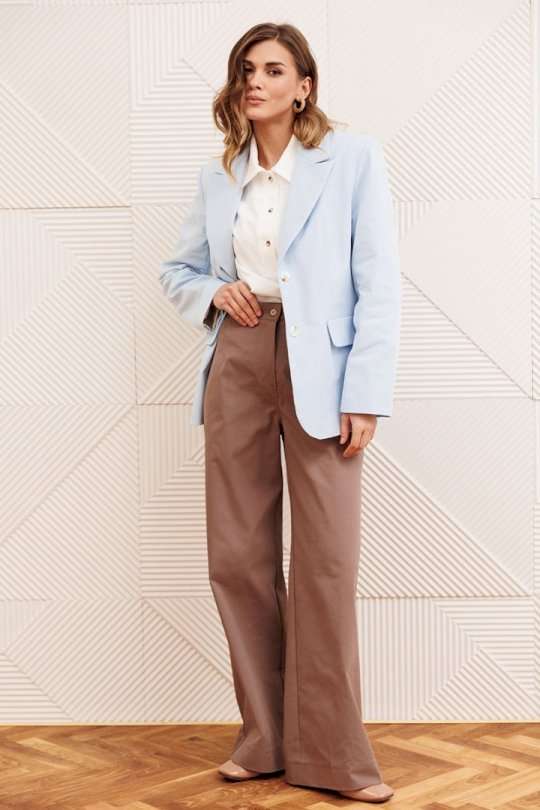 Костюм состоит из жакета и брюк из хлопковой ткани. Жакет полуприлегающего силуэта с воротником пиджачного типа. Застежка однобортная на две пуговицы. Перед с талиевой вытачкой, рельефом и декоративным клапаном. Спинка с рельефами из проймы и средним швом. Рукав втачной двухшовный. Брюки расширеные книзу на притачном поясе. По поясу настрочены шлевки. По передним и задним частям брюк вытачки. На задних частях брюк настрочены карманы. Карманы, вытачки, пояс, низ брюк отделаны отделочной строчкой. Длина жакета - 68см, длина рукава жакета - 60 см, длина брюк с учетом пояса -107 см