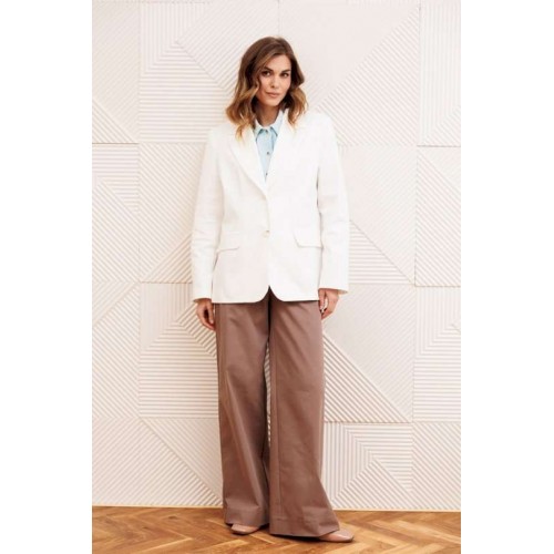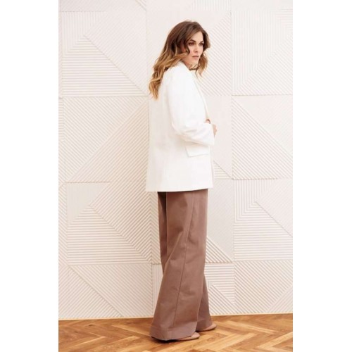 Костюм состоит из жакета и брюк из хлопковой ткани. Жакет полуприлегающего силуэта с воротником пиджачного типа. Застежка однобортная на две пуговицы. Перед с талиевой вытачкой, рельефом и декоративным клапаном. Спинка с рельефами из проймы и средним швом. Рукав втачной двухшовный. Брюки расширеные книзу на притачном поясе. По поясу настрочены шлевки. По передним и задним частям брюк вытачки. На задних частях брюк настрочены карманы. Карманы, вытачки, пояс, низ брюк отделаны отделочной строчкой. Длина жакета - 68см, длина рукава жакета - 60 см, длина брюк с учетом пояса -107 см