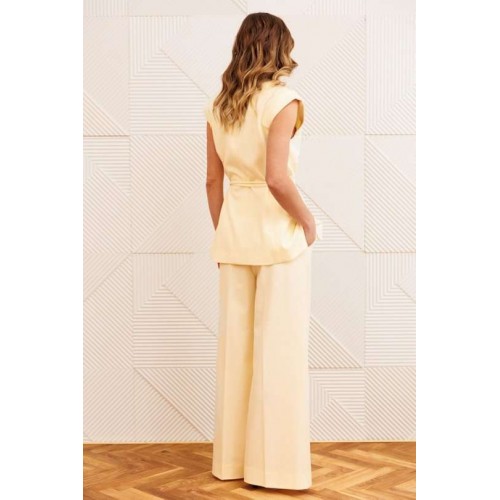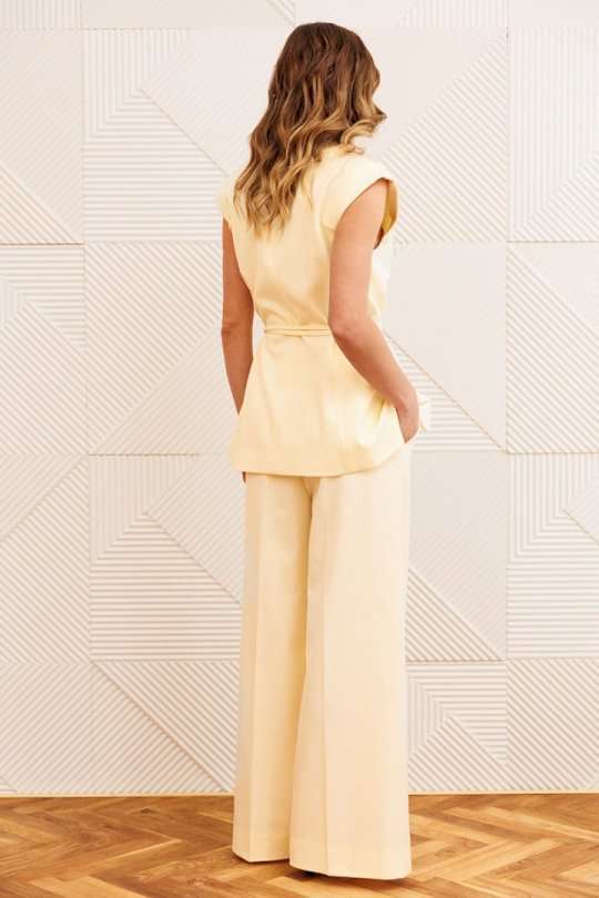 Костюм состоит из жилета и брюк, выполеных из костюмной ткани. Жилет полуприлегающего силуэта с воротником пиджачного типа. Перед с рельефами, талиевой вытачкой и декоративным клапаном. Застежка центральная однобортная на 2 петли и пуговицы. Спинка со средним швом и рельефами. Вдоль оката рукава выполнена декоративная планка. К жилету прилагается тонкий пояс из основной ткани. Брюки расширеные книзу с притачным поясом. Спереди застежка гульфик на молнии и с петлей и пуговицей по поясу. По задней частям брюк вытачки. В боковых швах карманы с наклонным входом. По поясу широкие шлевки. Брюки со срелками. Длина жилета - 71 см, длина брюк с учетом пояса - 109 см.