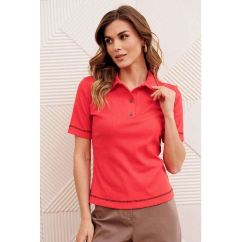 Джемпер приталеного силуэта с воротником поло из трикотажного полотна. Рукав втачной одношовный. Длина джемпера - 57 см, длина рукава - 27 см