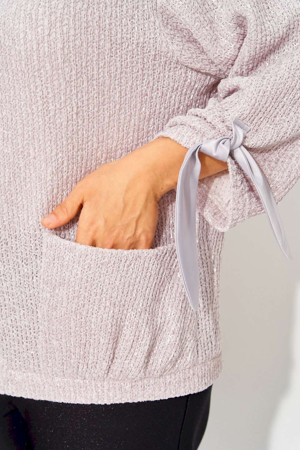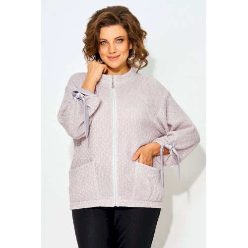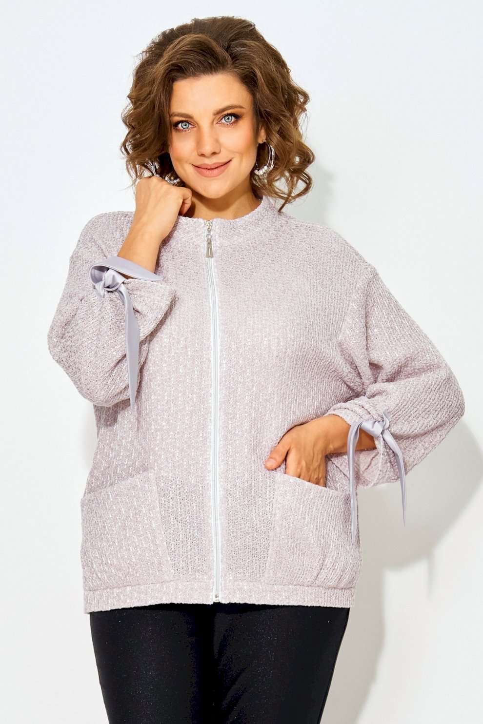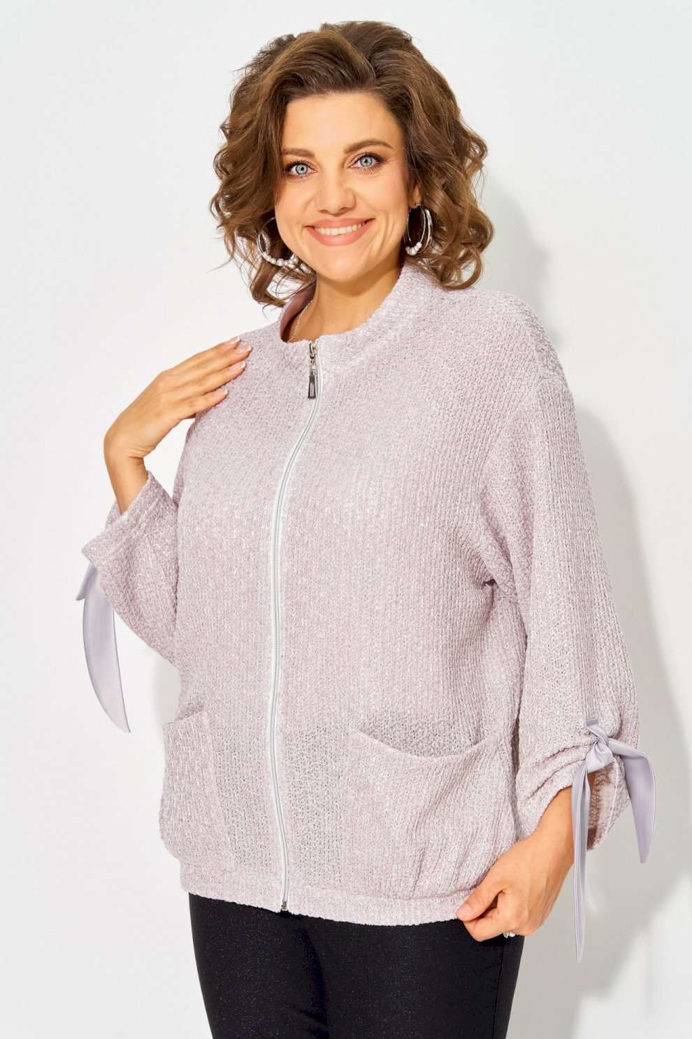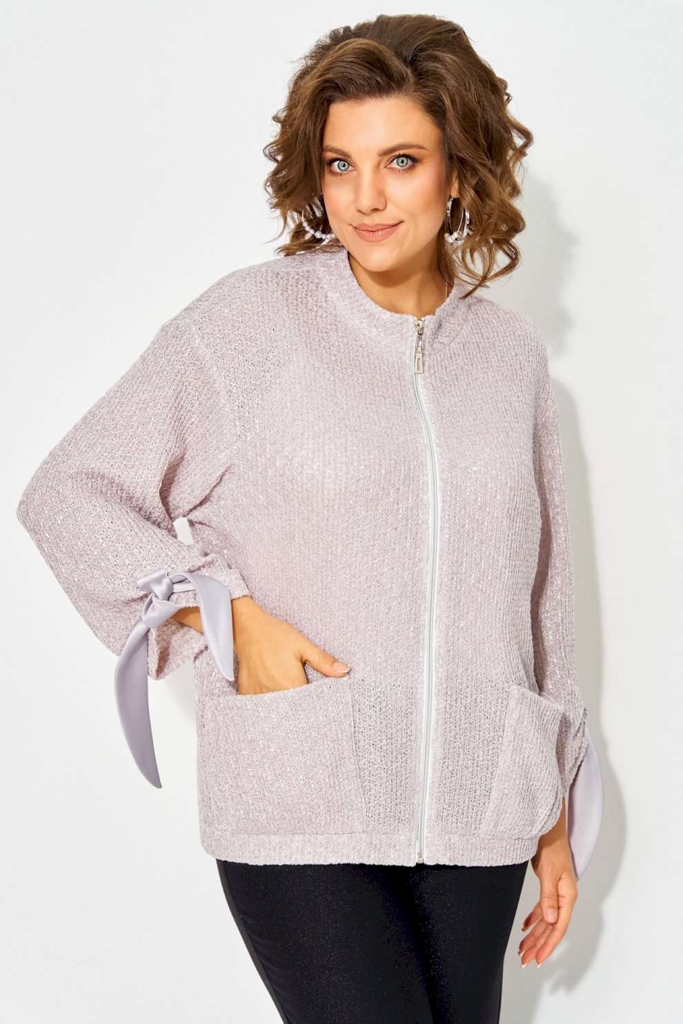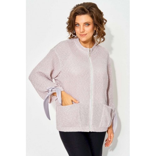 Эффектный, нарядный облегченный жакет, выполнен из вязанного трикотажа с эффектом легкого мерцания. Модель свободного силуэта, с рукавом длиной ¾-ти на спущенном плечевом поясе. Горловина обработана полулежащей стойкой. Застежка центральная на молнию. По полочке расположены аккуратные накладные карманы. Низ изделия оформлен притачной планкой. Изюминкой данной моделям служит необычные паты по рукаву с завязкой в виде банта. Этот вязанный трикотажный жакет - идеальный вариант для создания стильного и привлекательного романтического образа! Мягкий и нежный материал делает его очень приятным на ощупь, теплым и уютным, а легкое мерцание придает свою изюминку. Отлично сочетается с классическими прямыми брюками из базовой коллекции от бренда Лилиана! Длина – по спинке – около 70 см см, рукав – 55 см