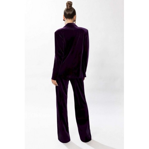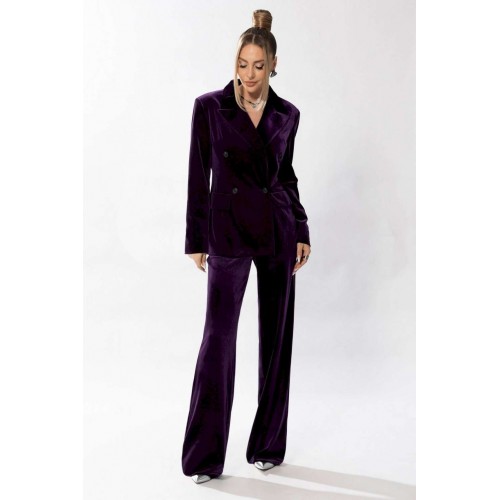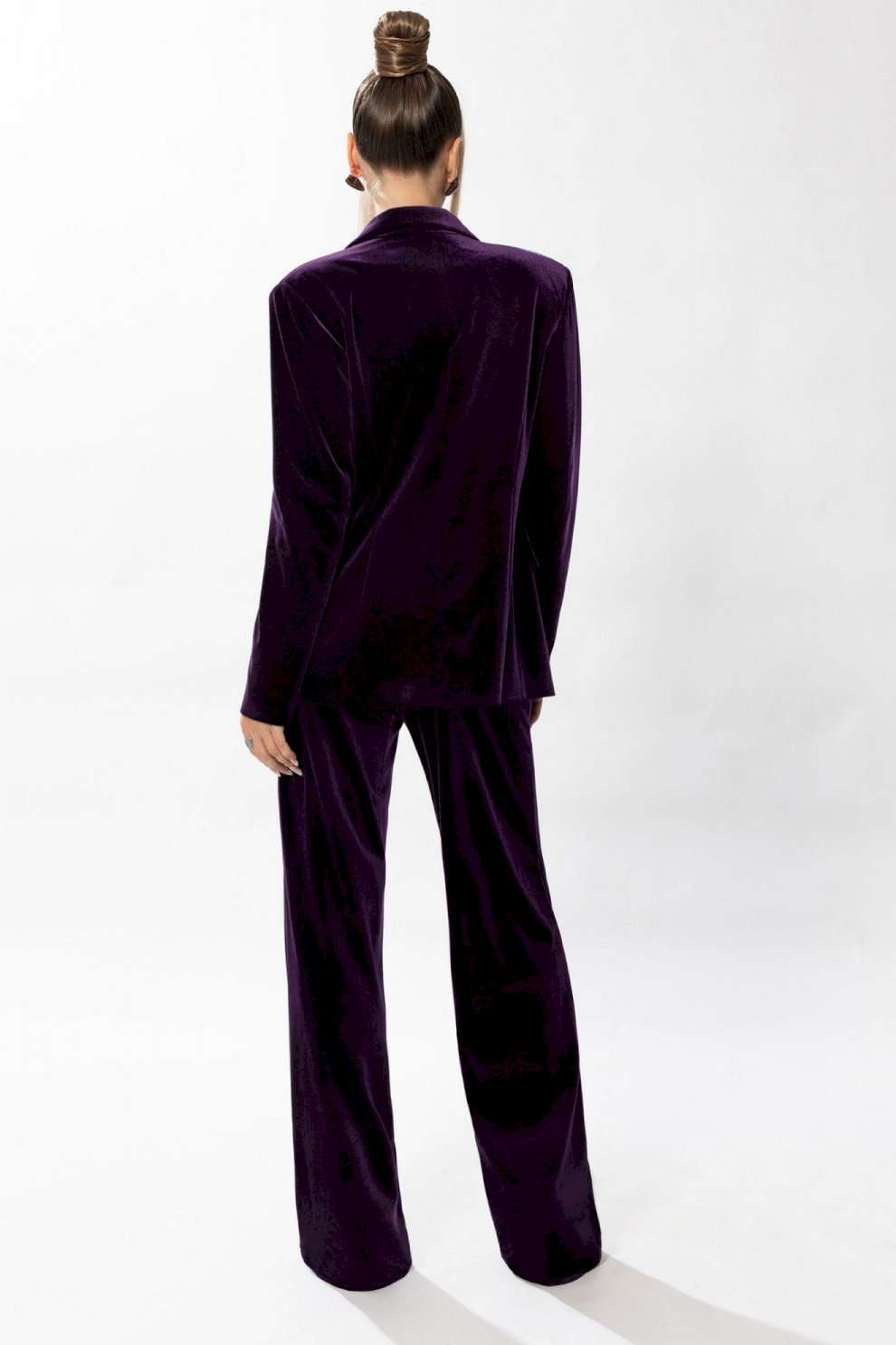 Жакет прямого силуэта с центральной двубортной застежкой на петли и пуговицы, с втачным воротником и отложными лацканами пиджачного типа. По переду с рельефами, выходящими из проймы. На уровне линии талии расположены настрочные клапаны. Спинка со средним швом, рельефами, выходящими из проймы. Рукав втачной, длинный. Брюки прямые, с отрезным поясом. По спинке и частично по переду пояс присборен на резинку.