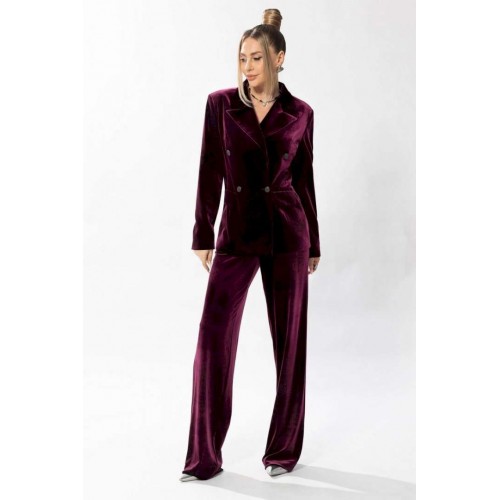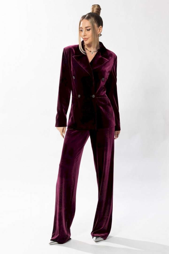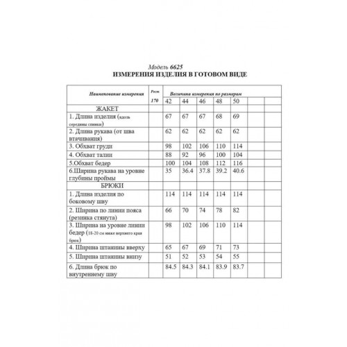 Жакет прямого силуэта с центральной двубортной застежкой на петли и пуговицы, с втачным воротником и отложными лацканами пиджачного типа. По переду с рельефами, выходящими из проймы. На уровне линии талии расположены настрочные клапаны. Спинка со средним швом, рельефами, выходящими из проймы. Рукав втачной, длинный. Брюки прямые, с отрезным поясом. По спинке и частично по переду пояс присборен на резинку.