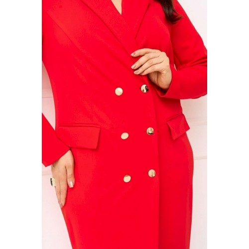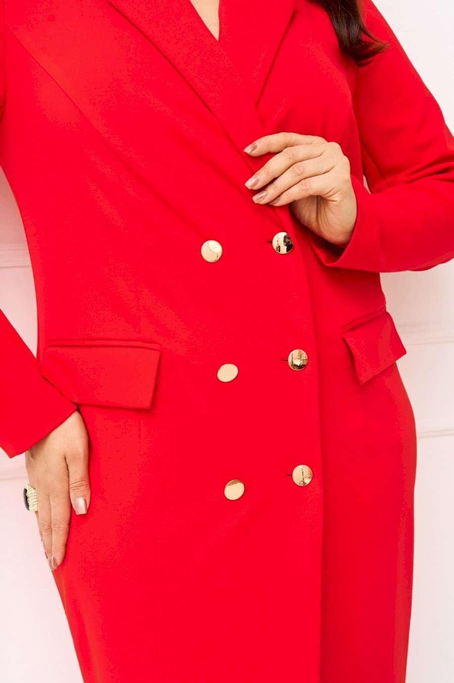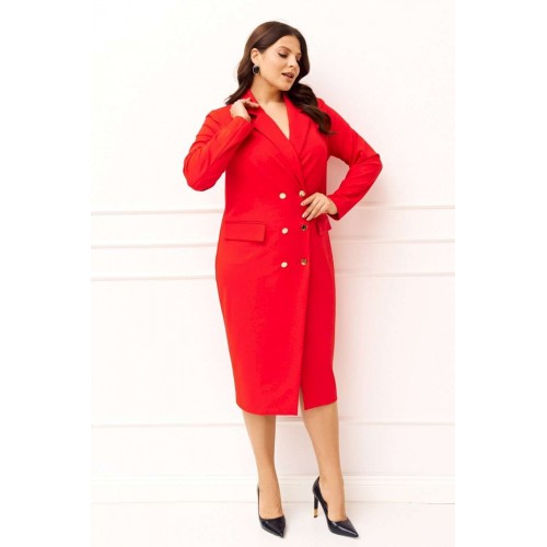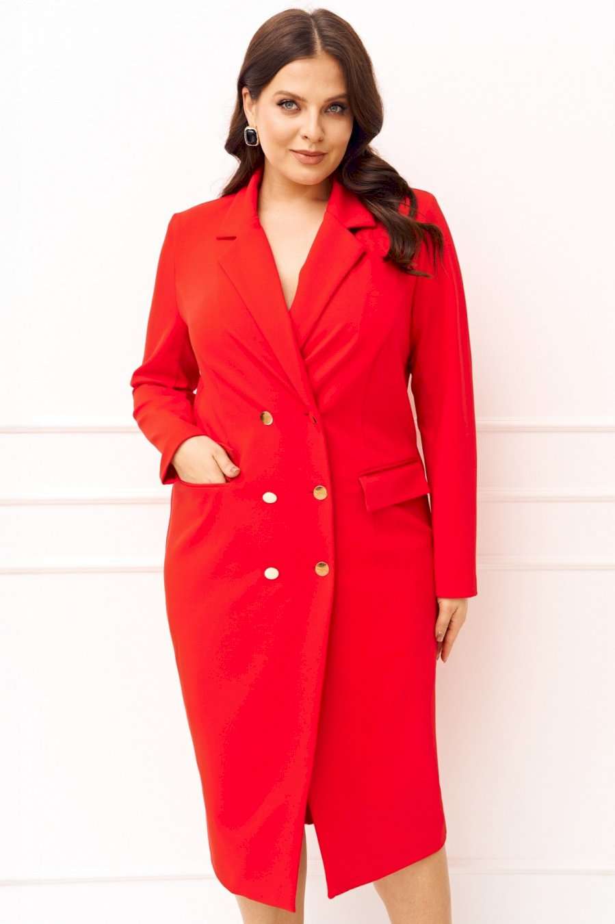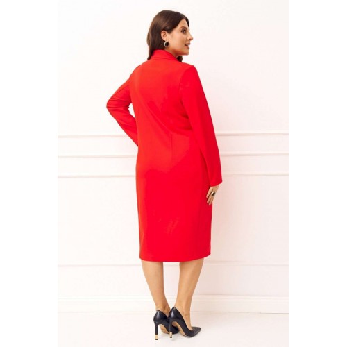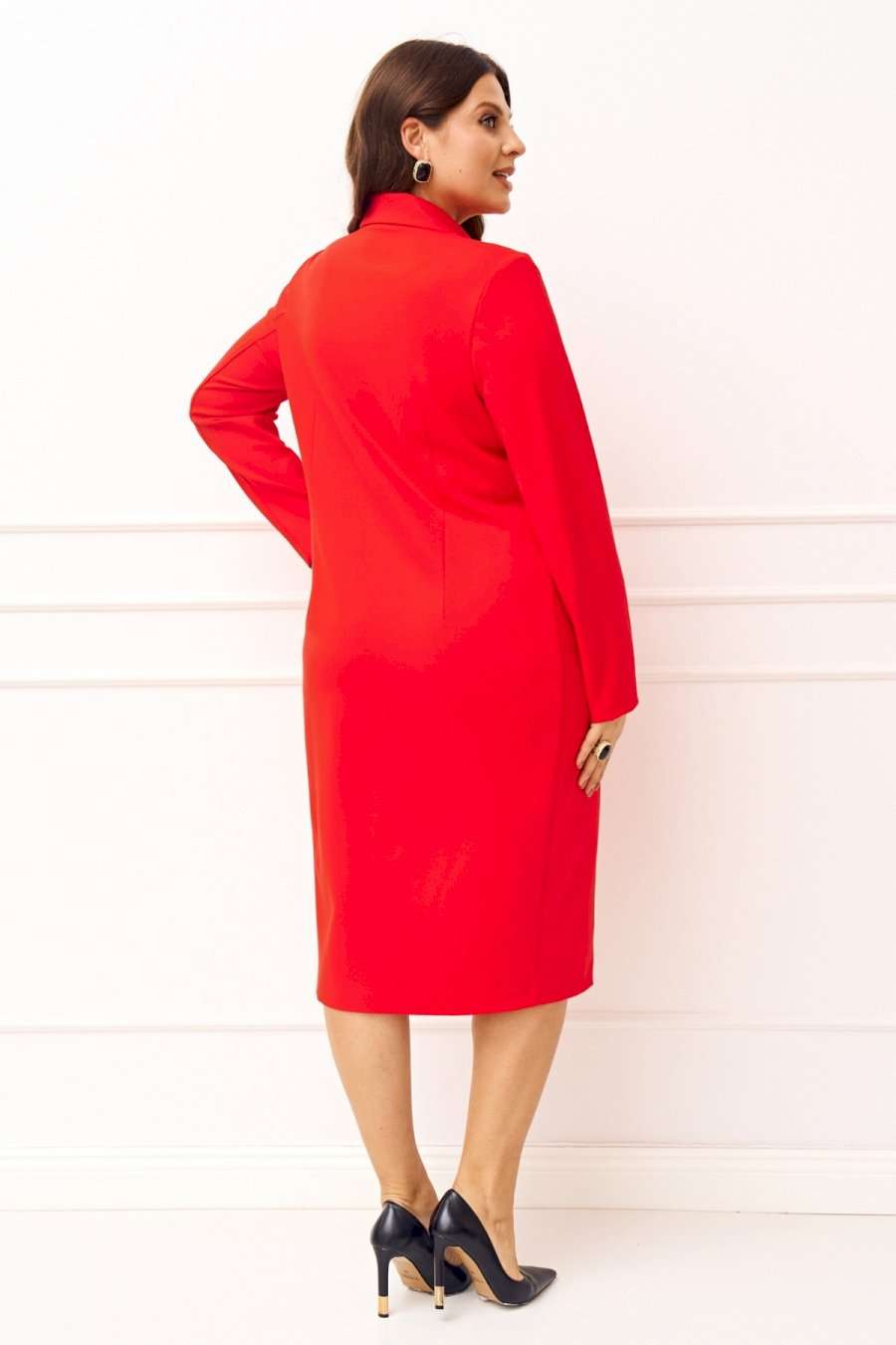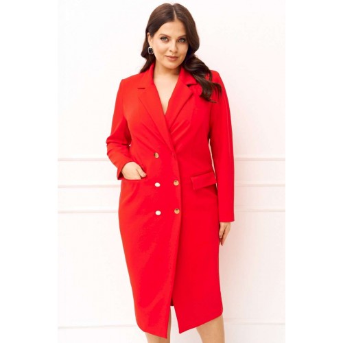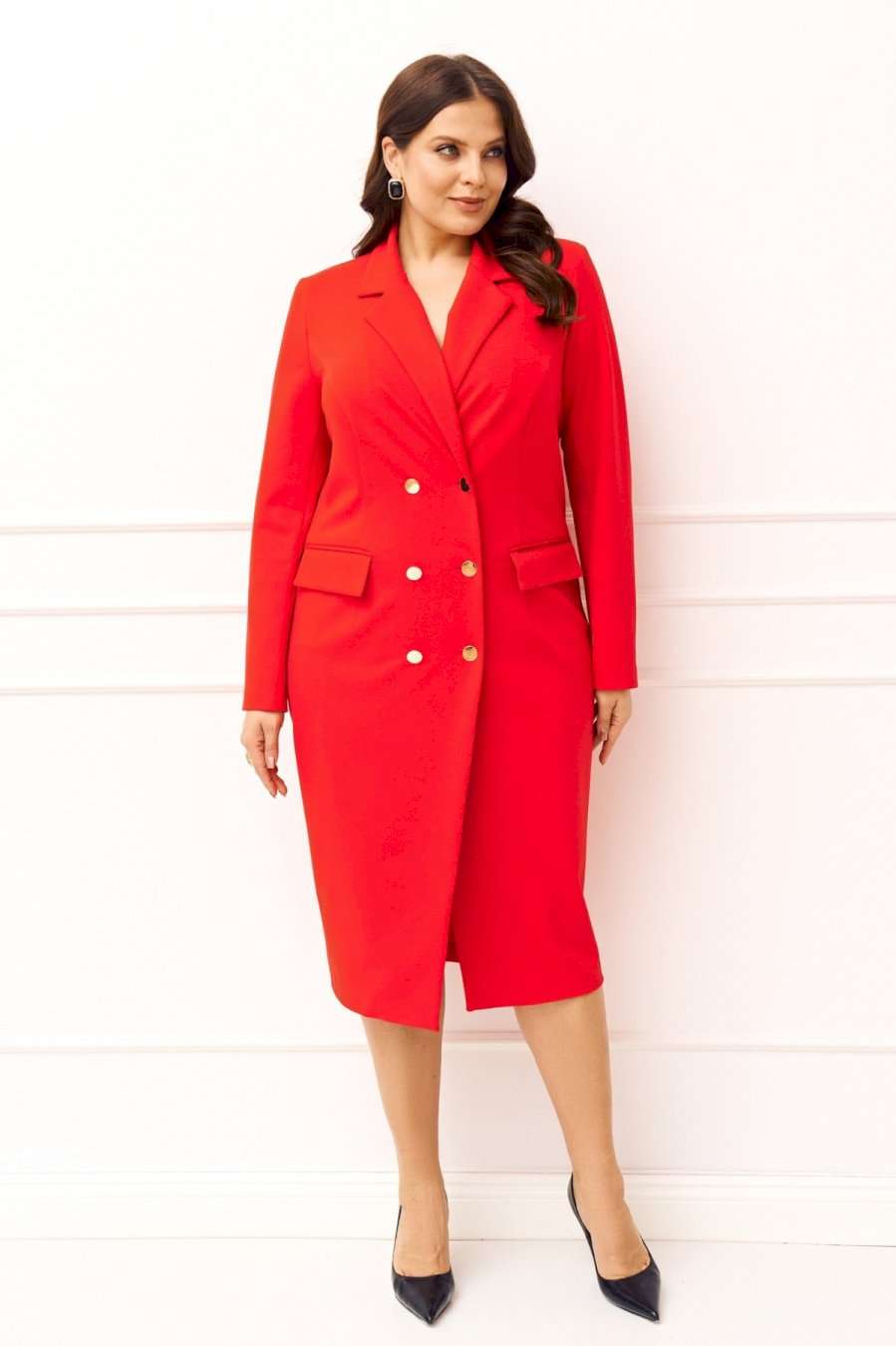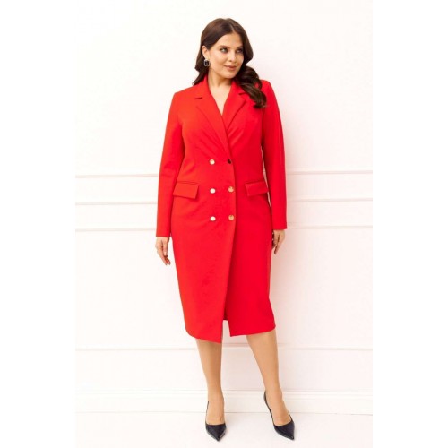 Платье-халат полуприлегающего силуэта выполнено из трикотажного полотна средней плотности, без подкладки; по переду функциональные прорезные карманы; рукава втачные; воротник отложной, застежка двубортная на петли и пуговицы. Длина платья 111 см. Длина рукава 60 см.
