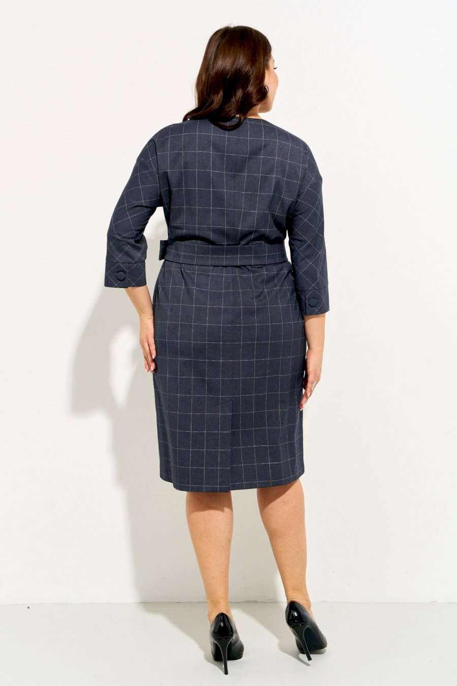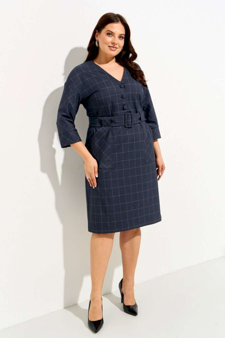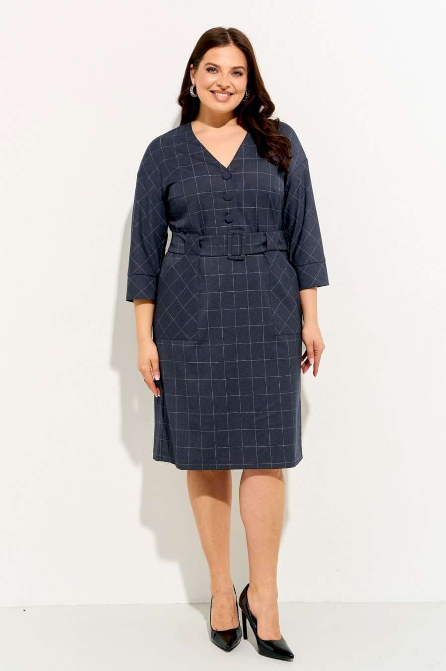 Женское платье полуприлегающего силуэта выполнено из плательной ткани \"в клетку\". Изделие с горловиной V-образной формы застегивается на петли и пуговицы и имеет рукава со спущенной линией плеча и манжентой по низу. По переду платья находятся накладные функциональные карманы, переходящие в шлевку, которая держит пояс. В комлекте съемный пояс из основной ткани. Платье полностью соотвествует заявленному размеру. Пожалуйста, пользуйтесь таблицей обмеров готового изделия. Уход за плательной тканью: - стирать при температуре не выше 30 градусов при бережном режиме или ручной стирке.