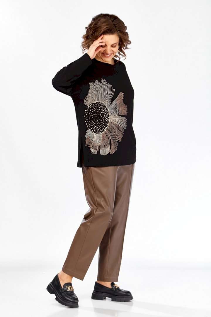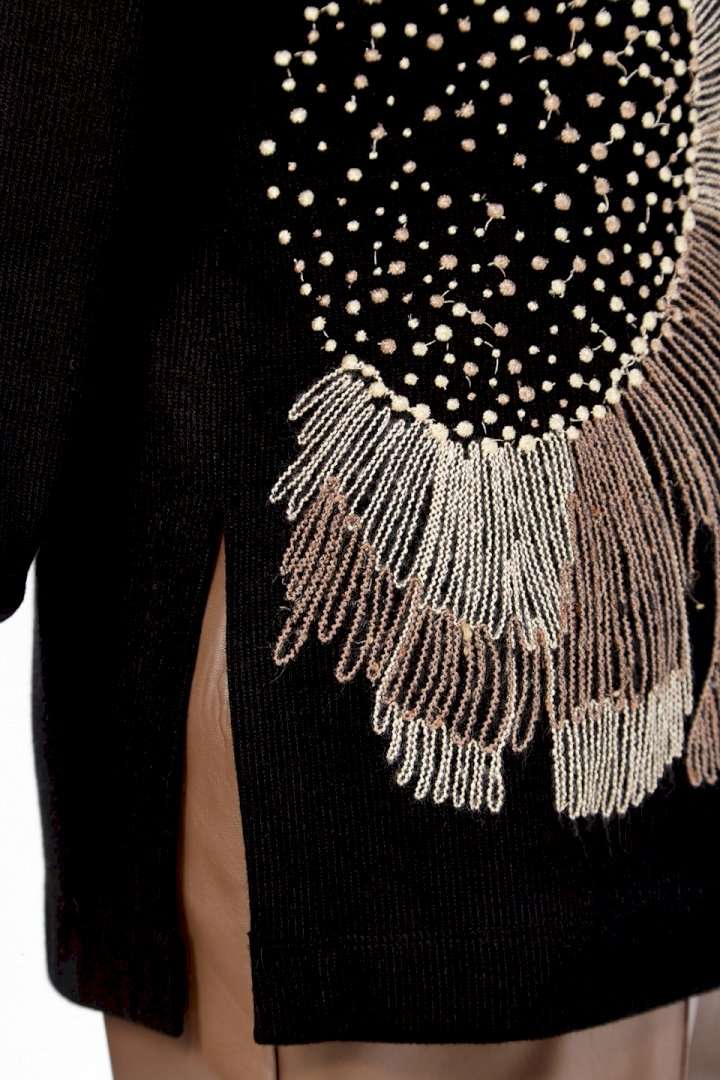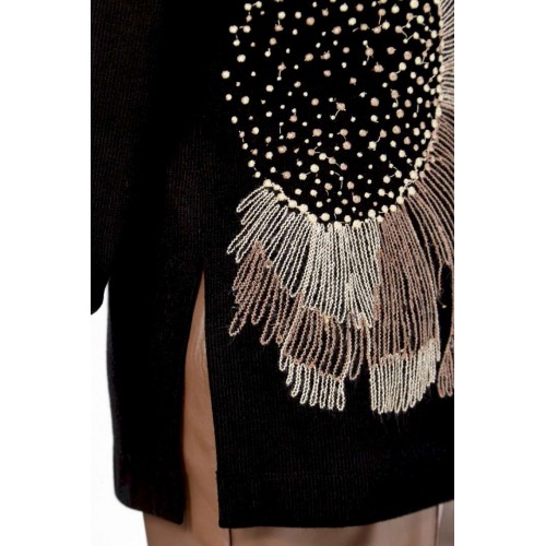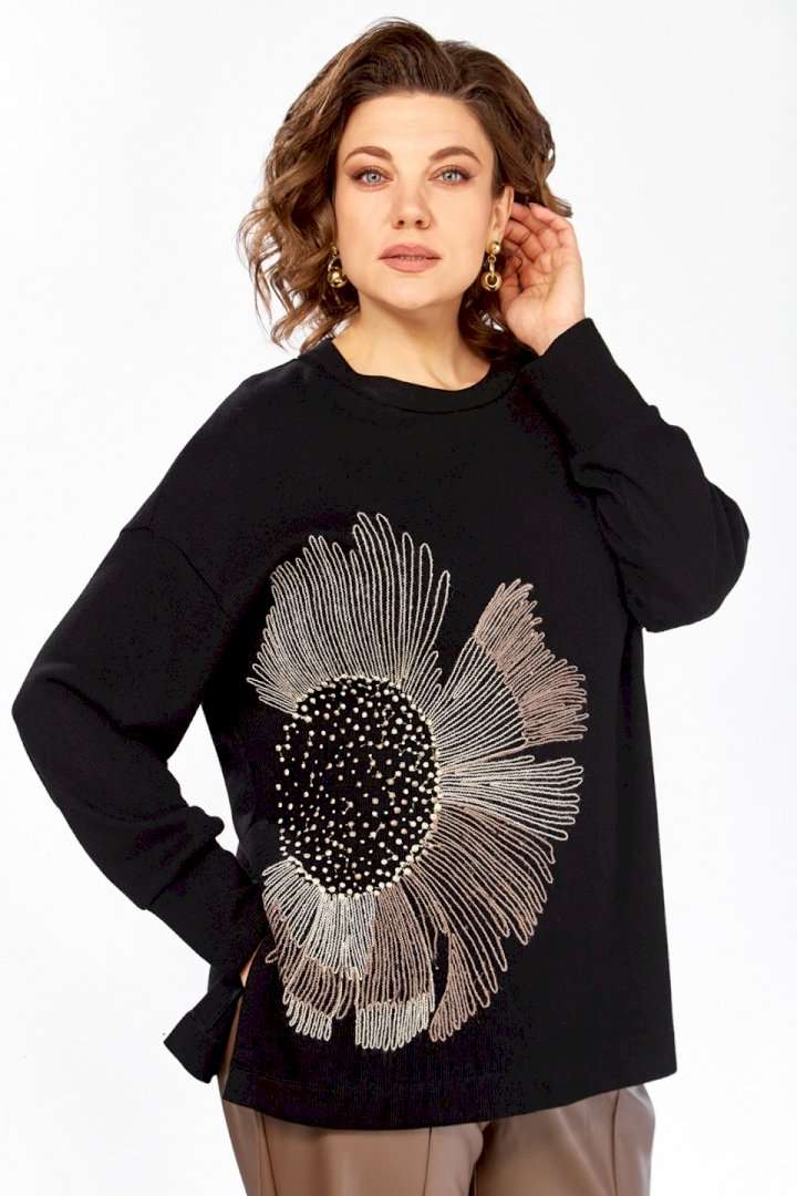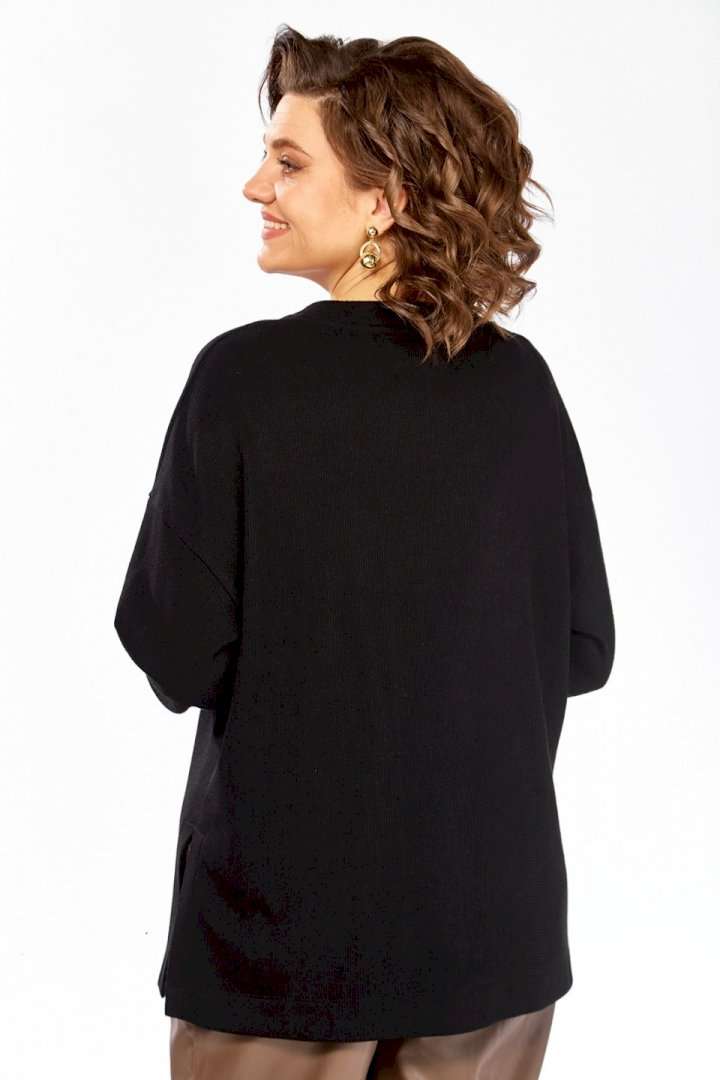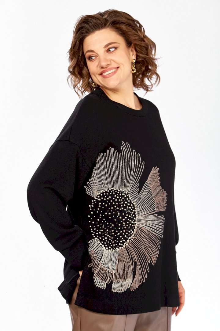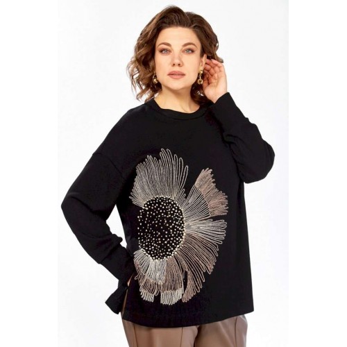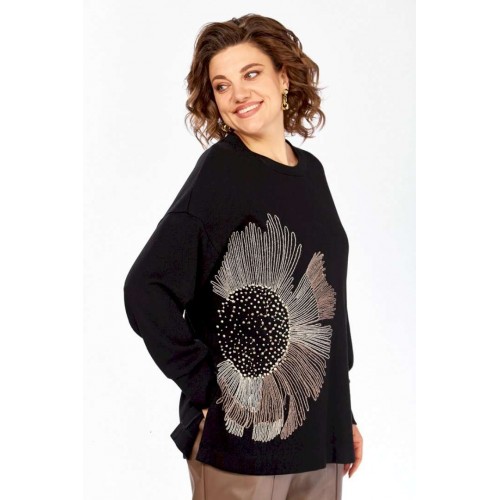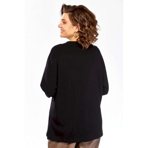 Джемпер женский из трикотажного полотна черного цвета. Модель свободного кроя с круглым вырезом горловины и цельнокроенной спинкой. Особенностью данной модели является наличие элегантной вышивки на передней части. Рукава длинные, спущеные, с аккуратными манжетами на нижнем крае. В боковых швах выполнены небольшие разрезы для большего комфорта. Изделие представлено в нескольких размерах: 52 - ПОГ 62 см, ПОБ 60 см; 54 - ПОГ 64 см, ПОБ 62 см; 56 - ПОГ 66 см, ПОБ 64 см; 58 - ПОГ 68 см, ПОБ 66 см. Длина джемпера по спинке составляет 69 см, длина от плеча до нижнего края рукава — 73 см. Обратите внимание, что фактический цвет изделия может незначительно отличаться от цвета, представленного на экране.
