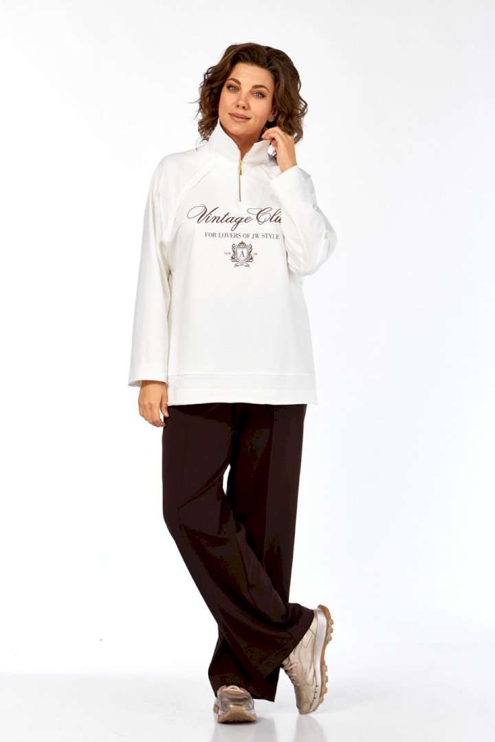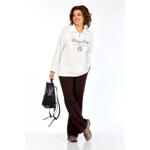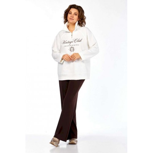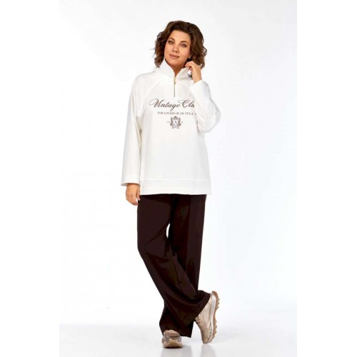 Комплект брючный двухпредметный, состоит из джемпера и брюк. Джемпер свободного силуэта изготовлен из хлопкового полотна, с воротником стойка на молнии. Перед и спинка в области бедер с декоративным подрезом. Рукава — реглан. Низ изделия,низ рукавов и швы втачивания рукавов выполнены необработанным срезом. Джемпер дополнен дизайнерской печатью. Брюки прямого силуэта с притачным поясом на эластичной тесьме. В передних деталях брюк обработаны боковые карманы и застрочены канты. Обращаем Ваше внимание, что цвет на экране может отличаться от реального.