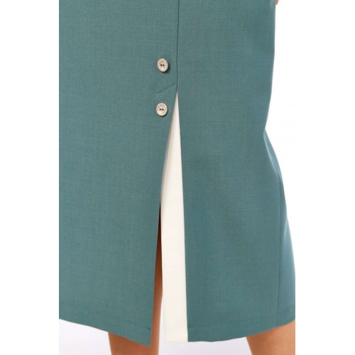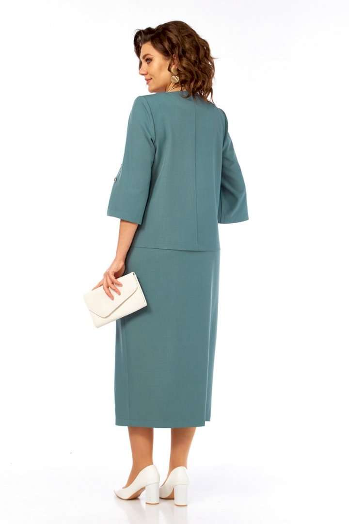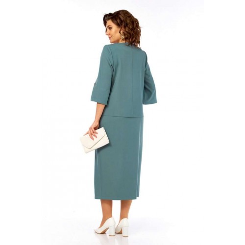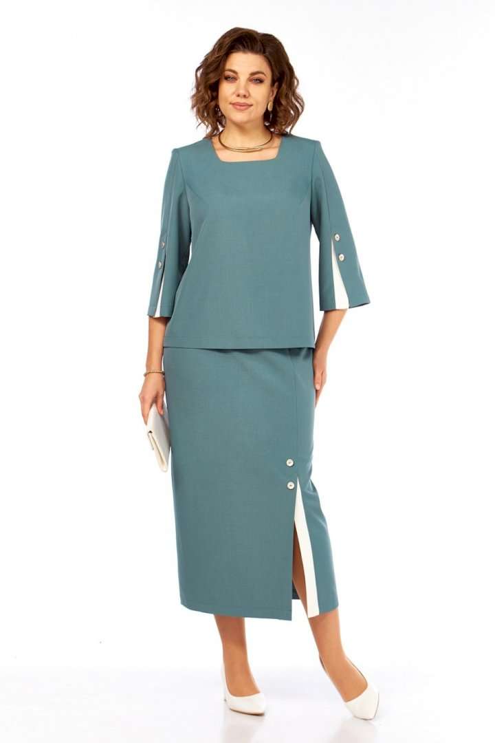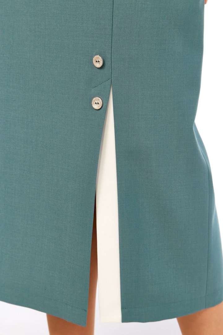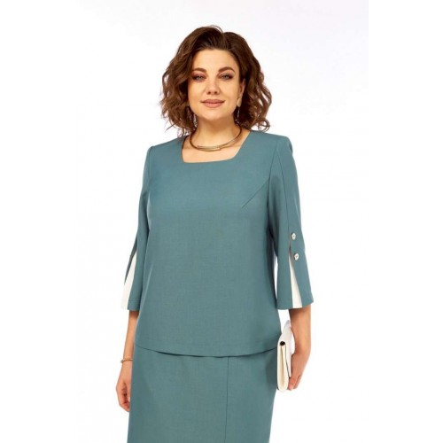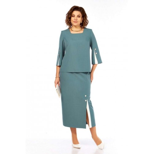 Костюм женский двухпредметный, состоит из блузы и юбки, выполнен из ткани костюмно-плательного ассортимента. Блуза прямого силуэта. Горловина фигурной формы. Перед с нагрудными вытачками. Спинка со средним швом. Рукава втачные, в них обработаны шлицы с декоративным элементом. Юбка прямого силуэта, верхний срез обработан обтачкой, в боковом потайная молния. По переду обработан ассиметричный рельеф в котором находится декоративная шлица. Юбка на подкладке. Обращаем Ваше внимание, что цвет на экране может отличаться от реального.