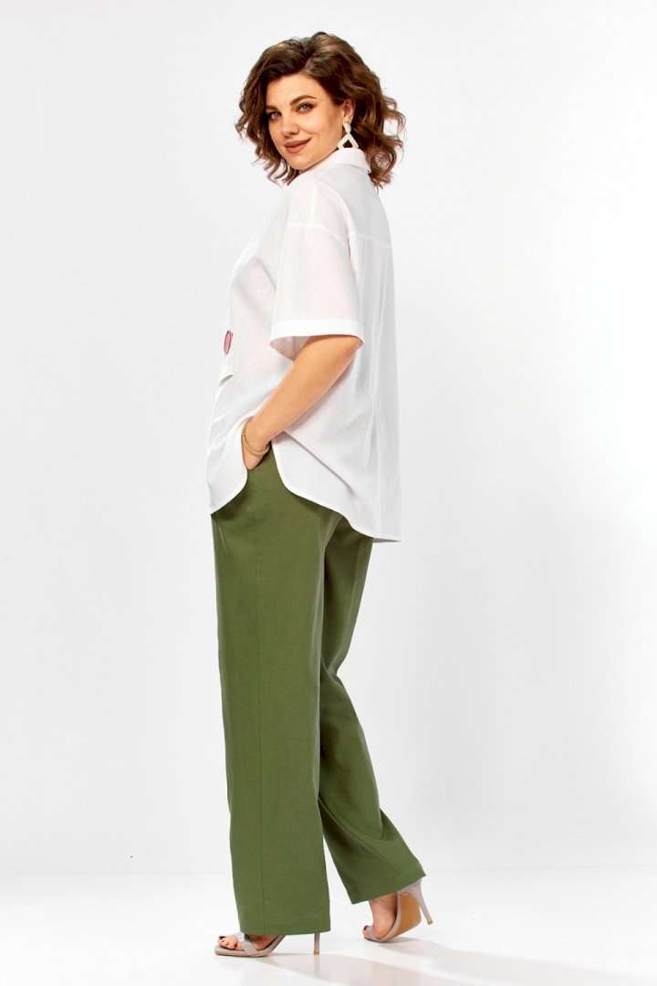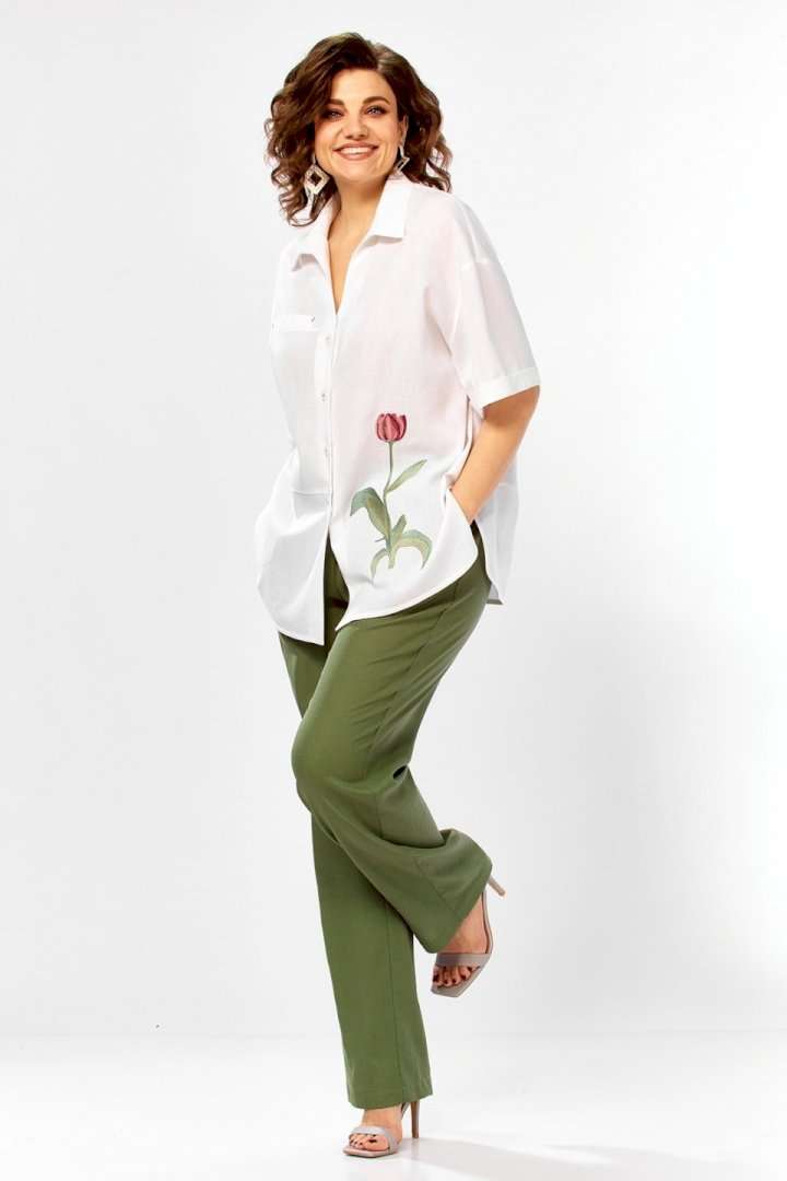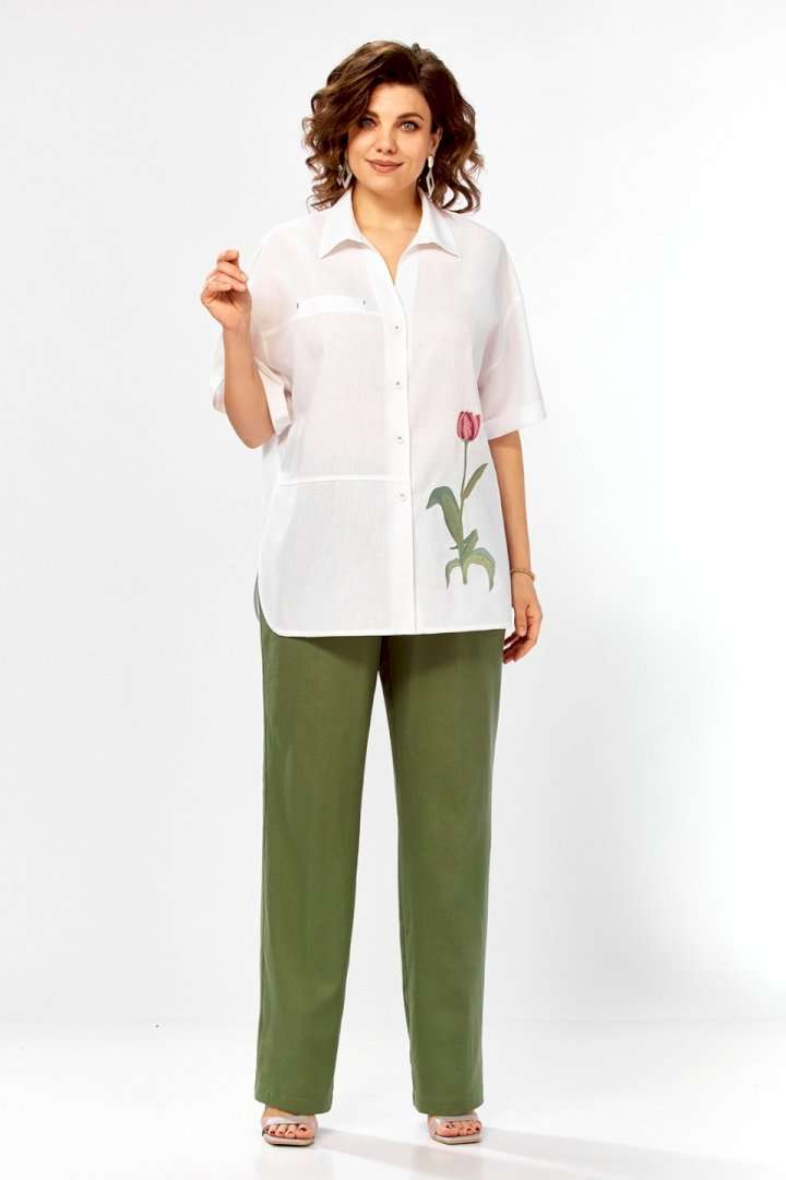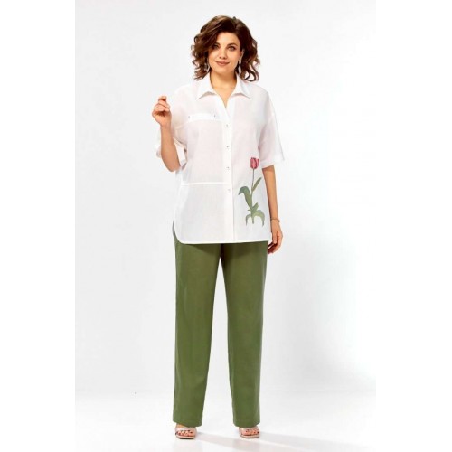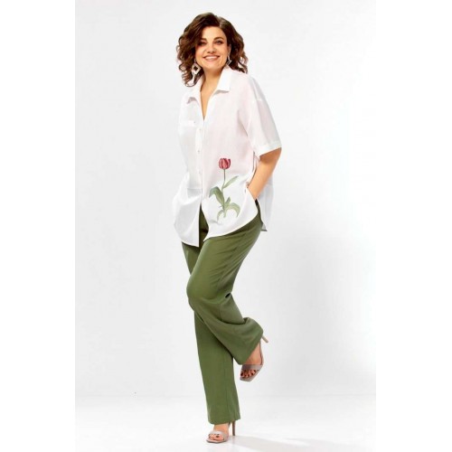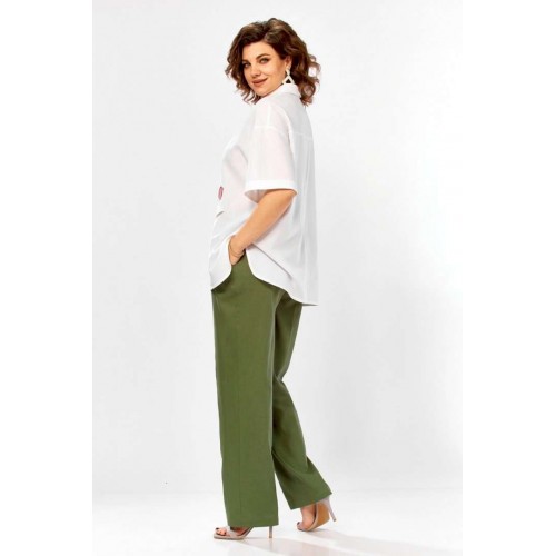 Костюм брючный 3498 Jurimex воплощает летнюю легкость и комфорт в коллекции бренда Jurimex. Изготовленный из натурального льна и хлопка, этот костюм предлагает воздухопроницаемость и легкость. Свободная блузка, украшенная дизайнерской вышивкой, имеет V-образный вырез и отложной воротник. Ее асимметричный крой и центральная застежка на пуговицах добавляют оригинальности. Декоративный элемент и фигурный низ создают уникальный стиль. Брюки прямого фасона идеально подходят для легких летних прогулок. Зеленые брюки и белая блузка придают костюму свежесть. Длина блузки по спинке составляет 71 см, а длина плеча и рукава — 45 см, что обеспечивает комфорт и свободу движений. Длина брюк по боковому шву — 109 см, что идеально подходит для разных типов фигуры. Этот костюм станет отличным выбором для летнего гардероба, предлагая стильный и практичный дизайн.