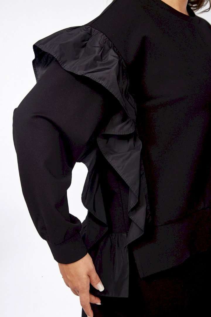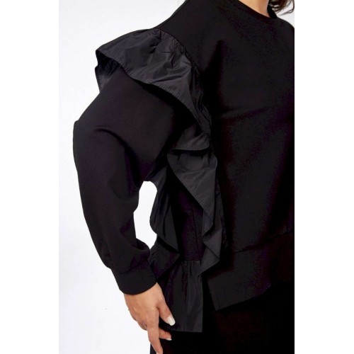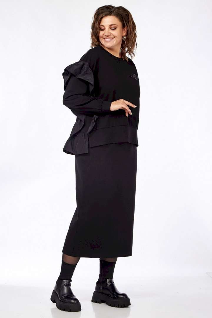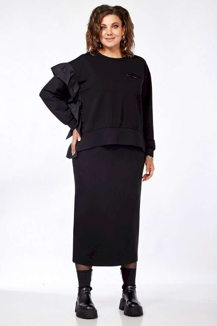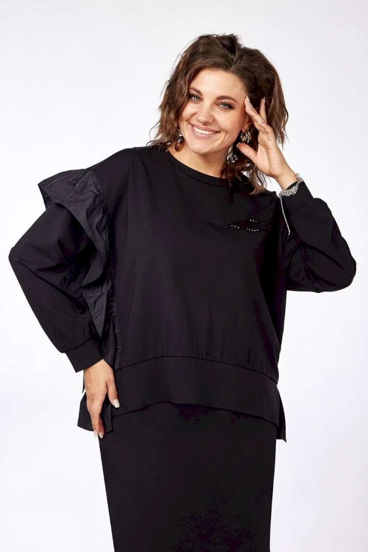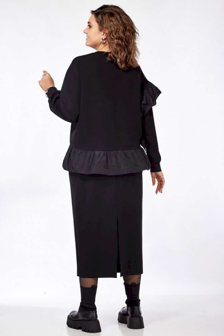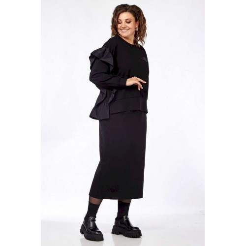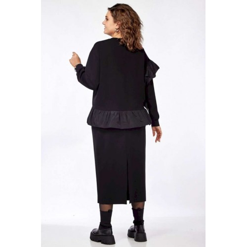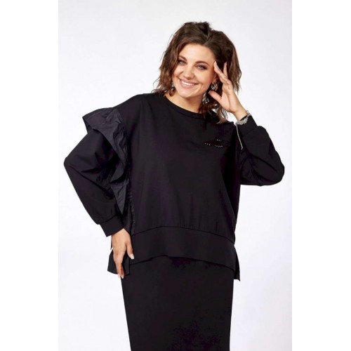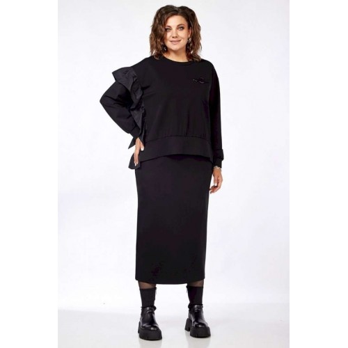 Костюм женский юбочный, изготовлен из трикотажного полотна. Джемпер свободного кроя, Горловина круглой формы. Рукав спущенный. Декоративными элементами являются рюша из отделочной ткани и печать, декорирована стразами. Низ рукавов на манжетах. Спинка длиннее переда, по низу спинки притачная рюша из отделочной ткани. Юбка зауженная, на подкладке, пояс на резинке. Сзади средний шов и разрез внизу. Обращаем Ваше внимание, что цвет на экране может отличаться от реального.