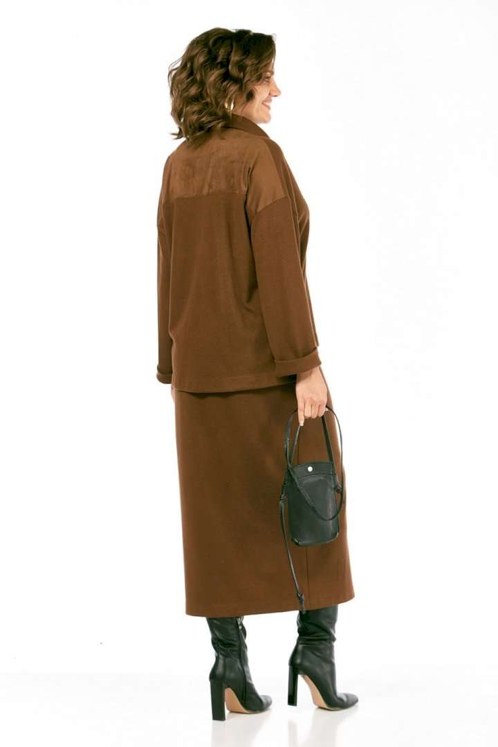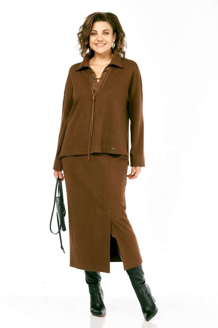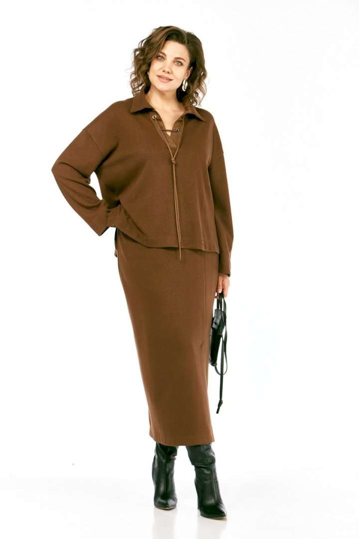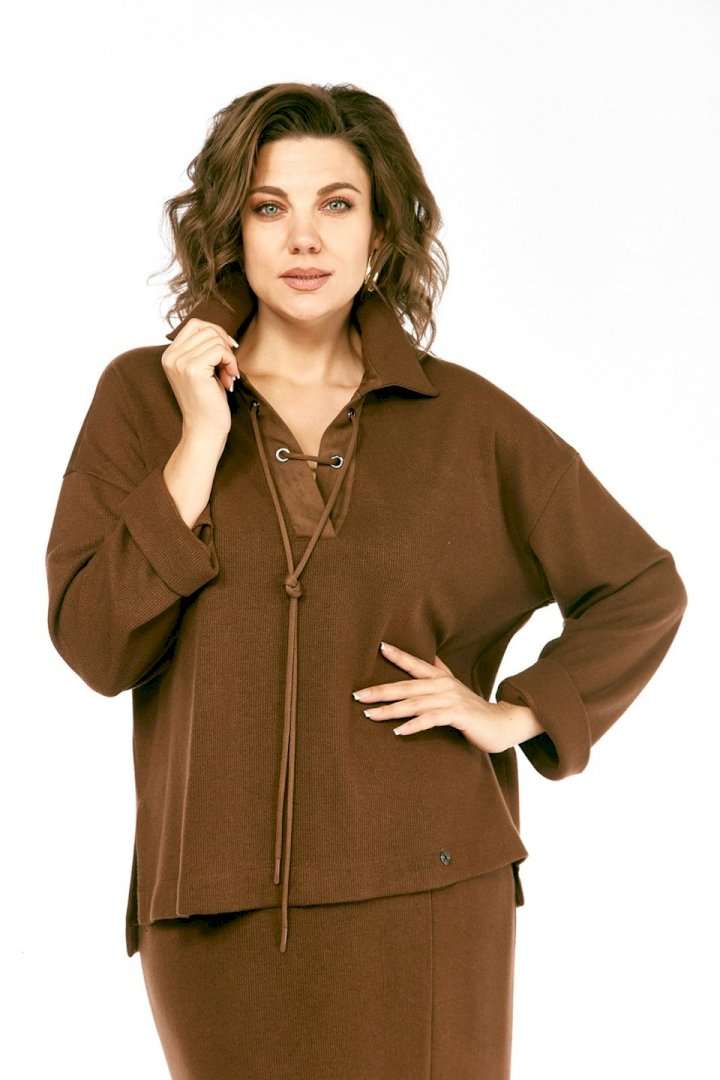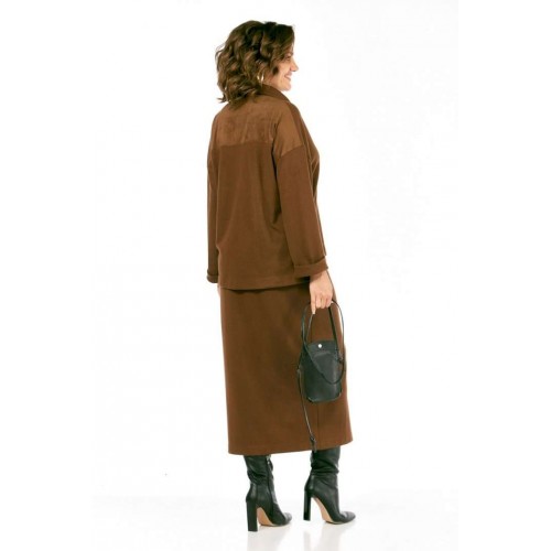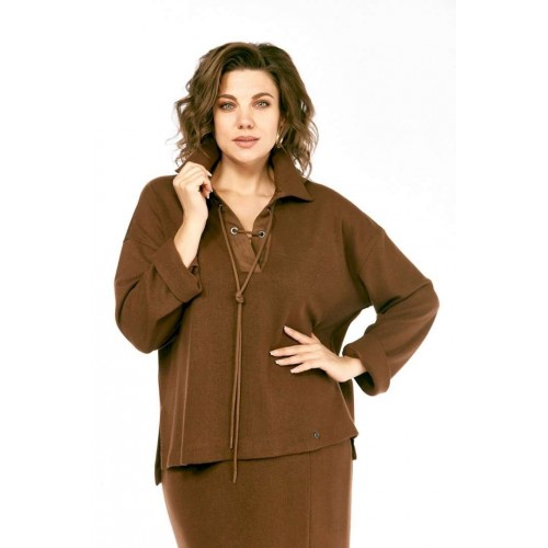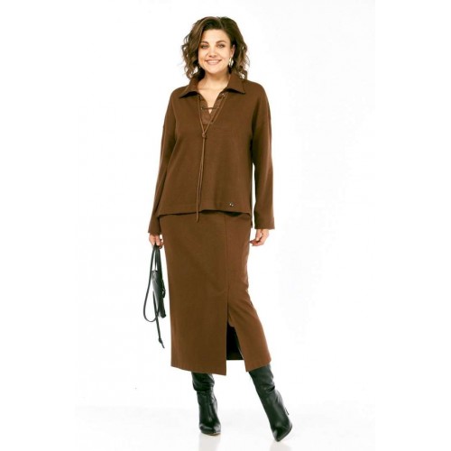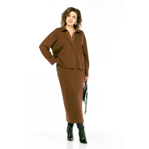 Костюм женский, юбочный, изготовлен из трикотажного полотна, состоит из джемпера и юбки. Джемпер свободного кроя. Горловина оформлена отложным воротником на стойке и планками, декорированными люверсами, с протянутым в них шнуром. Рукава спущенные, длинные. Низ изделия разной длины, в боковых швах разрезы. Кокетка спинки, планки и воротник джемпера выполнены из отделочной ткани. Юбка с цельнокроенным поясом на резинке. На передней части шов, внизу обработана шлица. Юбка на подкладке. Обращаем Ваше внимание, что цвет на экране может отличаться от реального.