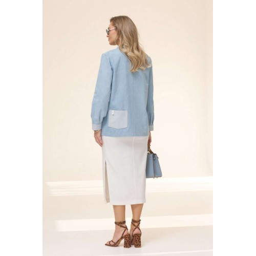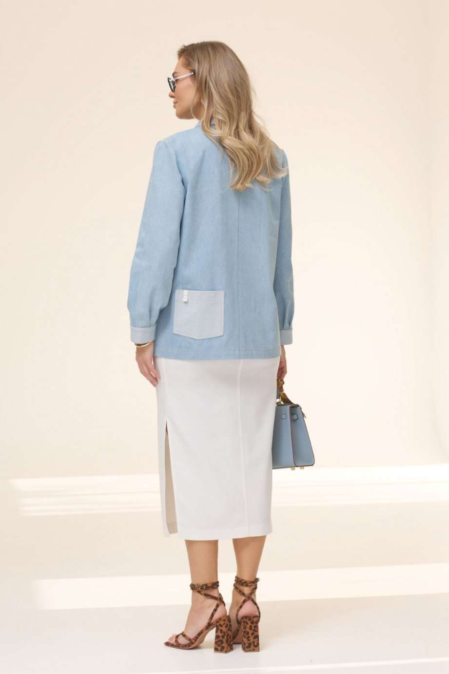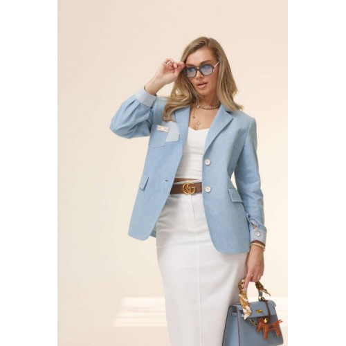Жакет женский, прямого силуэта с центральной бортовой застежкой на петли и пуговицы. По переду обработаны вытачки, рельефы, прорезные карманы с клапаном и листочкой. Справа, в области груди, расположены 2 накладных кармана, декорированных нашивкой. Спинка со средним швом и накладным карманом слева, на котором расположена нашивка. Плечо спущено. Рукав втачной двухшовный, длинный. По низу обработан притачной манжетой, застегивающейся на петлю и пуговицу. Горловина обработана воротником пиджачного типа с отрезной стойкой. . Декоративные элементы и фурнитура могут отличаться от заявленных на фото. Цвет материала может отличаться по тону в зависимости от настроек вашего монитора! Длина жакета по спинке 69 см. Длина рукава 61 см.