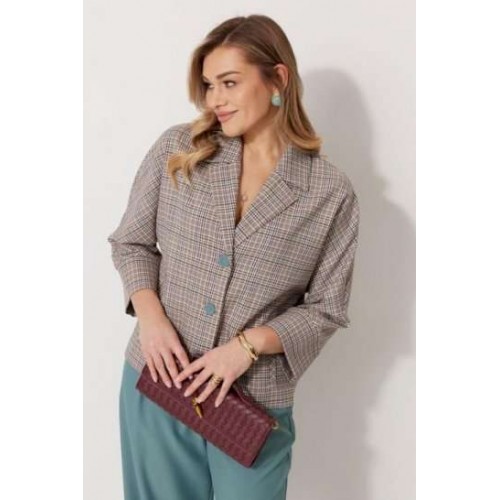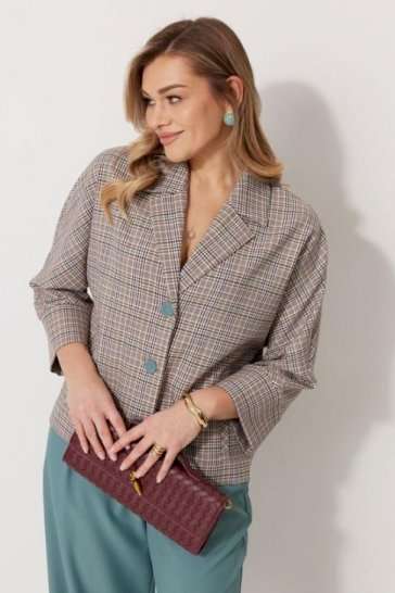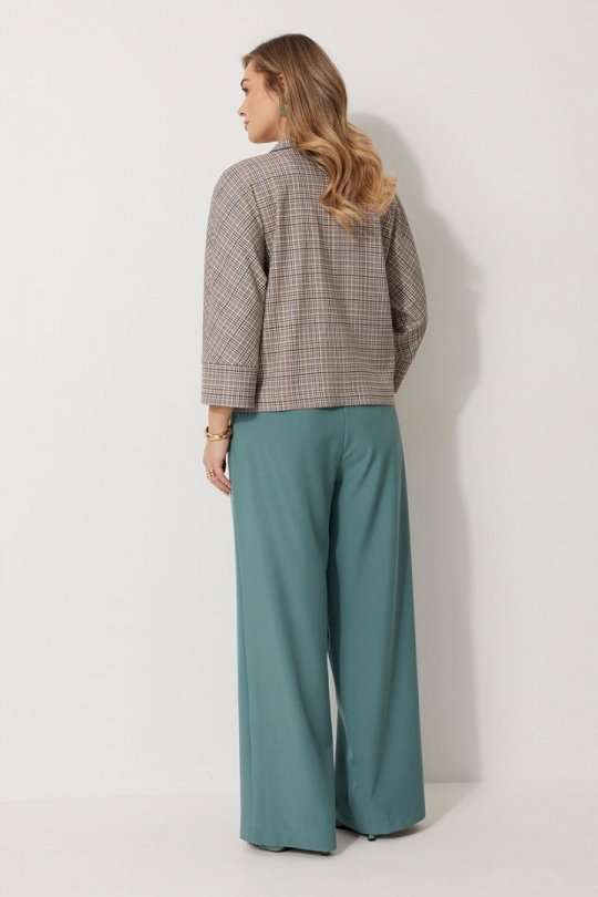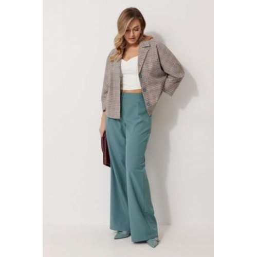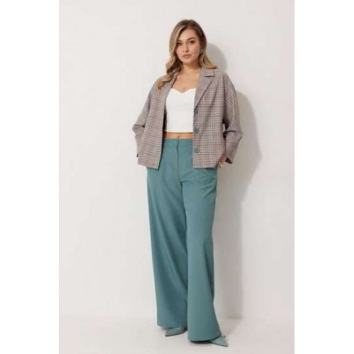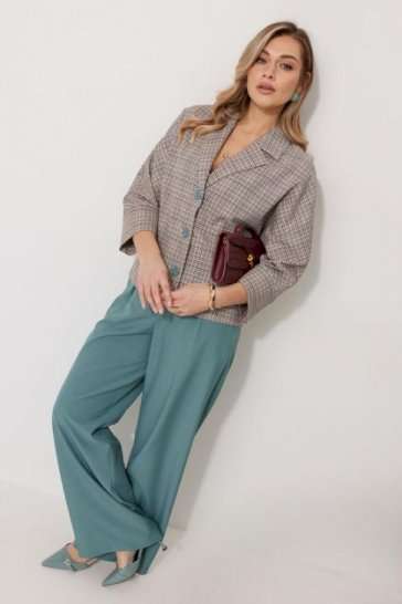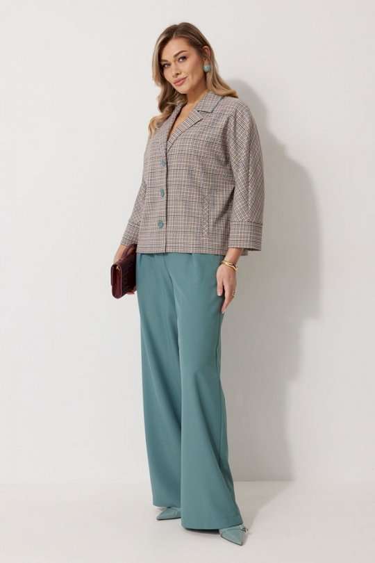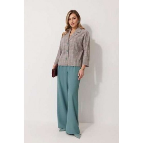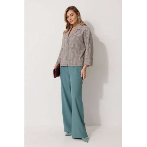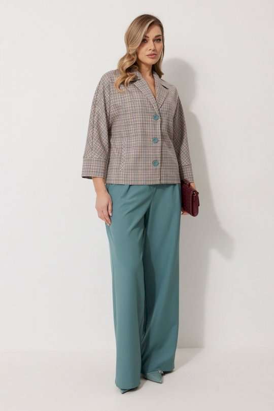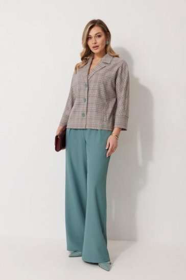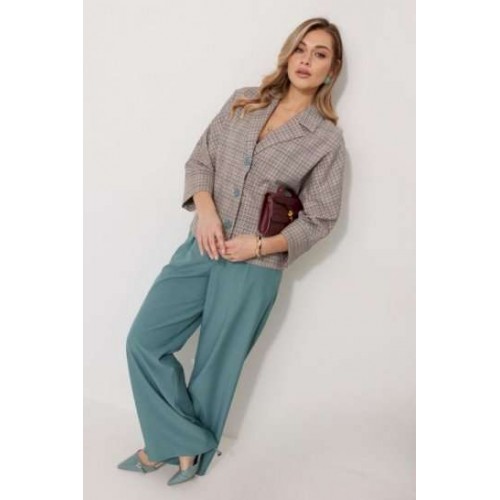 Костюм женский, состоящий из жакета и брюк. Жакет без подкладки, кроя «летучая мышь», с центральной однобортной застежкой на петли и пуговицы. По переду обработаны вертикальные прорезные карманы с листочкой. Спинка цельнокроеная. Горловина V-образной формы, обработана воротником пиджачного типа с контрастным кантом. Рукав 7/8, по низу обработан широкой притачной манжетой. Брюки женские, прямого силуэта. По переду заложены складки и обработана застежка на молнию. Карманы расположены в боковом шве. На задних половинках брюк застрочены вытачки. Верх обработан широким притачным поясом (частично на резинке), застегивающимся на петлю и пуговицу. Длина спинки жакета 60 см, длина рукава 66 см, длина брюк по боковому шву 82 см.