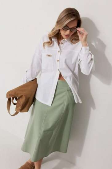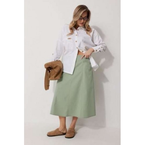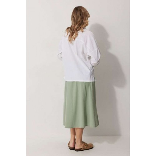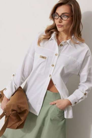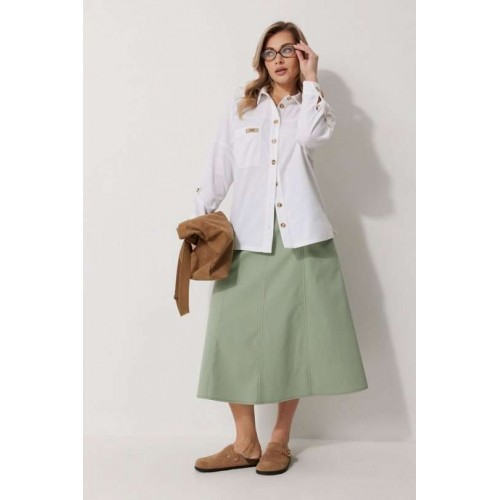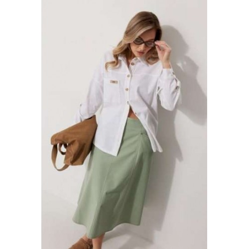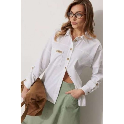 Блузка женская с рукавом и спущенной линией плеча длиной за линию бедра. По переду блузки обработана отрезная кокетка. Накладной карман расположен правой части полочки с декоративным элементом. По спинке блузки обработана отрезная кокетка. Рукав втачной рубашечный одношовный. Низ рукава со складкой, обработан притачной разъемной манжетой, застегивающаяся на петлю и пуговицу. В разрезе рукава пришита пата, застегивающаяся на пуговицу. Перед блузки обработан отрезными планками, застегивающимися на петли и декоративные пуговицы. Горловина обработана рубашечным воротником со стойкой. Подгибка низа блузки 1,5 см. По боковым швам блузки обработаны разрезы. Длина спинки изделия 62 см, длина руква от горловины 75 см.