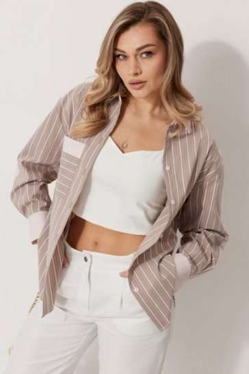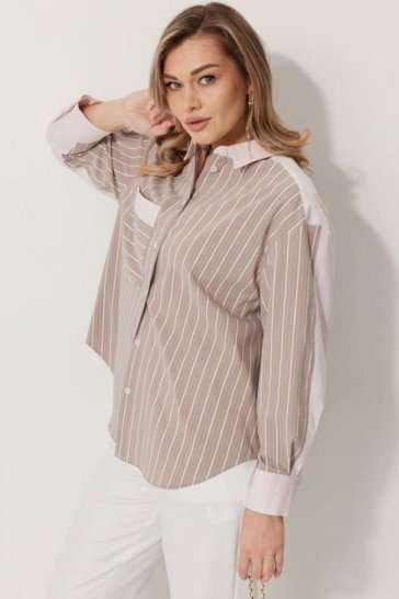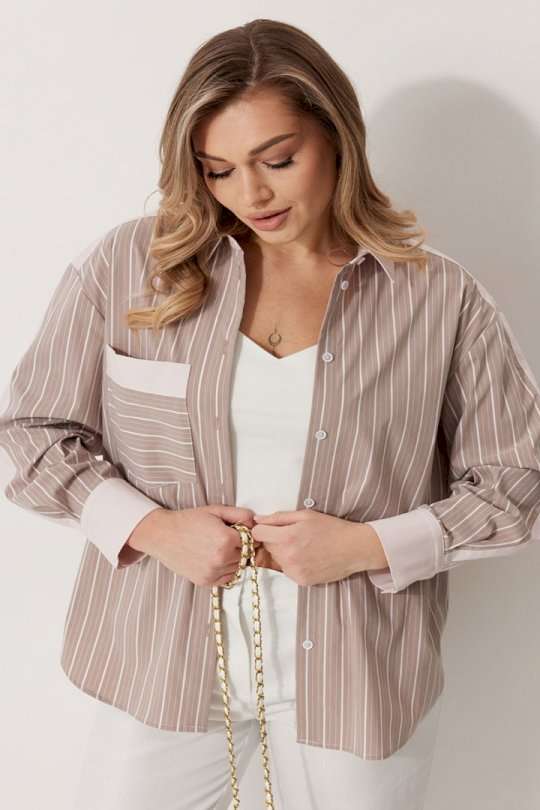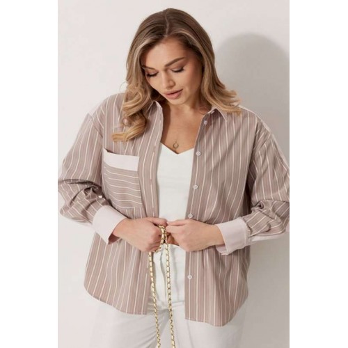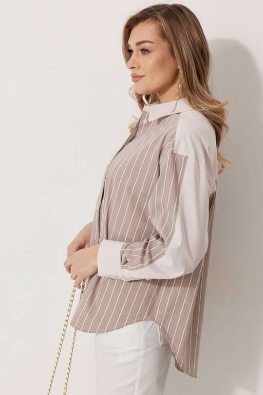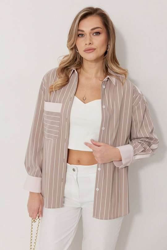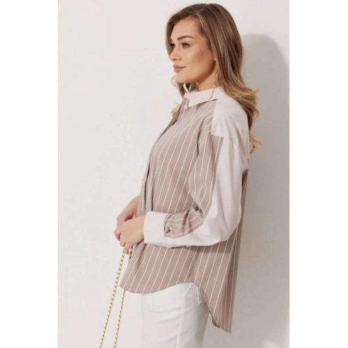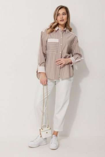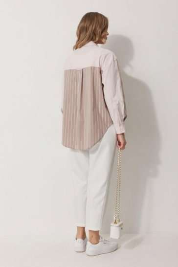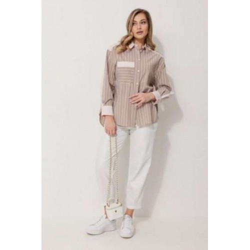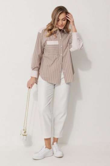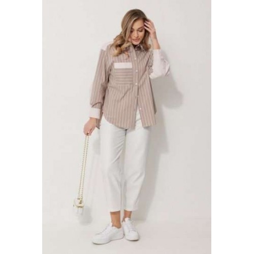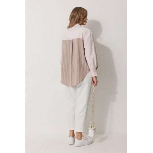 Блузка женская прямого силуэта. Полочки из ткани в полоску. На правой полочке настрочен накладной карман с комбинацией тканей. Перед обработан цельнокроеными планками с центральной застежкой на петли и пуговицы. Спинка из ткани в полоски с кокеткой из ткани компаньона. По верхней части спинки заложена бантовая складка. Плечо спущено. Рукав длинный, двухшовный. Одна часть рукава из ткани в полоску, другая из ткани компаньона. Рукав по низу со складкой, обработан широкой притачной манжетой застегивающейся на петли и пуговицы. Разрез рукава обработан притачными отрезными планками. Манжета и притачные планки из ткани компаньона. Низ разноуровневый, закругленной формы. Горловина обработана воротником рубашечного типа с отрезной стойкой из ткани компаньона. Длина спинки изделия 77 см, длина руква от горловины 74 см.