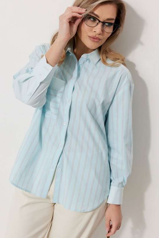 Блузка женская прямого силуэта. Полочки из ткани в полоску. На правой полочке настрочен накладной карман с комбинацией тканей. Перед обработан цельнокроеными планками с центральной застежкой на петли и пуговицы. Спинка из ткани в полоски с кокеткой из ткани компаньона. По верхней части спинки заложена бантовая складка. Плечо спущено. Рукав длинный, двухшовный. Одна часть рукава из ткани в полоску, другая из ткани компаньона. Рукав по низу со складкой, обработан широкой притачной манжетой застегивающейся на петли и пуговицы. Разрез рукава обработан притачными отрезными планками. Манжета и притачные планки из ткани компаньона. Низ разноуровневый, закругленной формы. Горловина обработана воротником рубашечного типа с отрезной стойкой из ткани компаньона. Длина спинки изделия 77 см, длина руква от горловины 74 см.