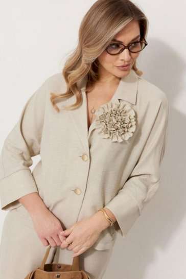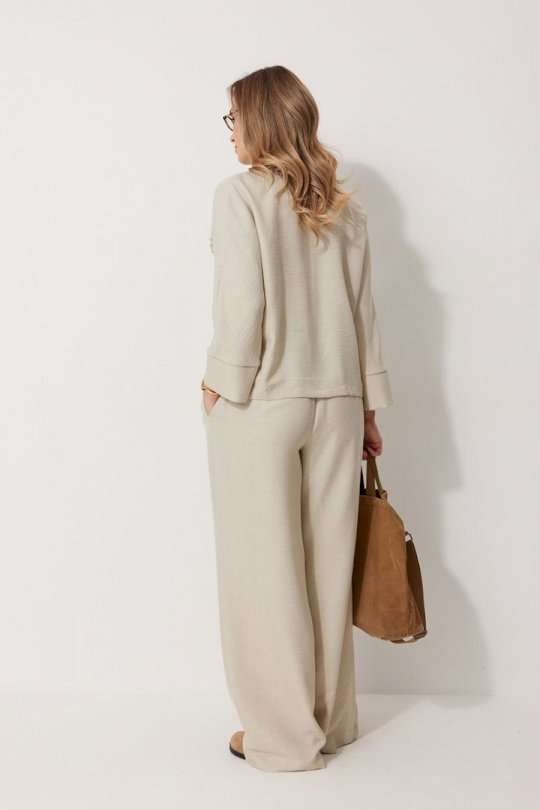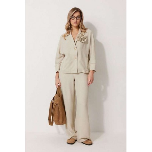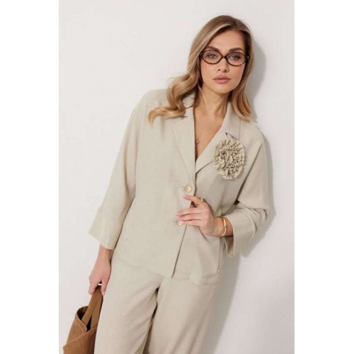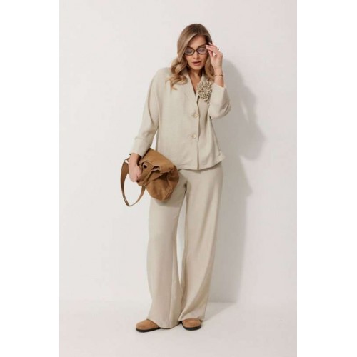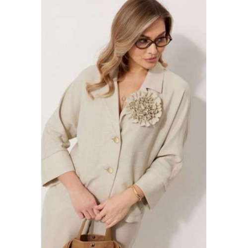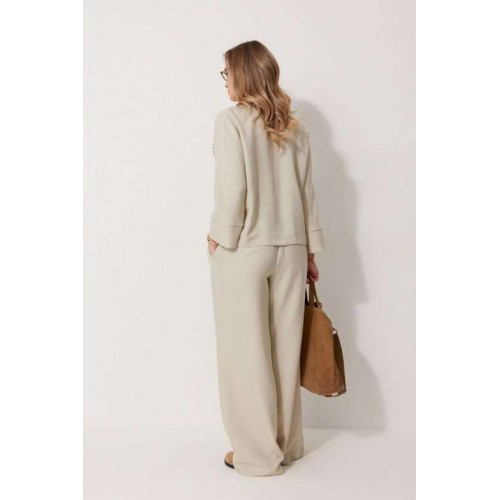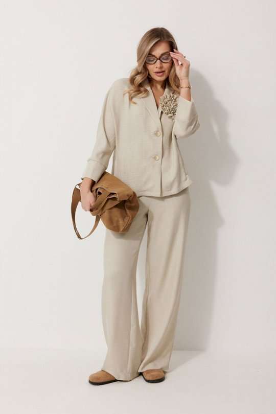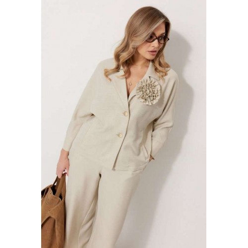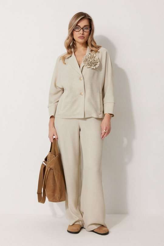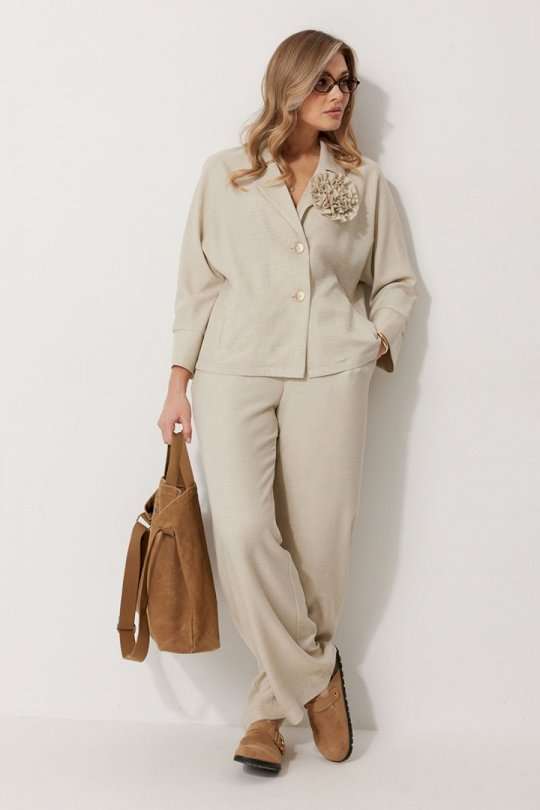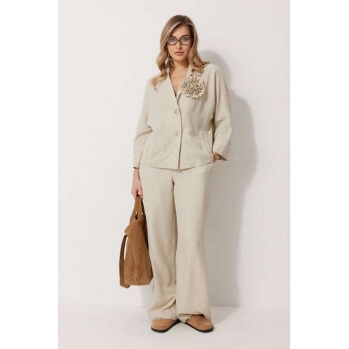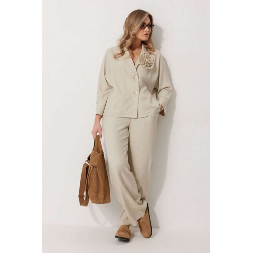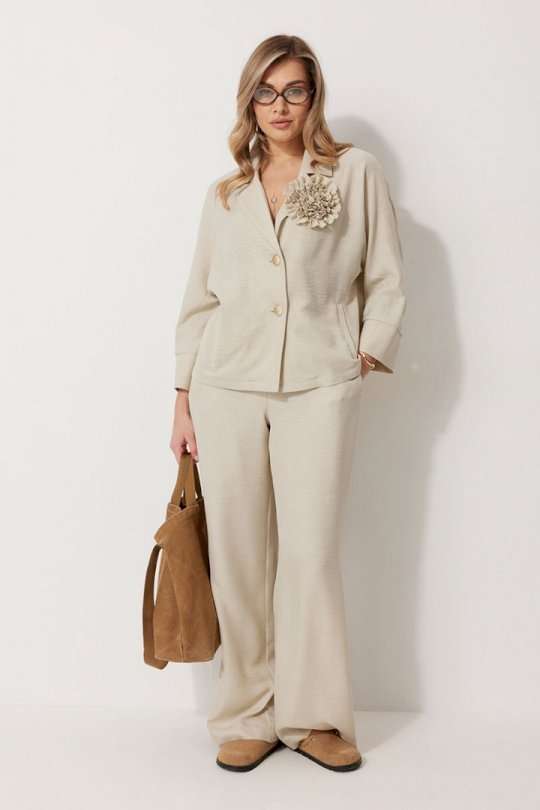 Костюм женский, состоящий из жакета и брюк. Жакет без подкладки, кроя «летучая мышь», с центральной однобортной застежкой на петли и пуговицы. По переду обработаны вертикальные прорезные карманы с листочкой. Спинка цельнокроеная, слева расположен декор в виде авторской броши. Горловина V-образной формы, обработана воротником пиджачного типа. Рукав 7/8, по низу обработан широкой притачной манжетой. Брюки женские, расширенные. По переду обработана застежка на молнию, обработаны карманы с наклонным входом. На задних половинках брюк застрочены вытачки. Верх обработан широким притачным поясом (частично на резинке), застегивающимся на петлю и пуговицу.