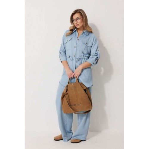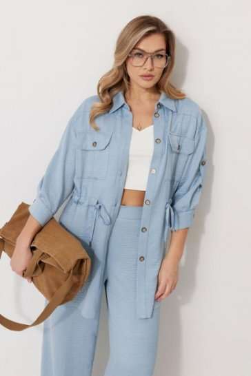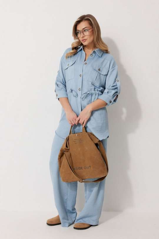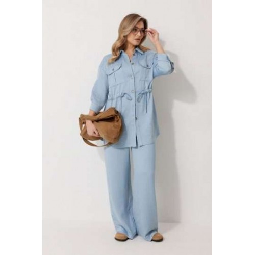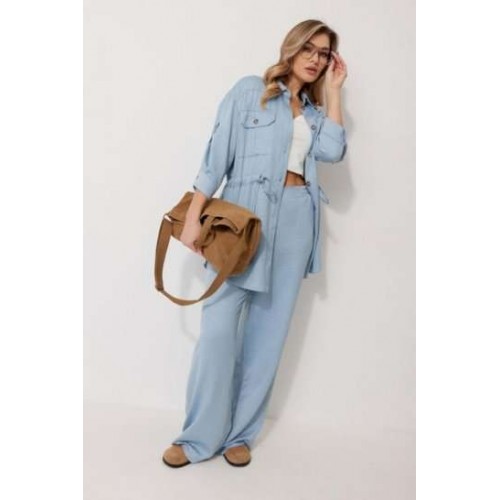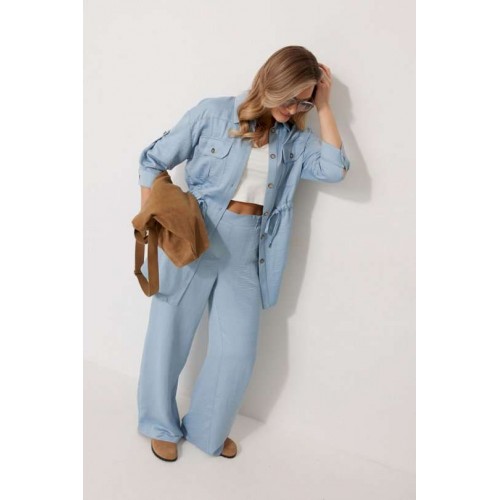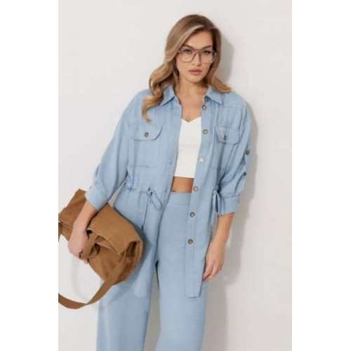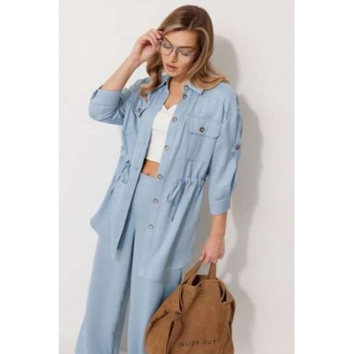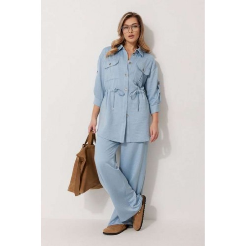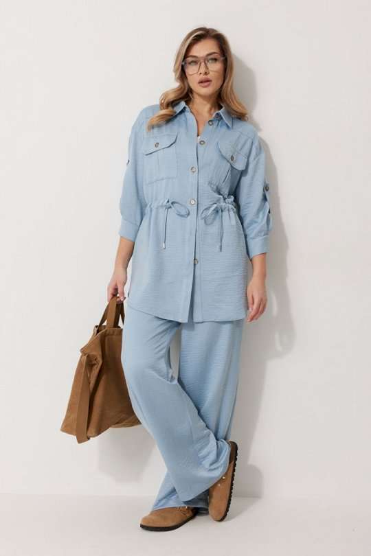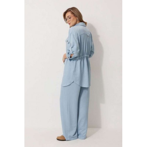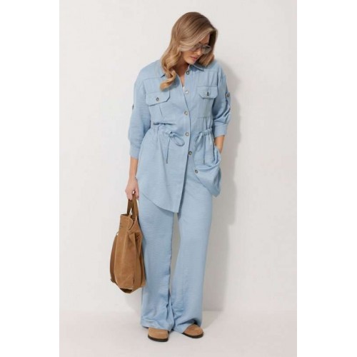 Костюм женский состоящий из блузки с брюками. Блузка прямого силуэта, по спущенной линией плеча, длиной за линию бедра. По переду блузки настрочены накладные карманы с клапаном. Клапан застегивается на петлю и пуговицу. По спинке отрезная кокетка с декоративным элементом. По переду и спинке, в районе талии располагается кулиска. Рукав втачной двухшовный ¾ длины. Низ рукава со складкой обработан притачной манжетой, застегивающейся на петлю и пуговицу. В разрезе рукава располагается пата, застегивающаяся на петлю и пуговицу. Застежка блузки центральная на отрезные планки, застегивающиеся на петли и пуговицы. Горловина блузки обработана рубашечным воротником с отрезной стойкой. Брюки женские, прямого силуэта. По переду обработана имитация застежки. Карманы расположены в боковом шве. На задних половинках брюк застрочены вытачки. Верх обработан притачным поясом (частично на резинке).
