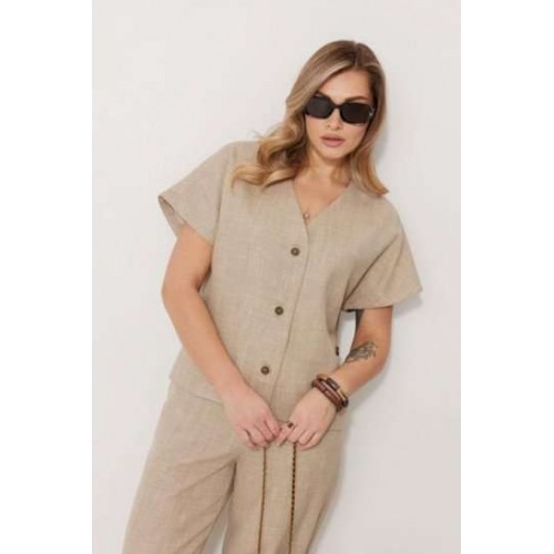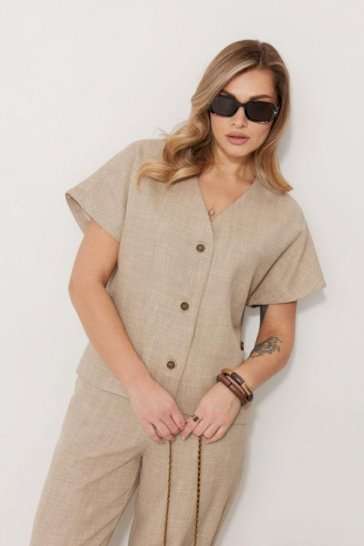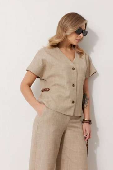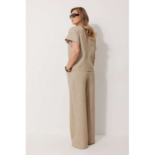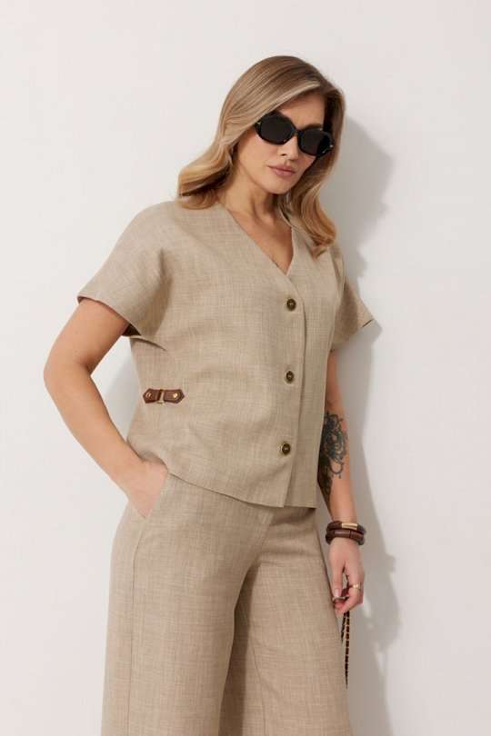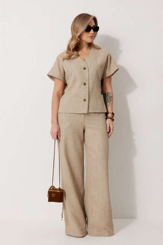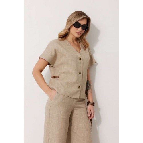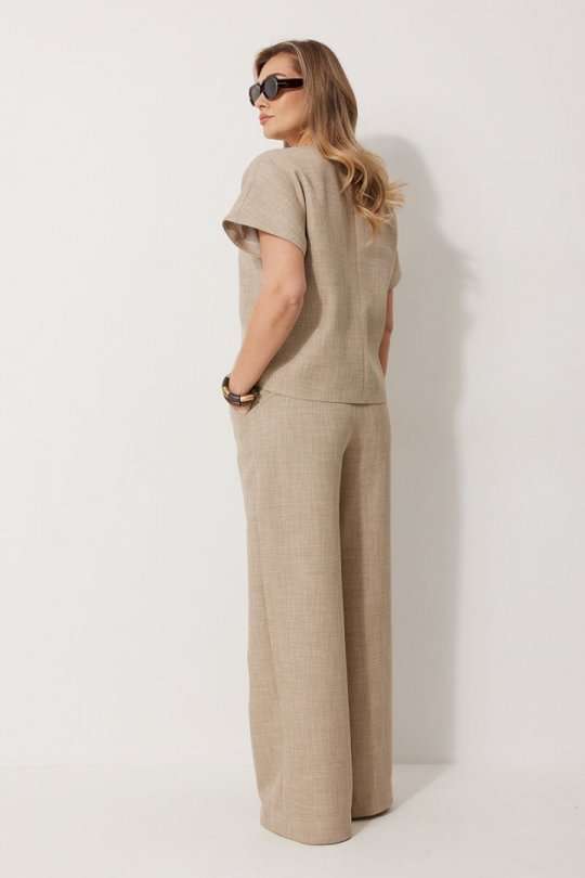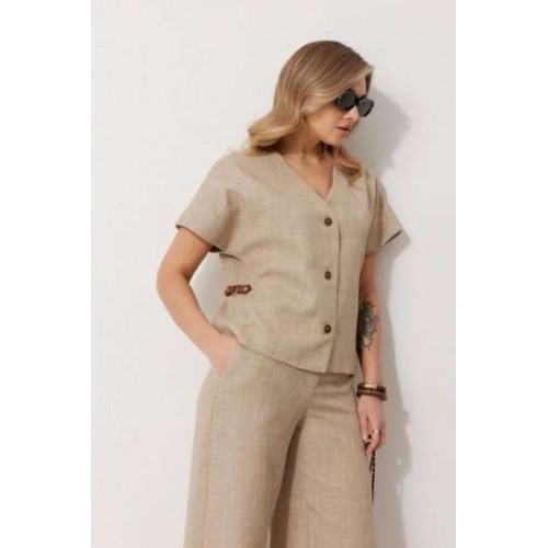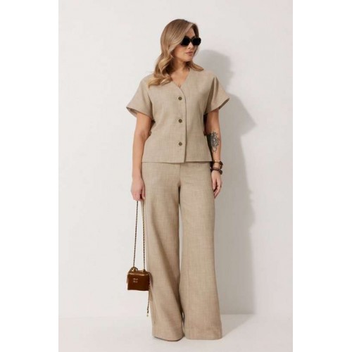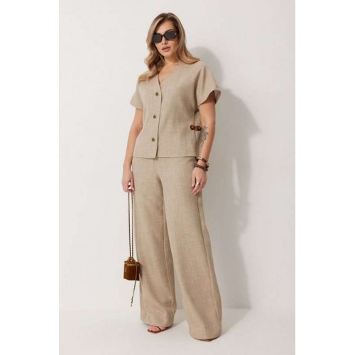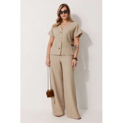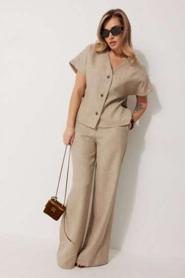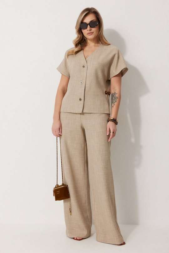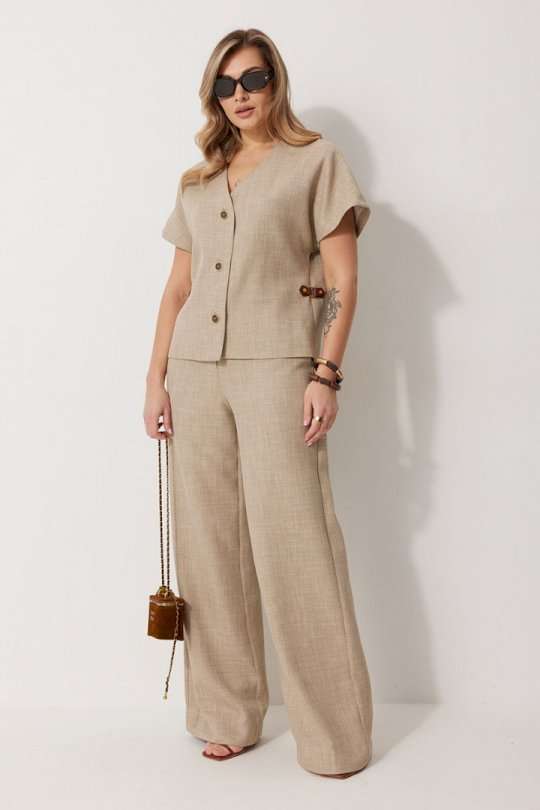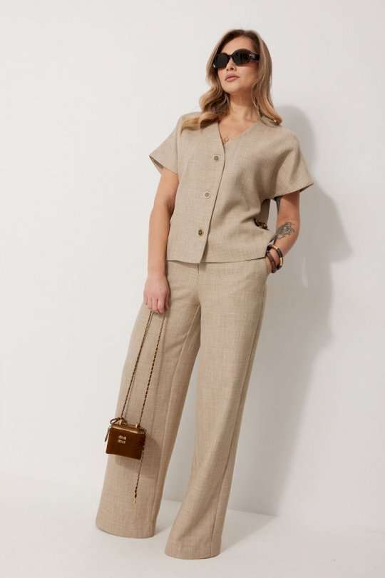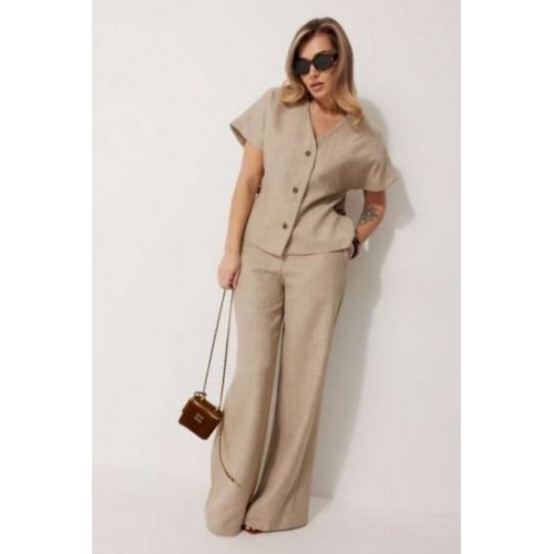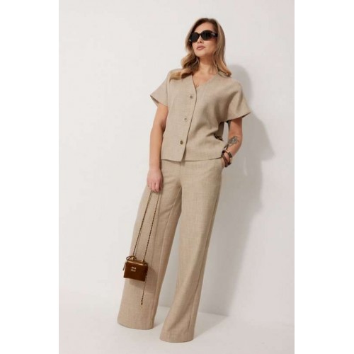 Костюм женский, состоящий из жилета и брюк. Жилет прямого силуэта на подкладке со спущенной линией плеча длиной до линии бедра. Спинка с центральным швом. Горловина V-образной формы обработана подбортом с обтачкой. Застежка жилета центральная на декоративные пуговицы. Брюки женские, прямого силуэта. По переду обработана застежка на молнию. Карманы наклонные с отрезным бочком. На задних половинках брюк застрочены вытачки. Верх обработан широким притачным поясом (частично на резинке), застегивающимся на петлю и пуговицу.