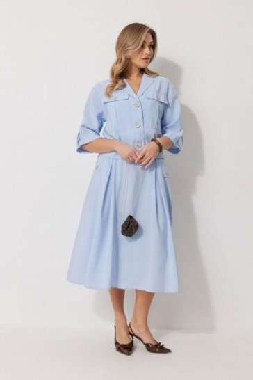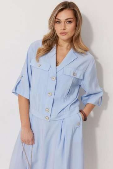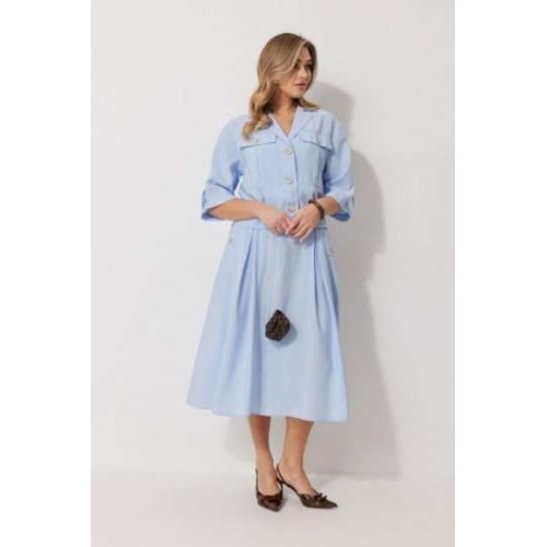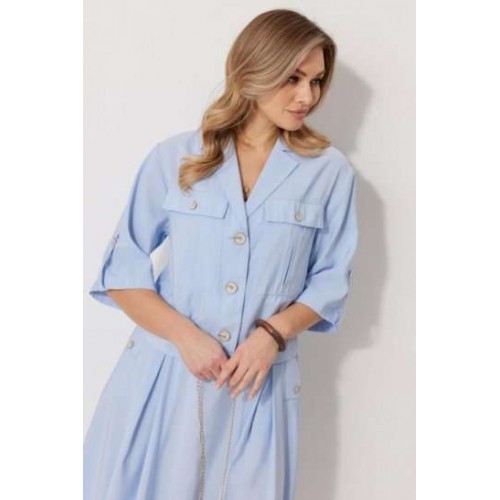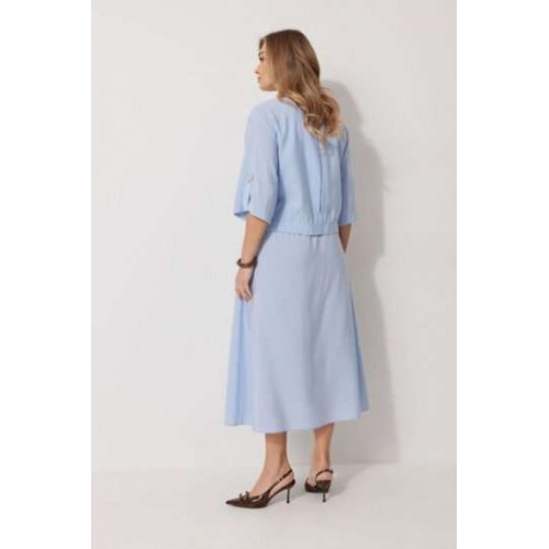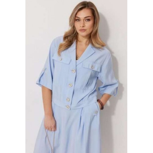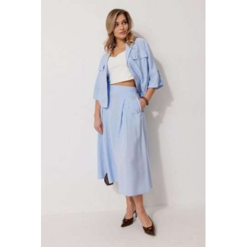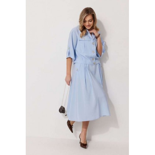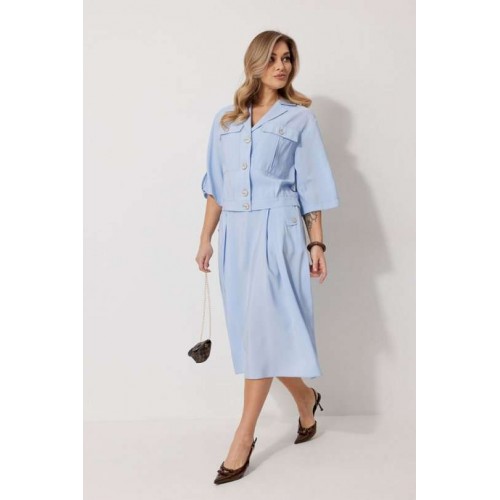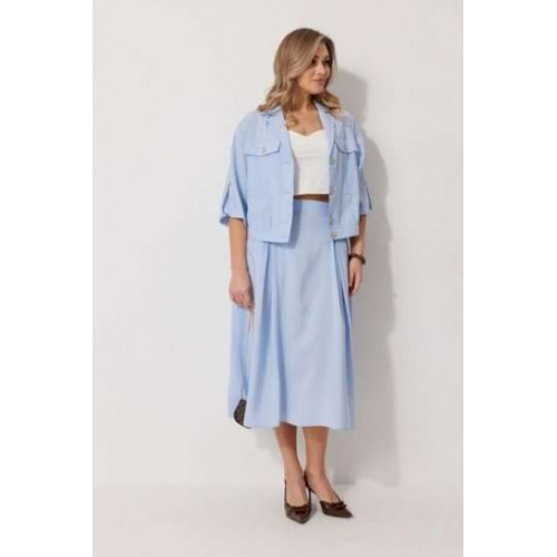 Костюм женский, состоящий из жакета и юбки. Жакет прямого силуэта без подкладки, длиной до линии бедра. По переду жакета настрочены накладные карманы с встречными складками. В шве притачивания кокетки расположен клапан кармана, застегивающийся на петлю и пуговицу. В среднем шве спинки расположена встречная складка. Рукав втачной одношовный, прямой. По низу рукава расположена пата, застегивающаяся на петлю и пуговицу. По низу жакета обработан отрезной пояс. Горловина обработана втачным воротником с лацканами. Застежка центральная , однобортная на петли пуговицы. Юбка женская на подкладке А – силуэта длиной до середины икры. По переду юбки заложены встречные складки и нстрочены клапаны с декоративными пуговицами. Спинка юбки цельная. Карманы обработаны в боковом шве юбки. По левому боковому шву юбки находится застежка – молния. Верхний срез юбки обработан притачным поясом с резинкой по спинке.