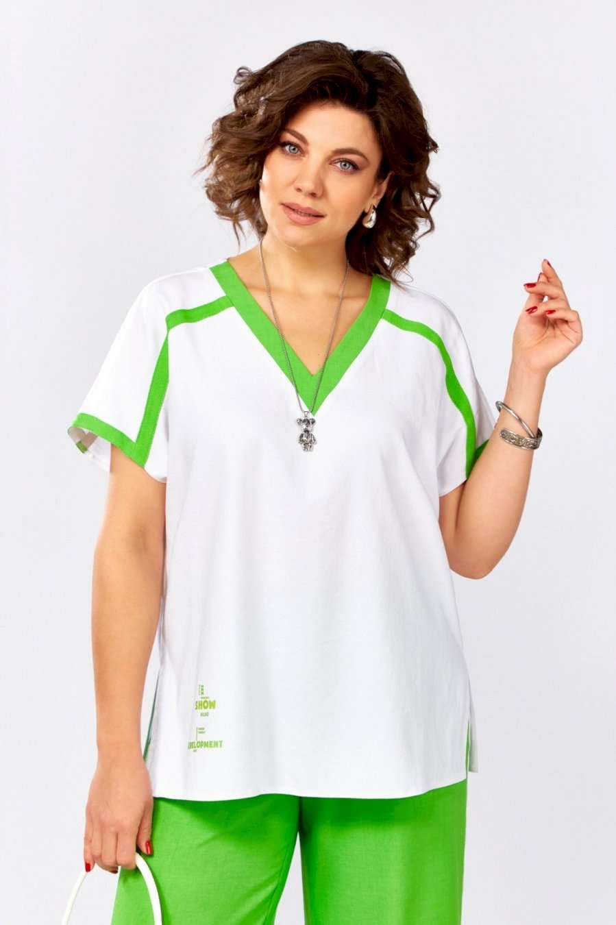 Яркий брючный костюм в стиле спорт- шик из легкой стрейчевой ткани с легким крэш эффектом, идеальный выбор для летнего сезона .Блузка свободного силуэта со спущенной линией плеча , v образной горловиной , и с разрезами в боковых швах, яркий акцент добавляет контрастная отделка и декоративная печать Брюки свободного силуэта , по талии на резинке , с боковыми карманами и отделкой лампас.