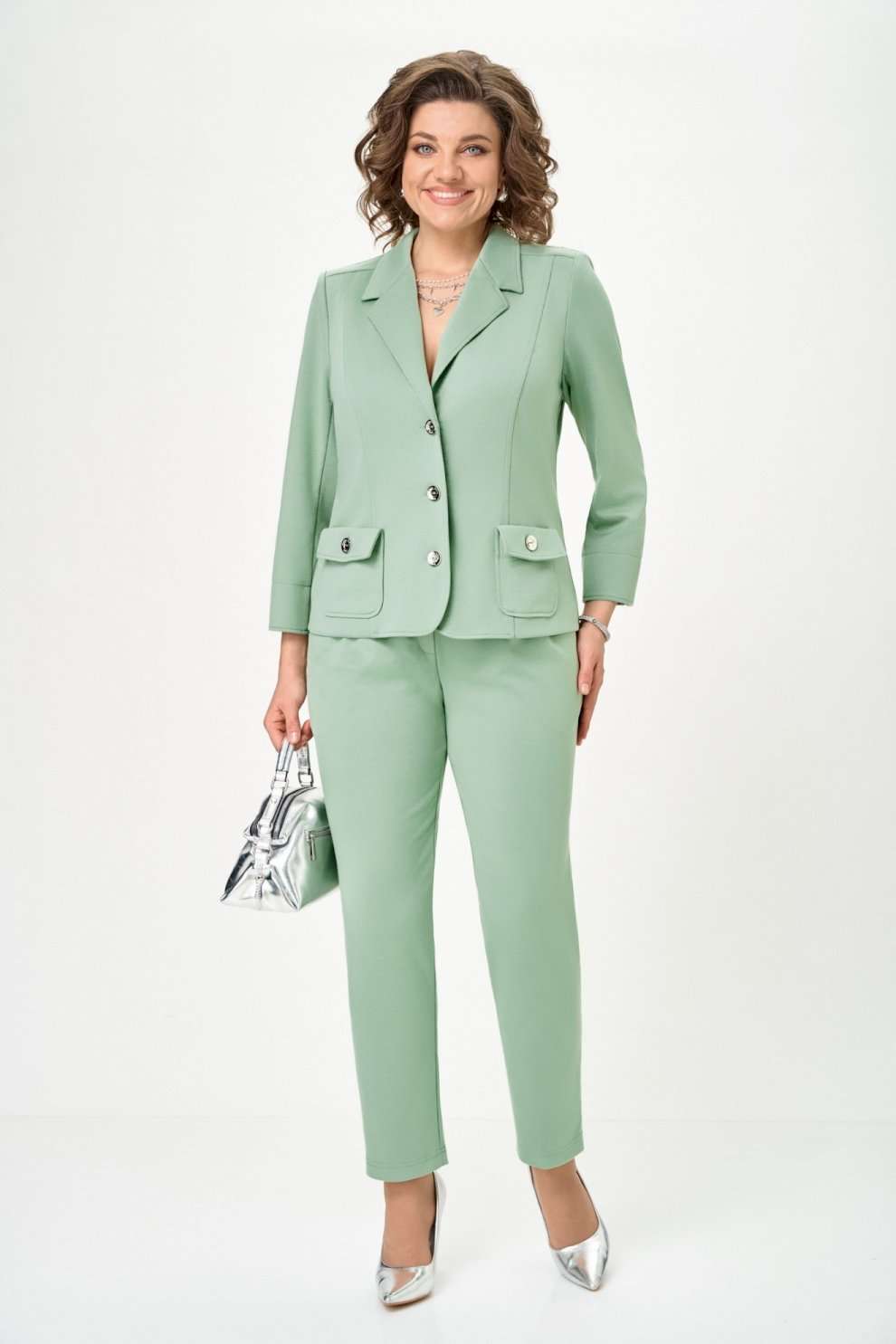Костюм брючный 2848 оливковый идеальный выбор для любых случаев. Этот брючный костюм выполнен из смеси вискозы и полиэстера, что обеспечивает комфорт и легкость в любом сезоне. Жакет полуприлегающего силуэта с длиной 63 см и рукавом три четверти на пуговицах станет отличным выбором для офиса или прогулки. Практичные накладные карманы добавляют функциональности, а пояс на резинке в брюках средней посадки подчеркивает свободу движений. Оливковый цвет и современный стиль позволят вам выглядеть стильно как в офисной, так и в повседневной жизни. Длина жакета - 63см, длина рукава - 60см, длина брюк - 104см.