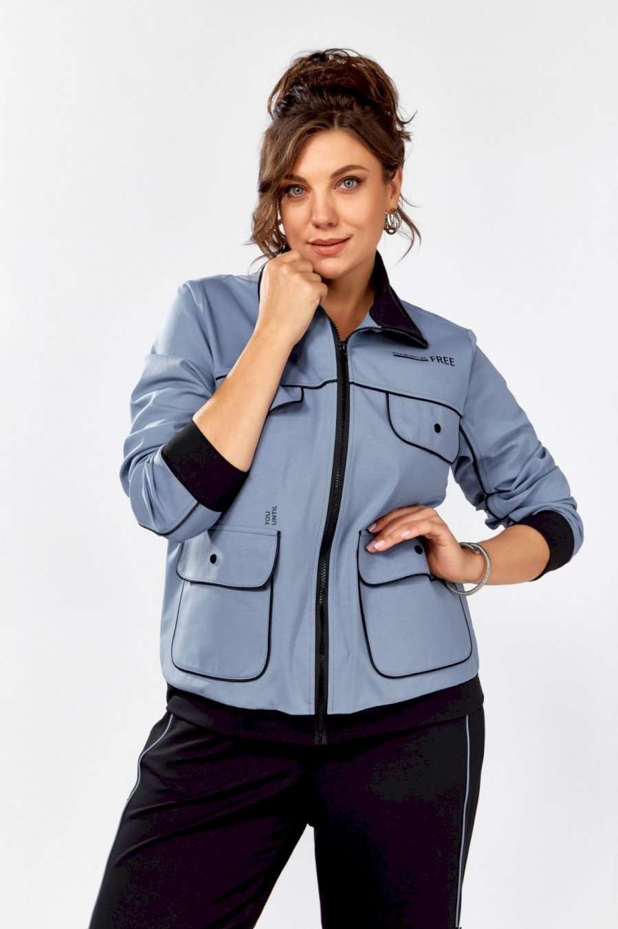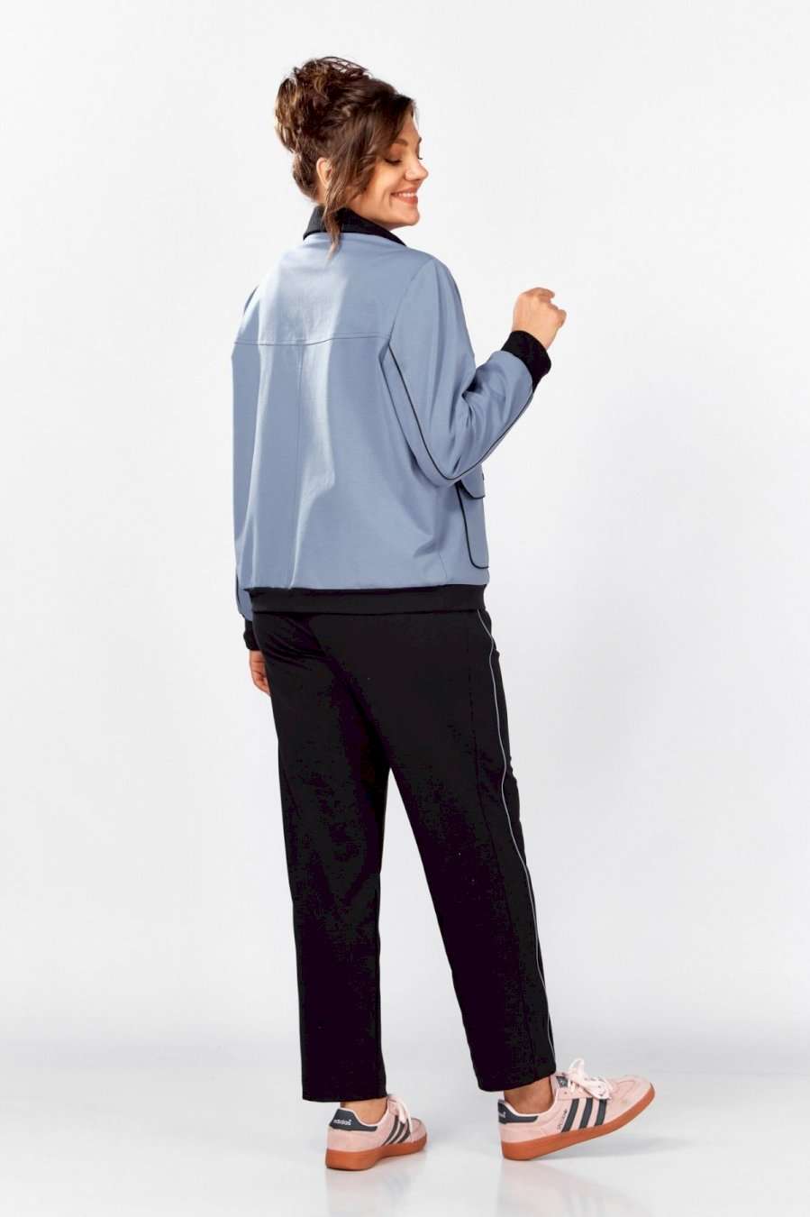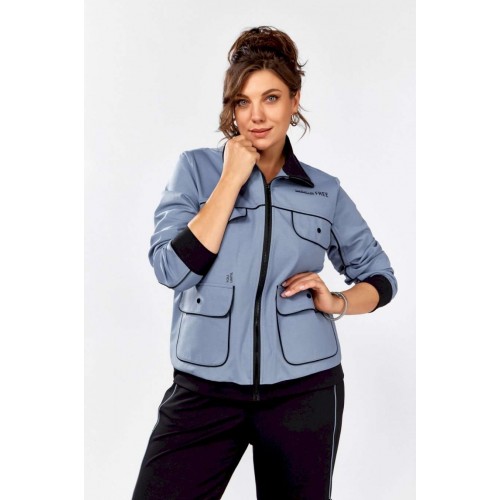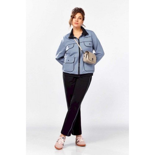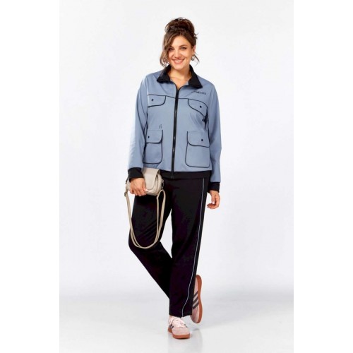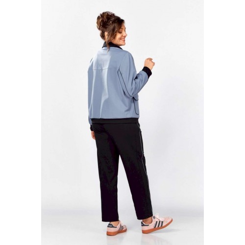 Стильный, удобный, трикотажный, спортивный костюм для активной повседневной жизни, в котором сочетаются модный дизайн и комфорт. Джемпер свободного силуэта на молнии, воротник отложная стойка. Накладные карманы, клапаны, кокетка и рукава декорированы отделаны контрастным черным кантом, в цвет брюк. Брюки на резинке с боковыми карманами и подрезами с декоративным кантом. Костюм отлично садится и скрывает недостатки фигуры из-за хорошо продуманных конструктивных линий и пропорций.
