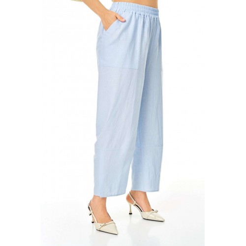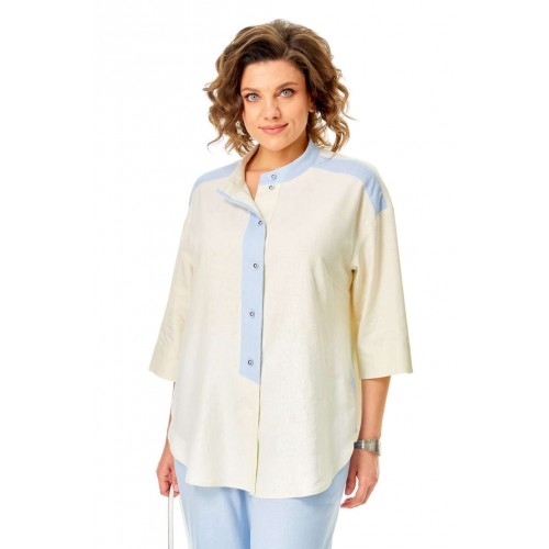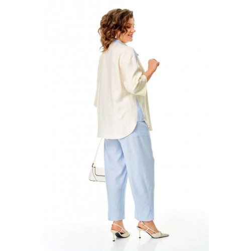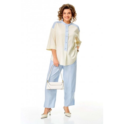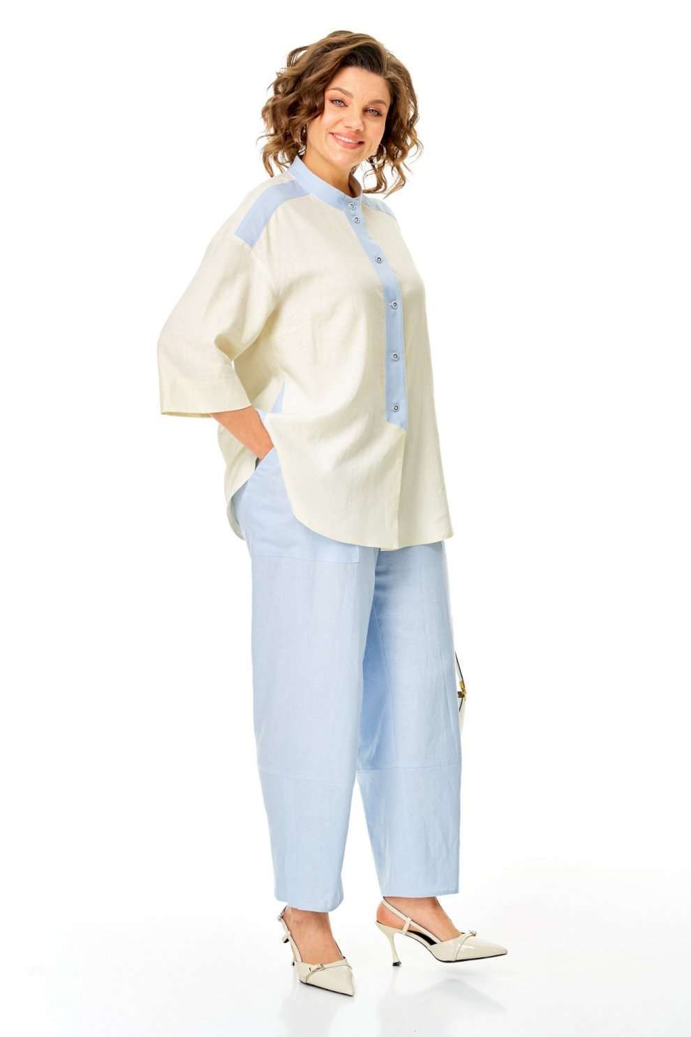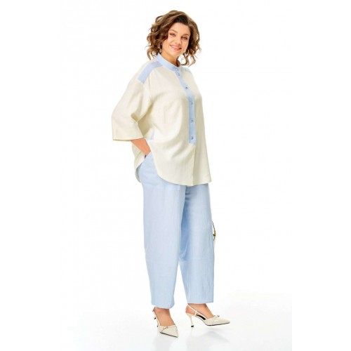 Костюм брючный 26242 молочно-голубой DOGGI. Коллекция бренда DOGGI предлагает легкий, стильный и комфортный костюм из натуральных материалов с высоким содержанием льна и вискозы. Блузон свободного кроя с контрастной отделкой и воротником-стойкой придаст вашему образу особый шарм. Спущенный рукав и фигурный низ добавляют изысканности. Брюки модного кроя баги с резинкой и декорированными подрезами по низу гарантируют комфорт. Наличие карманов позволяет сохранять практичность в повседневном использовании. Данный брючный костюм, выполненный в молочно-голубой цветовой гамме, станет идеальным выбором для весенне-летнего сезона, подчеркивая стиль и комфорт в любом событии.