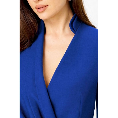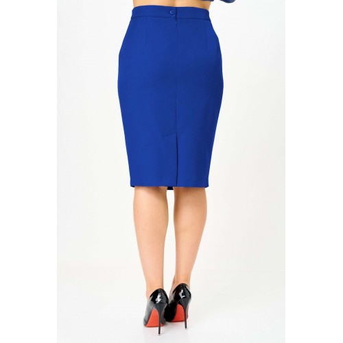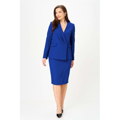 Комплект состоит из жакета и юбки. Жакет полуприлегающего силуэта на подкладке. По переду отрезные бочки, функциональные прорезные карманы с клапаном и асимметричный декоративный элемент в виде трёх мягких складок выходящих из подреза по талии по правой стороне переда, переходящий в двойной воротник-стойку по левой стороне переда. Спинка со средним швом и рельефами из проймы. Рукав длинный, втачной, двухшовный. Юбка на подкладке, со шлицей, зауженная к низу, с притачным поясом. В размерах 50-54 для комфорта в пояс по бокам вставлена резинка. Застежка в юбке на потайную тесьму-молнию в среднем шве заднего полотнища. Данная модель станет чудесным дополнением в Вашем гардеробе, выступая интересным офисным костюмом или, выполняя функцию сдержанного варианта для торжественных мероприятий.