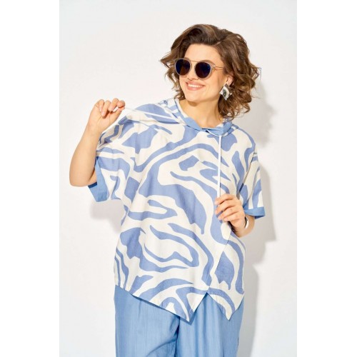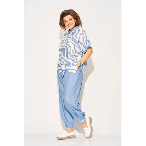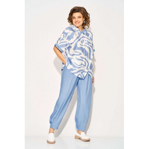 Костюм брючный 1438л голубой Liliana-style — это идеальный выбор для летнего сезона. Коллекция бренда Liliana-style сочетает в себе комфорт и стиль благодаря использованию вискозы и льна для создания легкой и дышащей ткани. Удлиненная туника свободного кроя с капюшоном и кулиской на шнуровке добавляют динамичности образу, а ассиметричный подрез и разноуровневый низ придают индивидуальность. Брюки с завышенной посадкой и боковыми карманами обеспечивают практичность и комфорт. Длина туники по спинке составляет 68 см, длина брюк — 98-100 см. Этот комплект в голубых тонах идеально подходит для повседневных прогулок.
