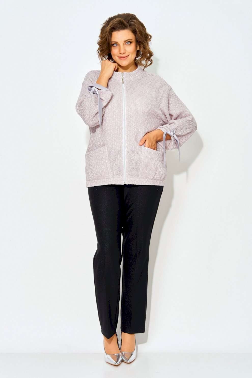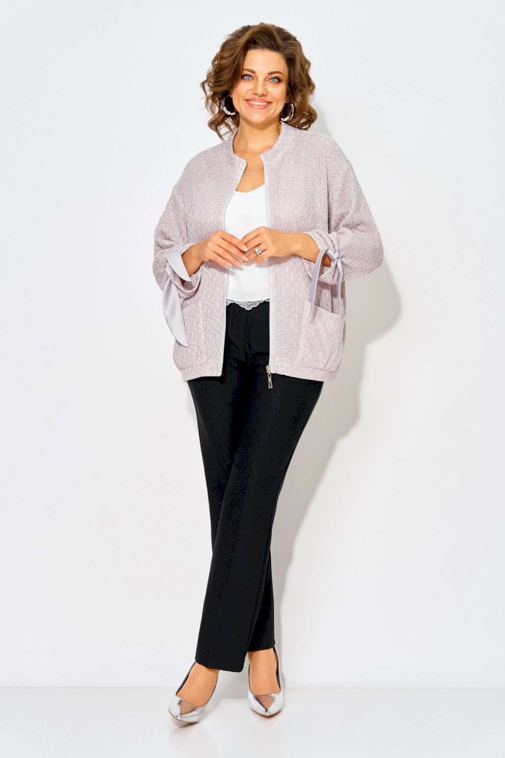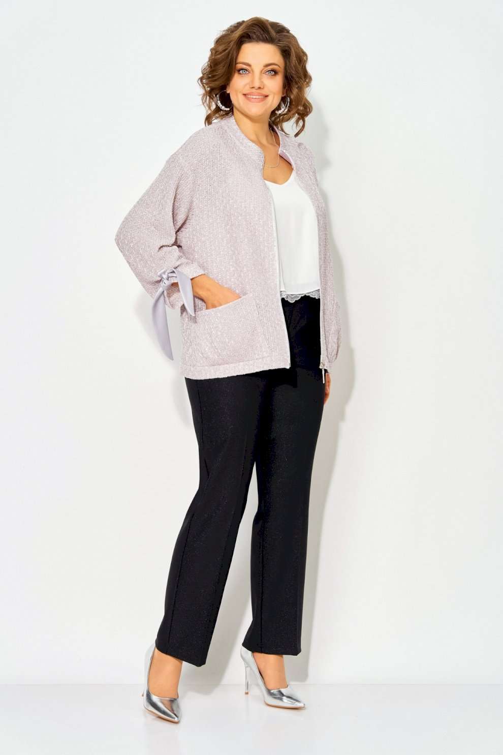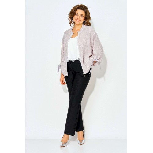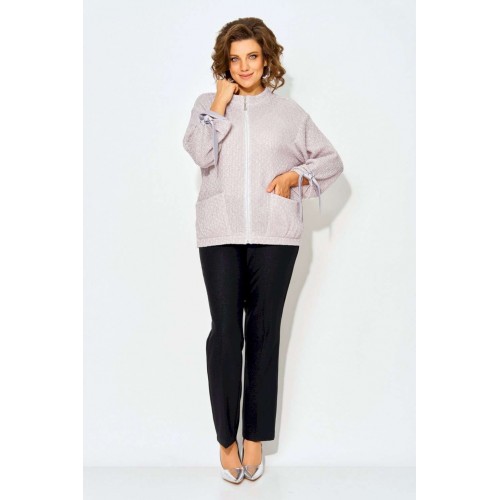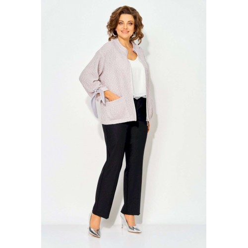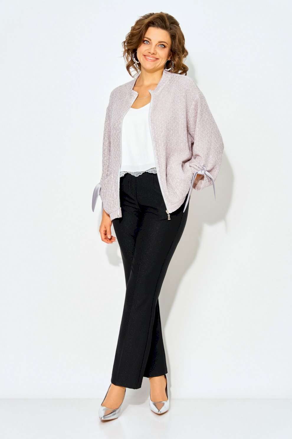 Эффектный, нарядный облегченный жакет, выполнен из вязанного трикотажа с эффектом легкого мерцания. Модель свободного силуэта, с рукавом длиной ¾-ти на спущенном плечевом поясе. Горловина обработана полулежащей стойкой. Застежка центральная на молнию. По полочке расположены аккуратные накладные карманы. Низ изделия оформлен притачной планкой. Изюминкой данной моделям служит необычные паты по рукаву с завязкой в виде банта. Этот вязанный трикотажный жакет - идеальный вариант для создания стильного и привлекательного романтического образа! Мягкий и нежный материал делает его очень приятным на ощупь, теплым и уютным, а легкое мерцание придает свою изюминку. Отлично сочетается с классическими прямыми брюками из базовой коллекции от бренда Лилиана! Длина – по спинке –70 см., рукав – 55 см. Брюки – 104 см.