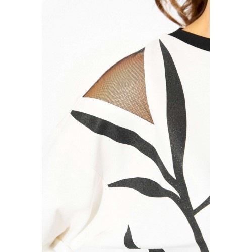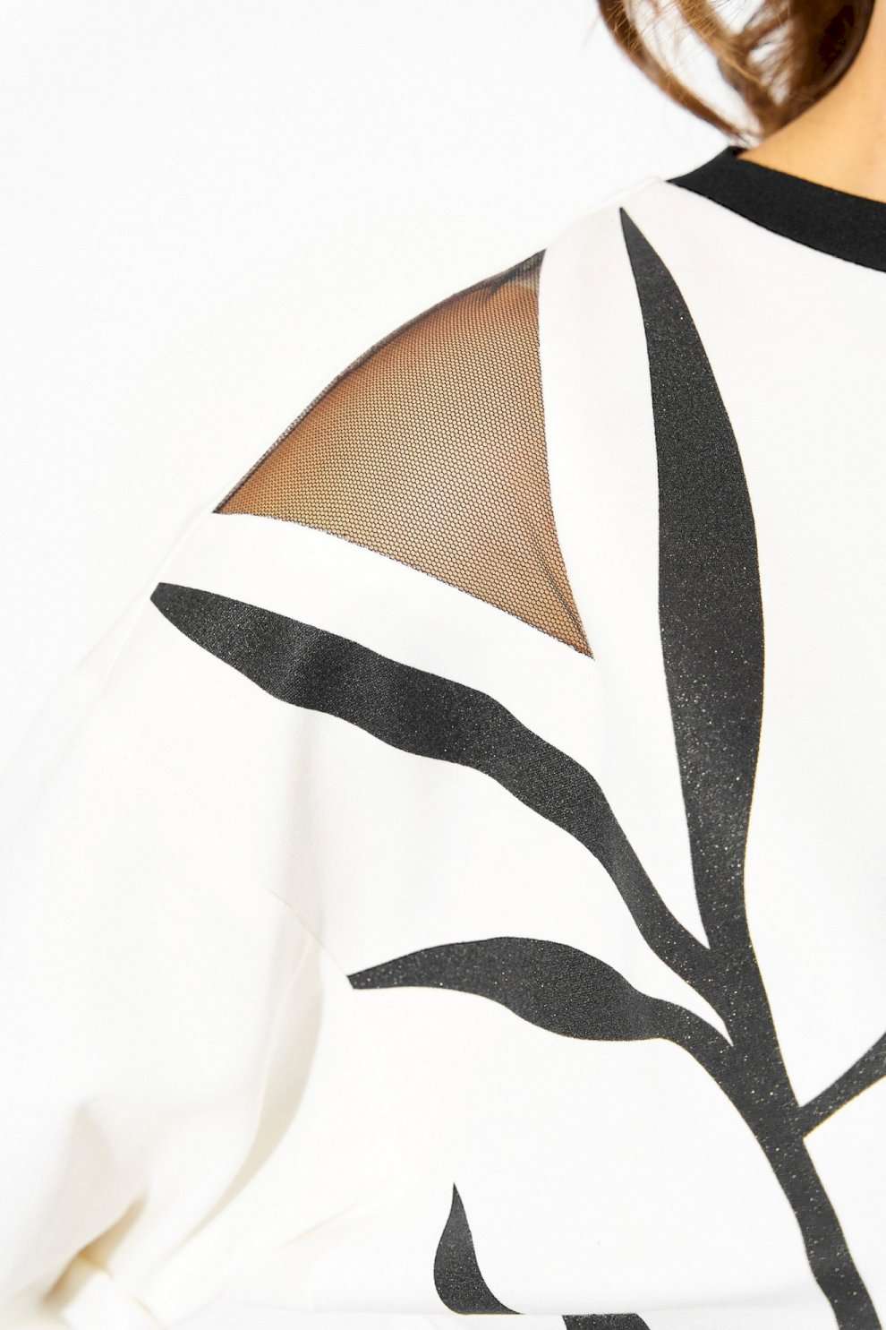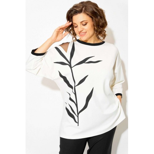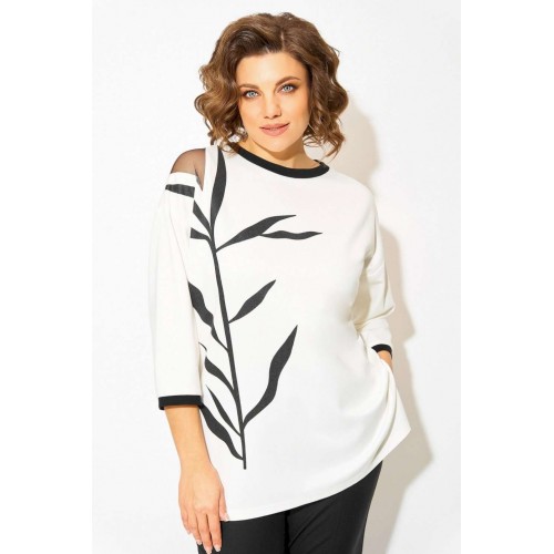 Нарядная блузка-туника больших размеров, выполнена из трикотажного джерси. Модель прямого силуэта, со спущенной линией плеча и рукавом длиной ¾-ти. Модель с округлым вырезом горловины на мягкой притачной планке контрастного цвета. По бокам предусмотрены разрезы на свободу. Полочка декорирована печатью накатом с мерцающим эффектом в виде ветви. На плече ассиметричная вставка из сетки. Вы в поиске универсальной блузки которую легко совмещать с разными образами? Тогда ваш выбор наша блузка женская, которая идеально решит все эти задачи! Длина по спинке – 70 см, рукав – около 45 см.