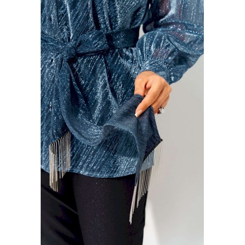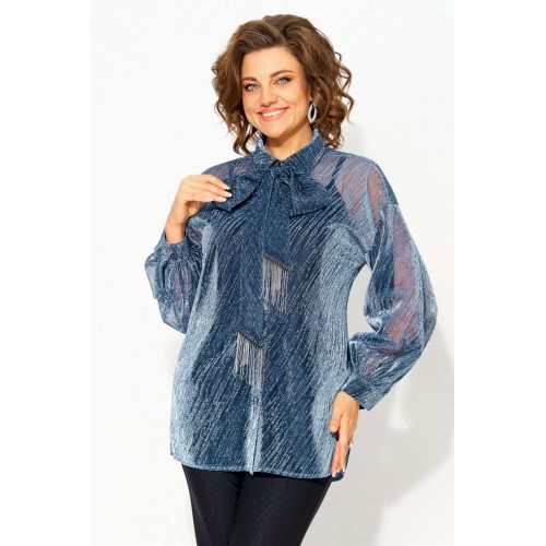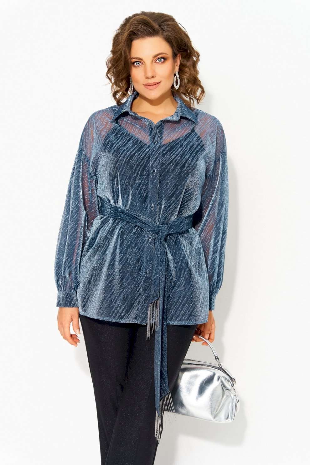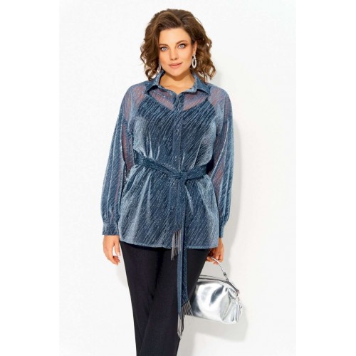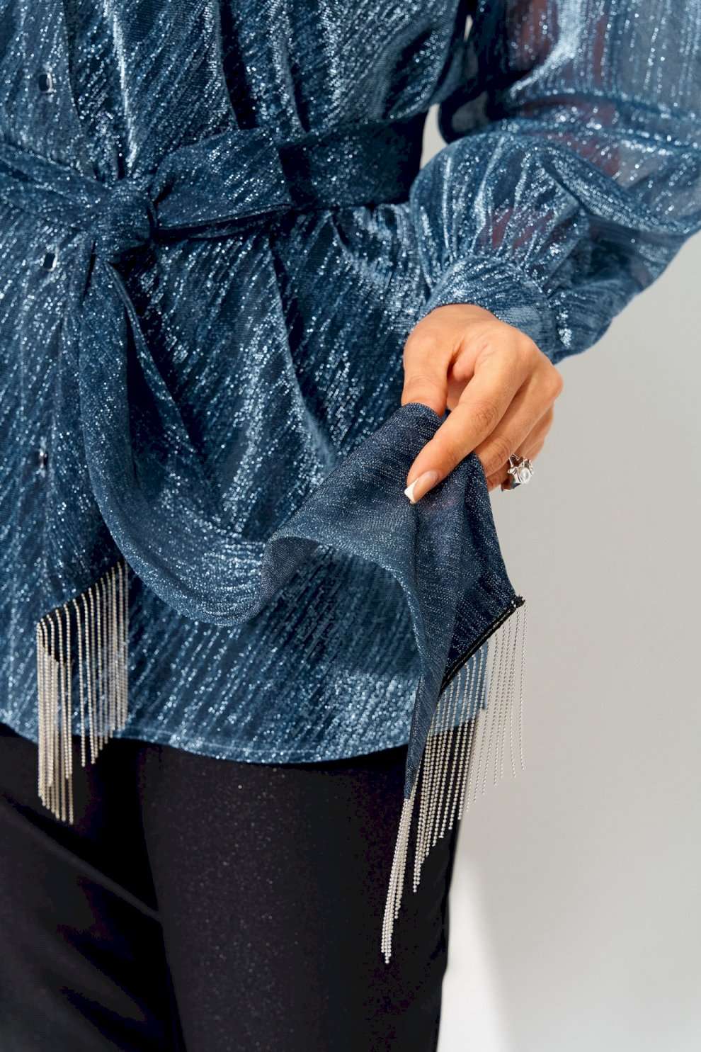 Трендовая блузка из легкой сетчатой ткани c эффектом мерцания станет стильным дополнением вашего гардероба. Ее можно комбинировать с различными элементами гардероба, накинуть поверх платья или топа. Модель выполнена с воротником-стойкой, который добавляет элегантности образу. Застежка центральная на петли и пуговицы. По бокам расположены разрезы. Свободный крой обеспечивает комфорт и подчеркивает женственность. Длинный рукав с манжетами делает ее универсальной для любого сезона, а удлиненный силуэт добавляет изысканности. В комплект входит съёмный пояс с декоративной бахромой, который может служить в виде шарфика и добавить элегантность образу. Изделие идеально подходит для повседневного ношения, офиса или вечернего выхода. Отлично сочетается с базовыми браками из коллекции от бренда «Лилиана». Длина по спинке – 70 см, рукав – 63 см.
