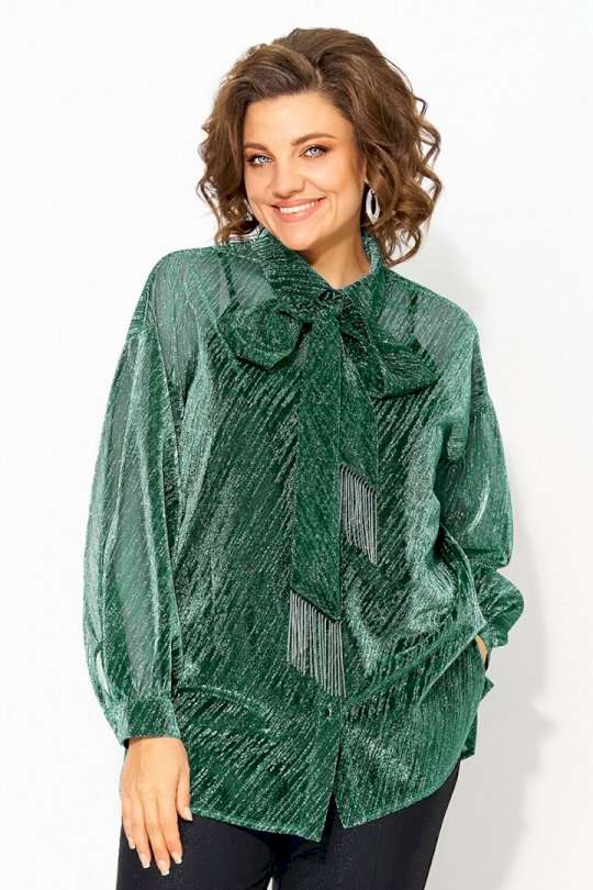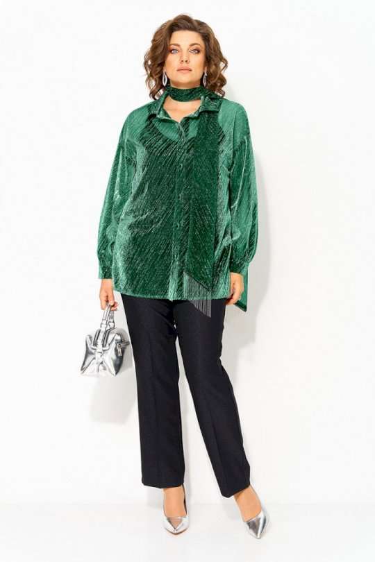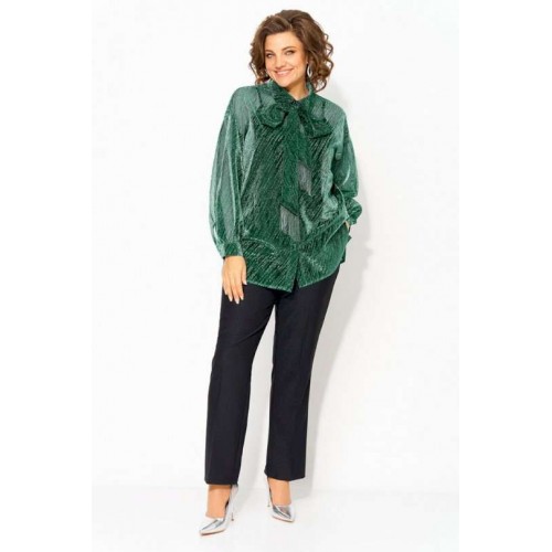 Трендовая блузка из легкой сетчатой ткани c эффектом мерцания станет стильным дополнением вашего гардероба. Ее можно комбинировать с различными элементами гардероба, накинуть поверх платья или топа. Модель выполнена с воротником-стойкой, который добавляет элегантности образу. Застежка центральная на петли и пуговицы. По бокам расположены разрезы. Свободный крой обеспечивает комфорт и подчеркивает женственность. Длинный рукав с манжетами делает ее универсальной для любого сезона, а удлиненный силуэт добавляет изысканности. В комплект входит съёмный пояс с декоративной бахромой, который может служить в виде шарфика и добавить элегантность образу. Изделие идеально подходит для повседневного ношения, офиса или вечернего выхода. Отлично сочетается с базовыми браками из коллекции от бренда «Лилиана». Брюки классического покроя, средней посадки с боковыми кармаами. Пояс притачной, в боковых участках вставлена резинка. Застежка: брючная тесьма-молния с обработанным гульфиком. В брюках заутюжены канты.