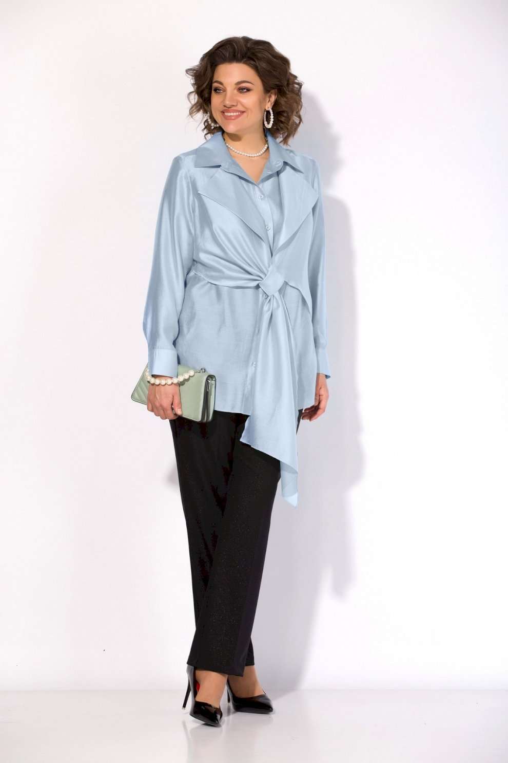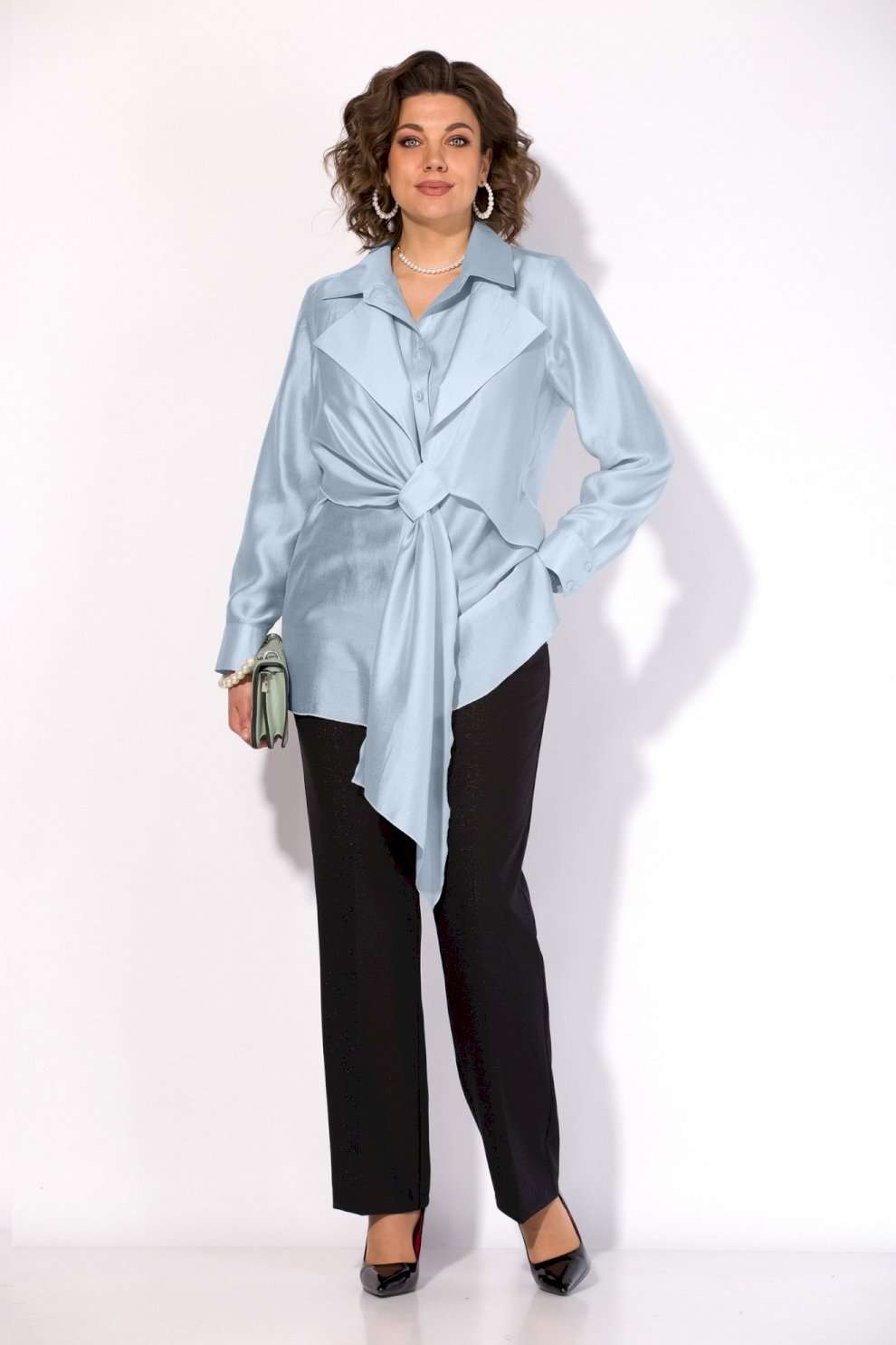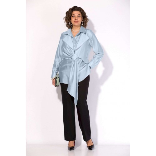 Костюм брючный от коллекции бренда Liliana-style объединяет в себе современные веяния и классические акценты. Мятная блузка выполнена из лёгкой шёлковой вуали, придающей образу особое очарование, с полуприлегающим силуэтом и отложным воротником на стойке. Брюки черного цвета средней посадки и прямого покроя с боковыми карманами дополняют стильный образ. Застёжка на молнии и резинка в боковых вставках обеспечивают дополнительный комфорт. Подойдёт для офиса и вечерних мероприятий в весенне-летний период. Длина по спинке 70 см, рукав 62 см, подгибка брюк 4 см подчеркнут стиль и вкус владельца.