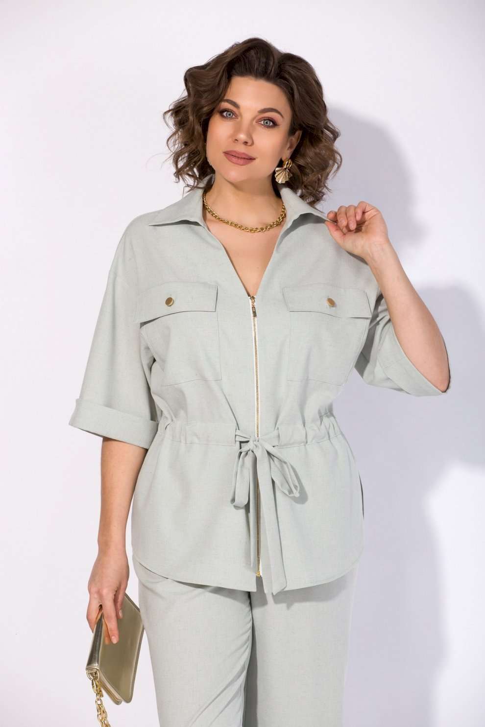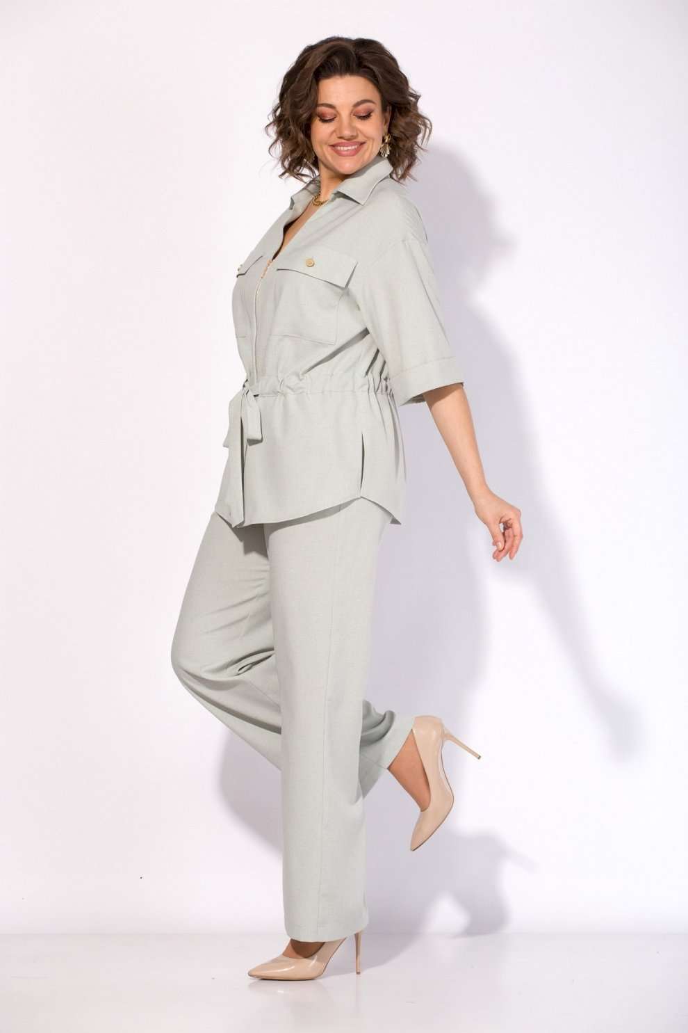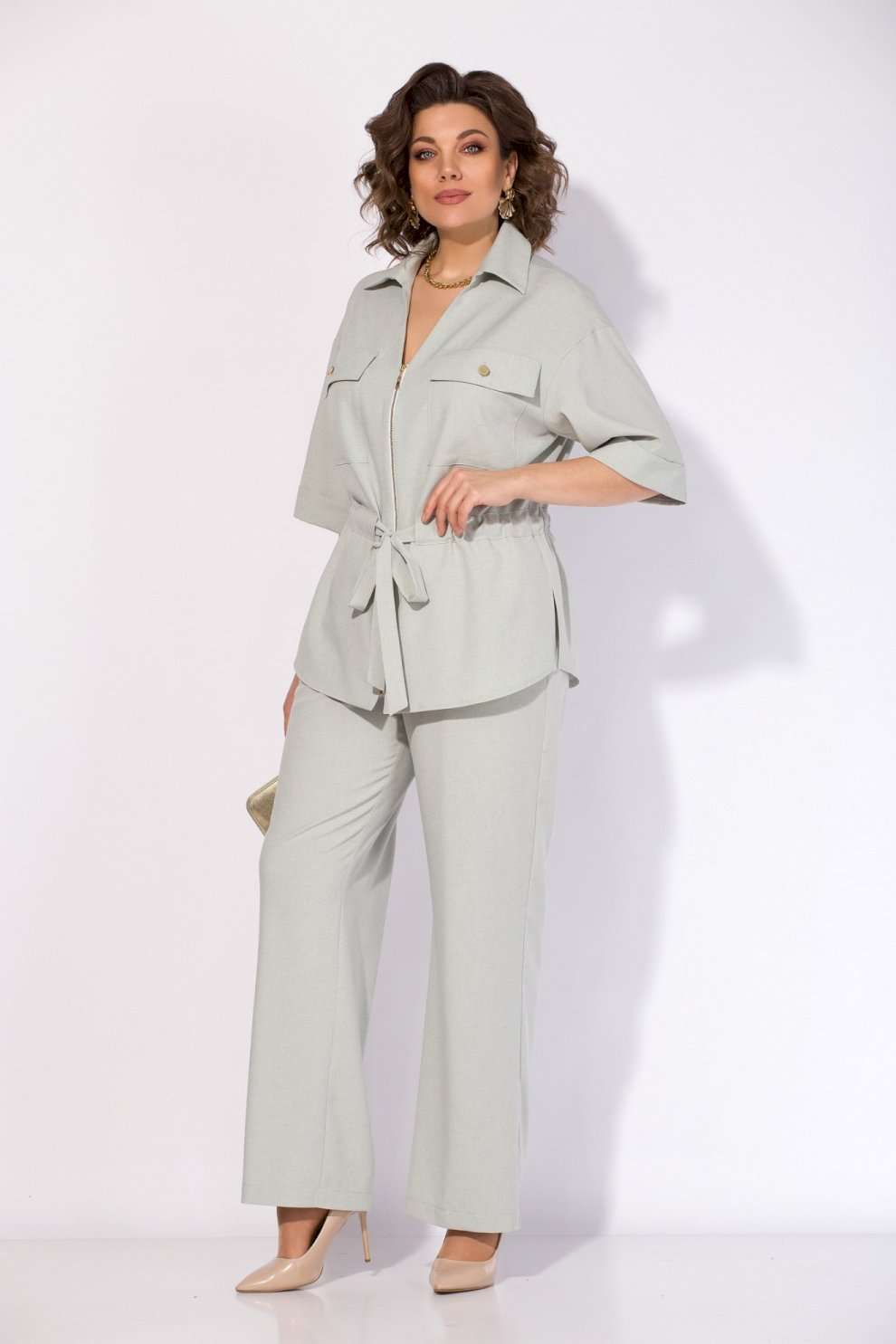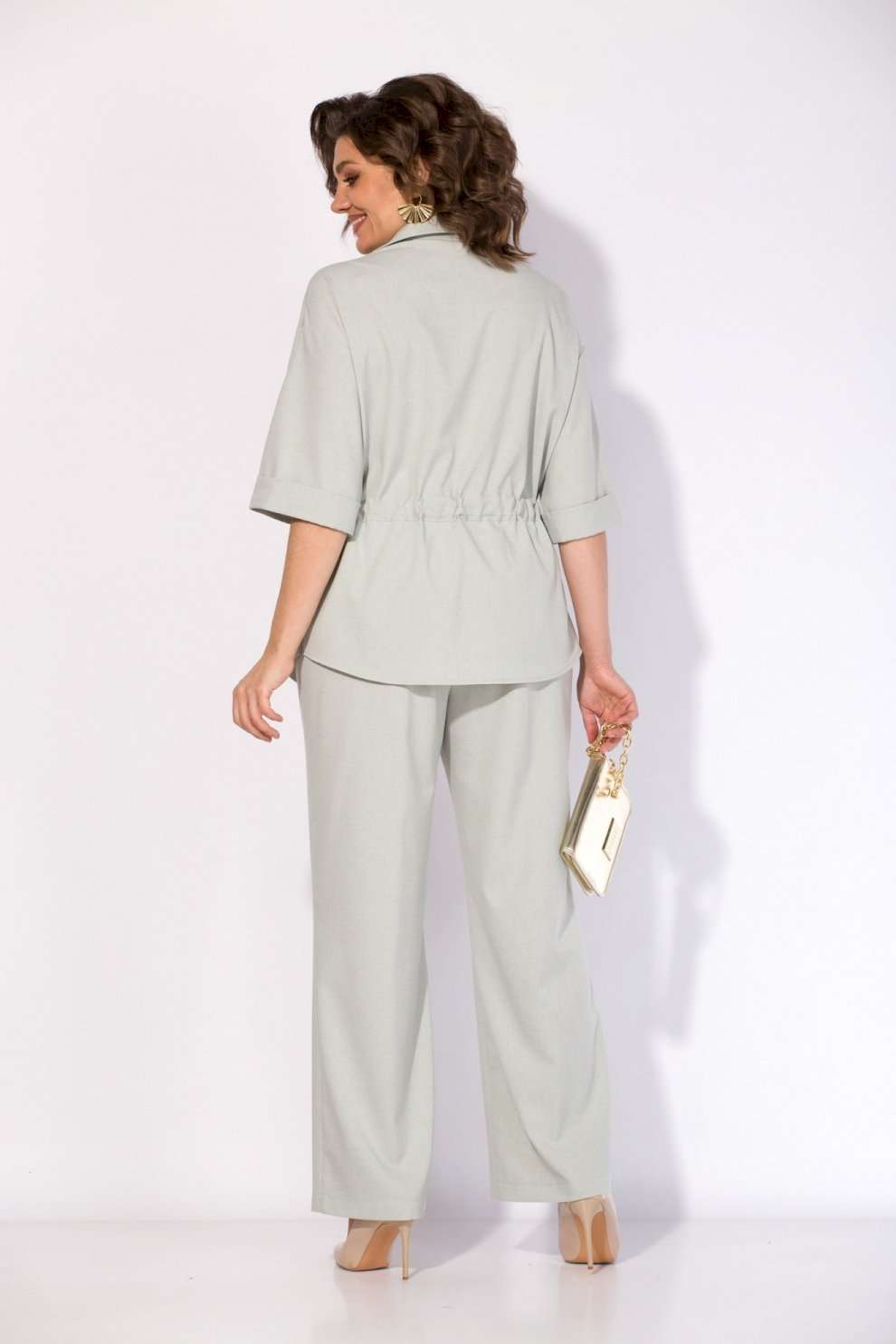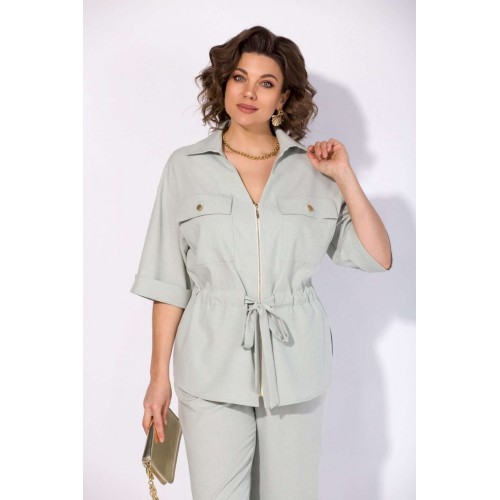 Костюм брючный 1518 мятный Liliana-style — это воплощение комфорта и современного стиля. Коллекция бренда Liliana-style выполнена из легкого вискозного материала с добавлением льна, что обеспечивает дышащие свойства и комфорт в течение всего дня. Модный блузон-жакет с коротким рукавом и металлической молнией дополнен стильными накладными карманами с клапаном. V-образный вырез с отложным воротником и регулируемая кулиска с поясом-завязкой подчеркивают талию. Брюки палаццо с высокой посадкой и боковыми карманами идеально дополняют комплект для офисного или повседневного образа. Длина блузона — 70 см, брюки — 104 см, ручка — 40 см. Костюм представлен в мягком мятном оттенке, что делает его подходящим для весенне-летнего сезона.