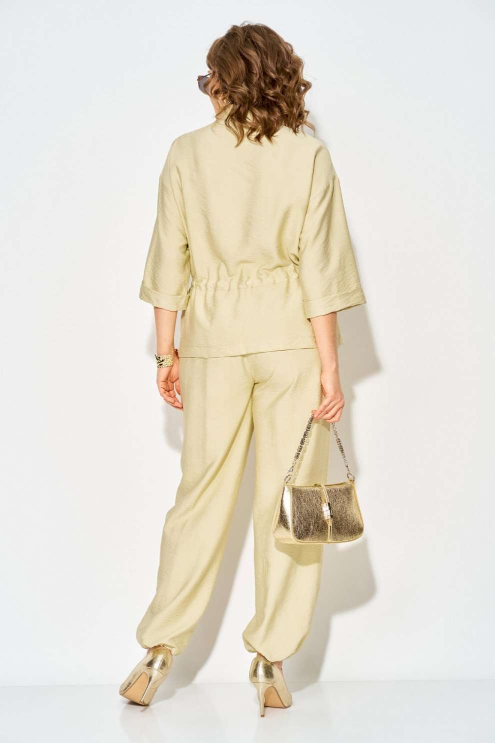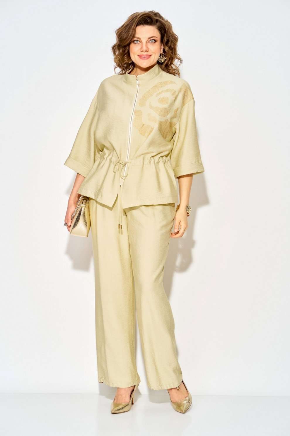 Костюм брючный 1527 светло-лимонный Liliana-style от бренда «ЛИЛИАНА» — это универсальное решение для весенне-летнего сезона. Коллекция бренда предлагает идеальный баланс между стилем и комфортом. Выполненный из мягкой вискозы, он обеспечивает комфорт и позволяет коже дышать, что особенно важно в теплое время года. Модель имеет оверсайз покрой, центральную застежку на металлическую молнию и кулиску по талии для индивидуальной посадки. Длина блузона составляет 65 см, а рукав в три четверти — примерно 45 см. Брюки с боковыми карманами средней посадки, длина которых варьируется от 104 до 106 см. Благодаря утяжке по низу брюки трансформируются в модные «султанки». Абстрактный золотистый принт завершает образ. Цвет костюма — светло-лимонный, что делает его подходящим для прогулок и встреч с друзьями.