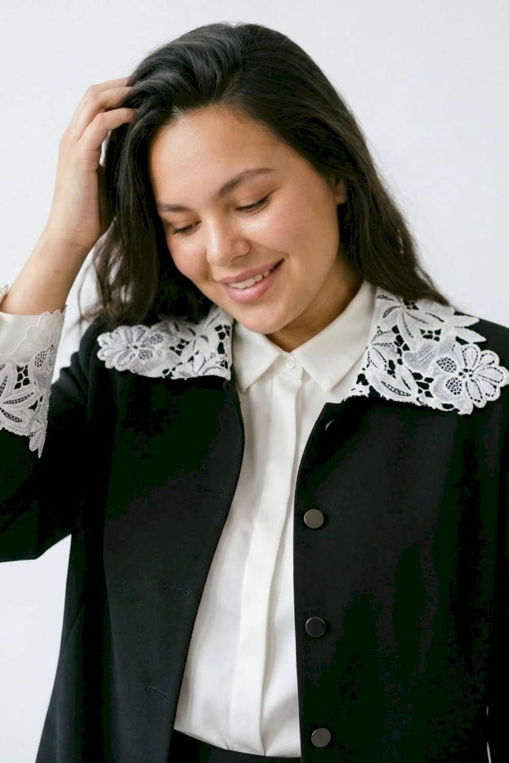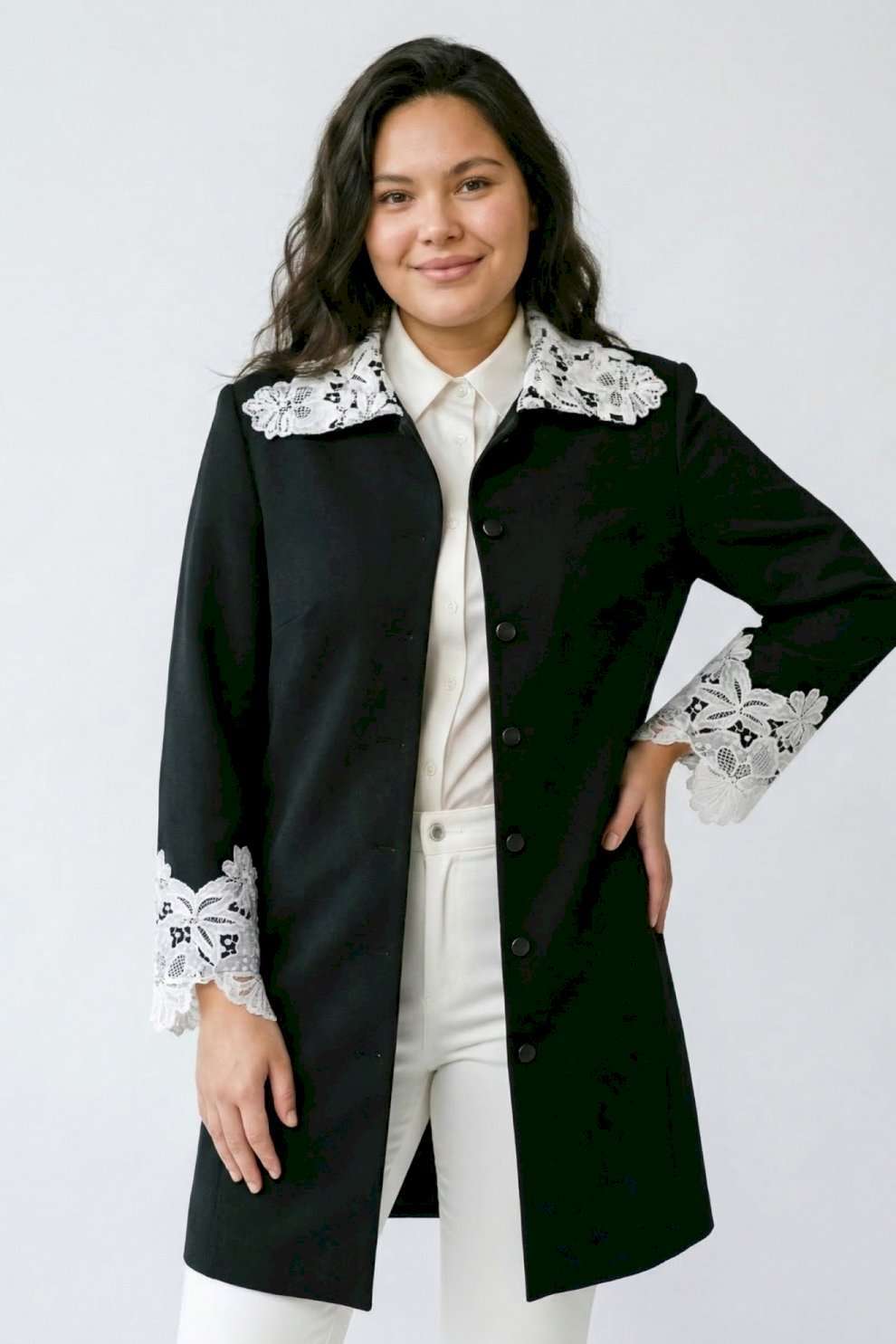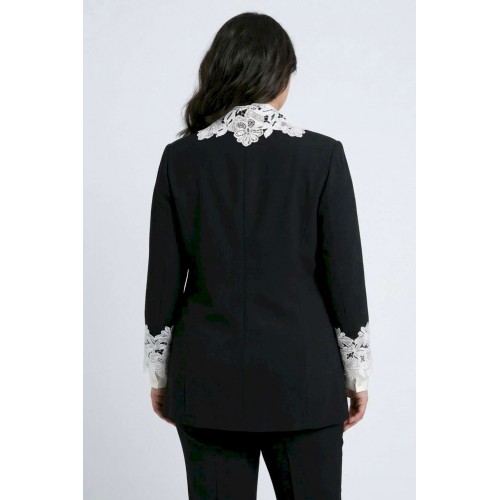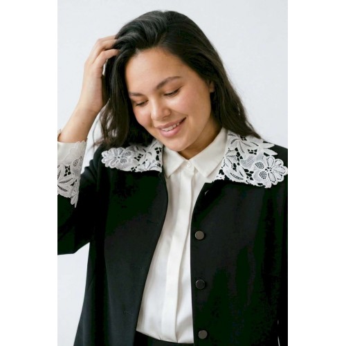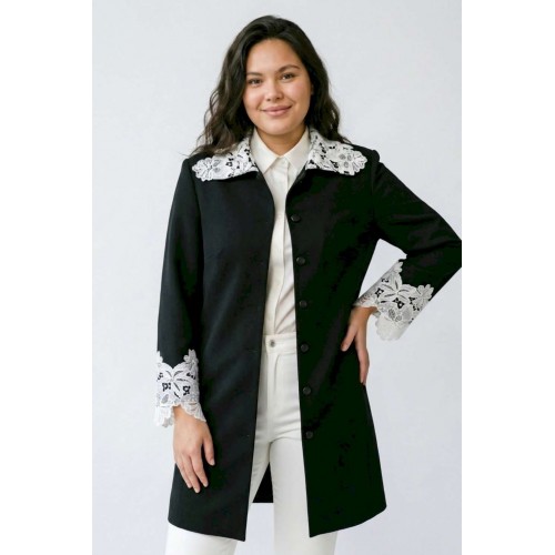 Жакет 5051 Lissana — это стильный женский удлинённый жакет из коллекции бренда Lissana, выполненный из чёрного трикотажа. Материал состоит из вискозы, полиамида и спандекса, что обеспечивает мягкость, износостойкость и эластичность. Жакет декорирован белым ажурным кружевом на воротнике и рукавах, что создаёт контраст и добавляет утончённость. Прямой силуэт визуально вытягивает фигуру, а длина спинки 79 см и длина рукава 54 см делают его подходящим для роста 162–175 см. Подкладка обеспечивает дополнительный комфорт. Этот жакет универсален, подходя как для офиса, так и для повседневных или нарядных комплектов, и может быть носим во все сезоны.
