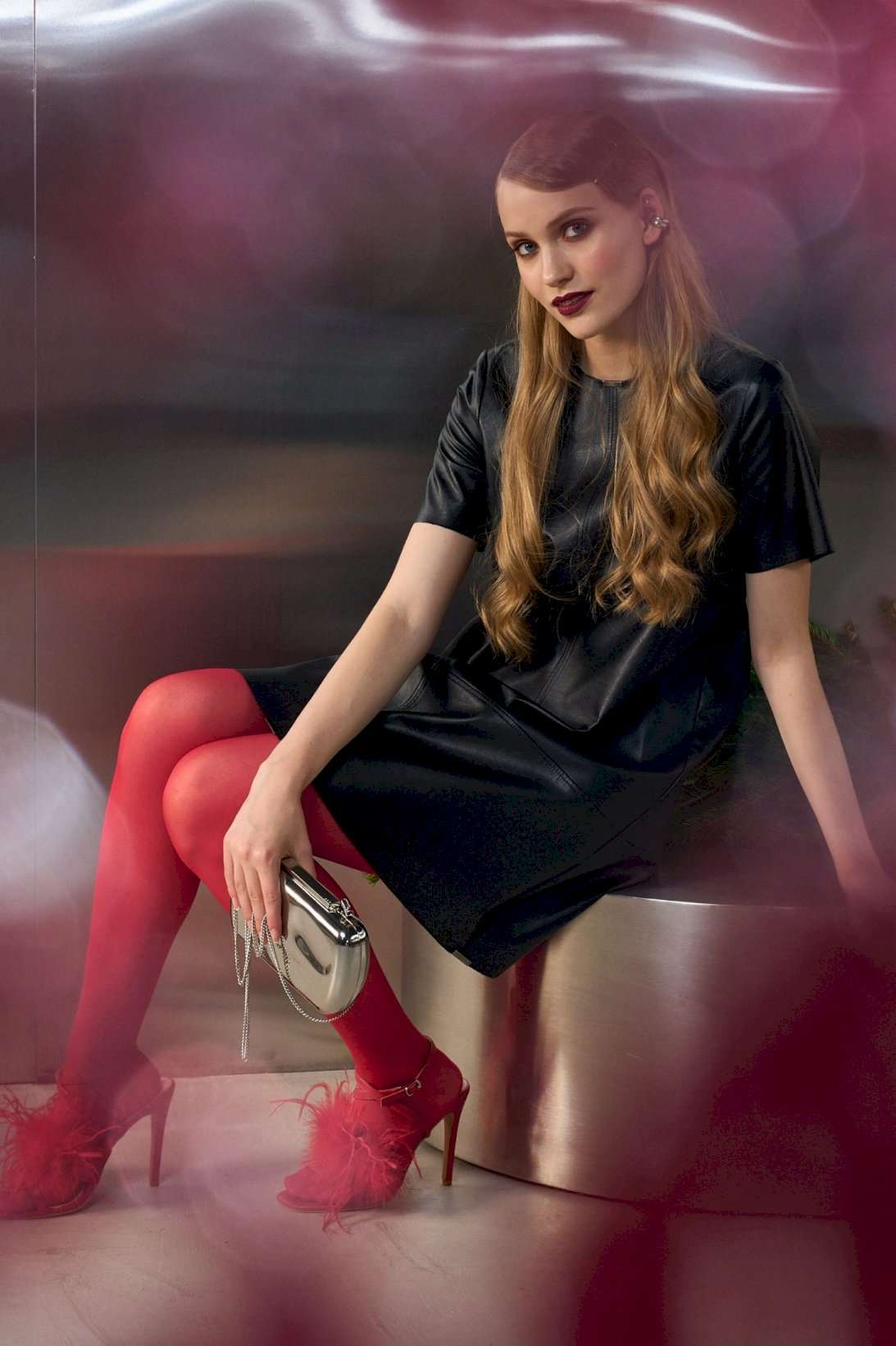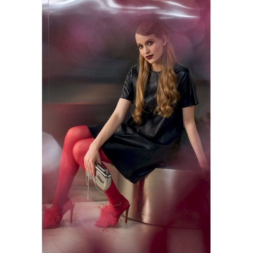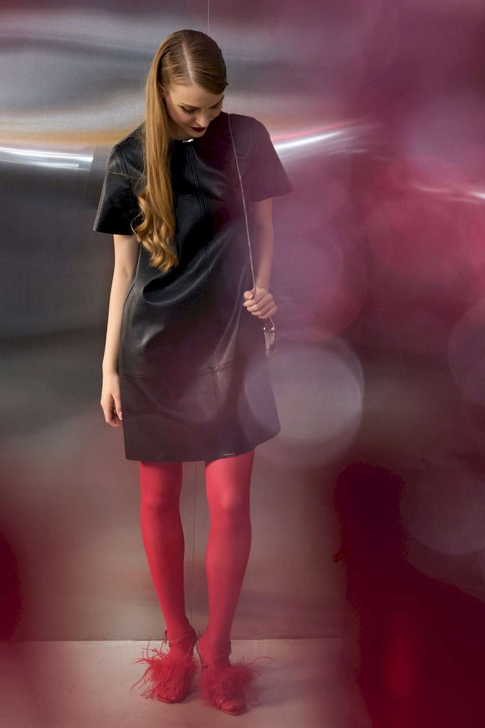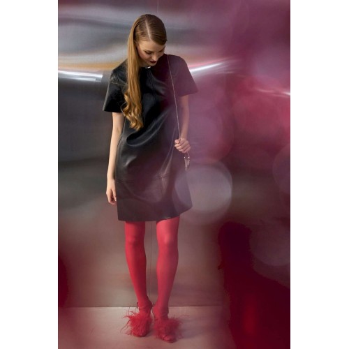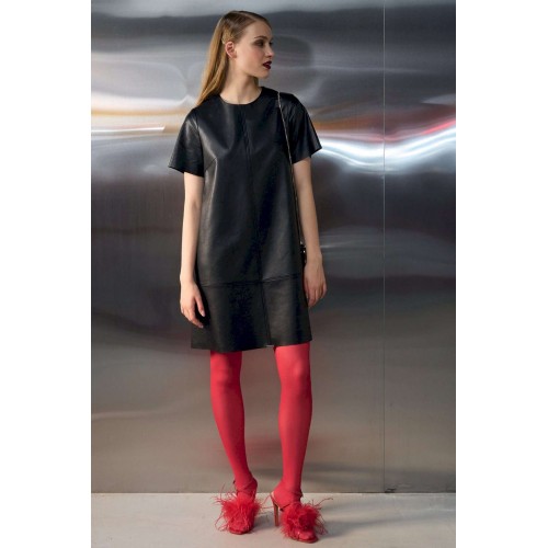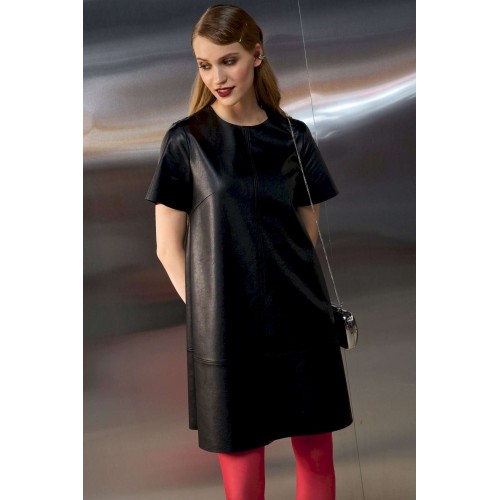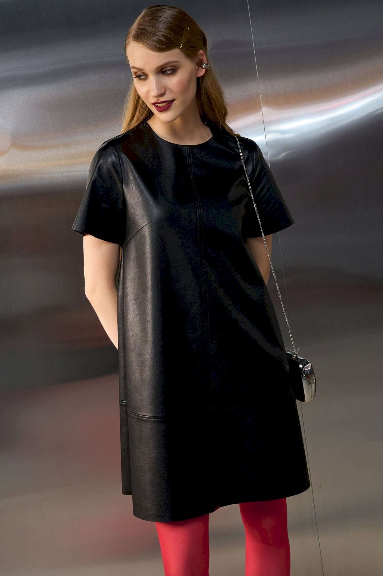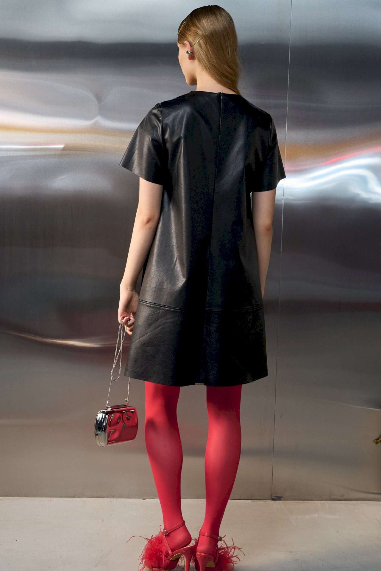 Платье А силуэта выполнено из экокожи, на подкладке. Рукав втачной короткий, округлый вырез горловины. По переду центральный шов и нагрудные вытачки. Застежка на потайную молнию в среднем шве спинки. Центральные, боковые швы и горловина декорированы металлическими зажимами. Платье: Длина по спинке от высшей точки горловины: 90 см Длина рукава: 22 см ОГ: 96-100-104-108 см (размер 44-46-48-50). ОТ: 106-110-114-118 см (размер 44-46-48-50).