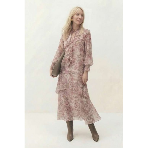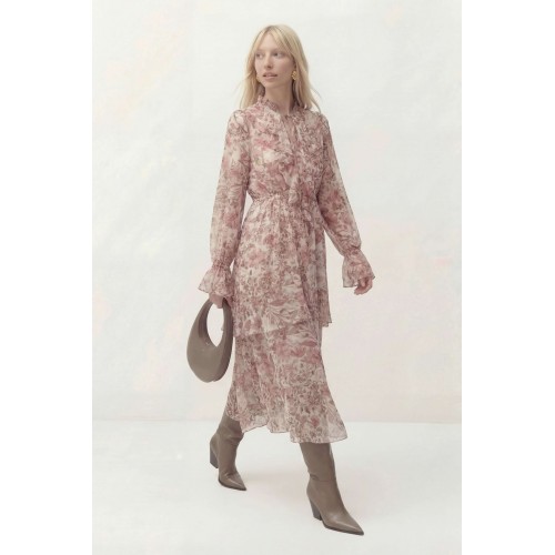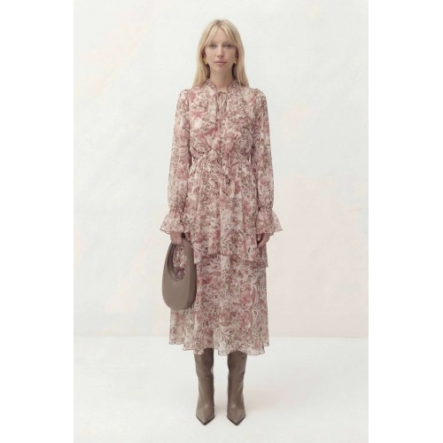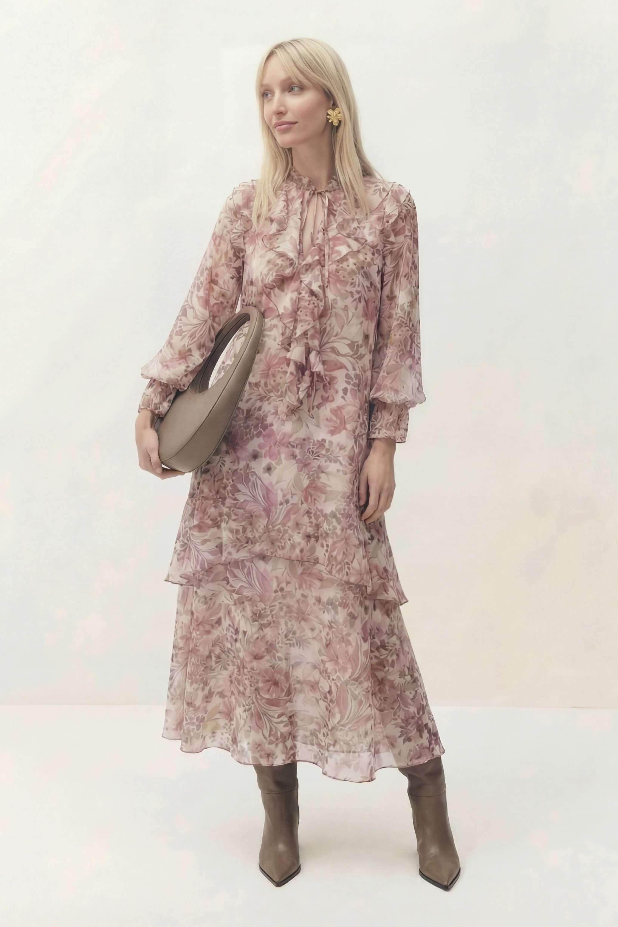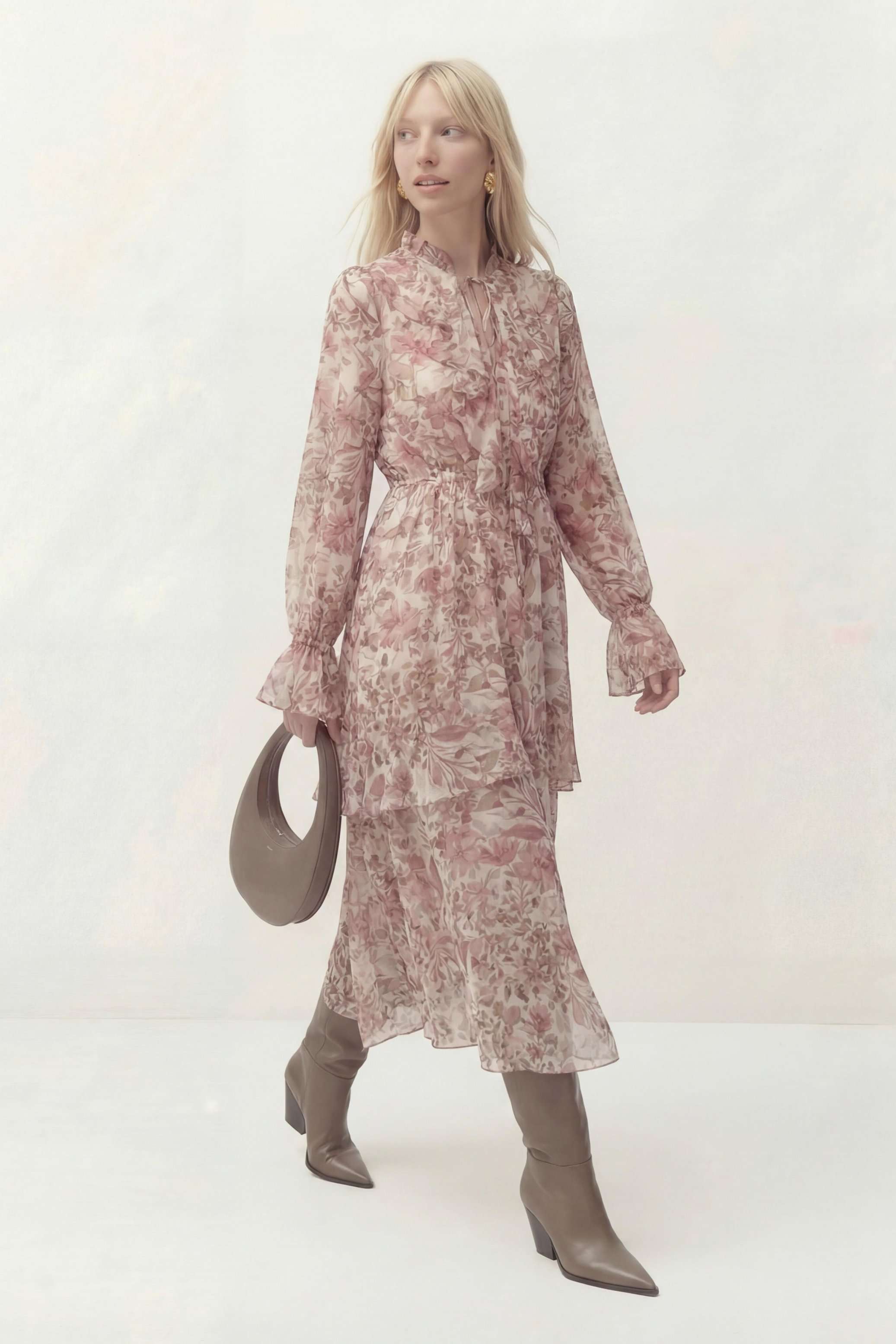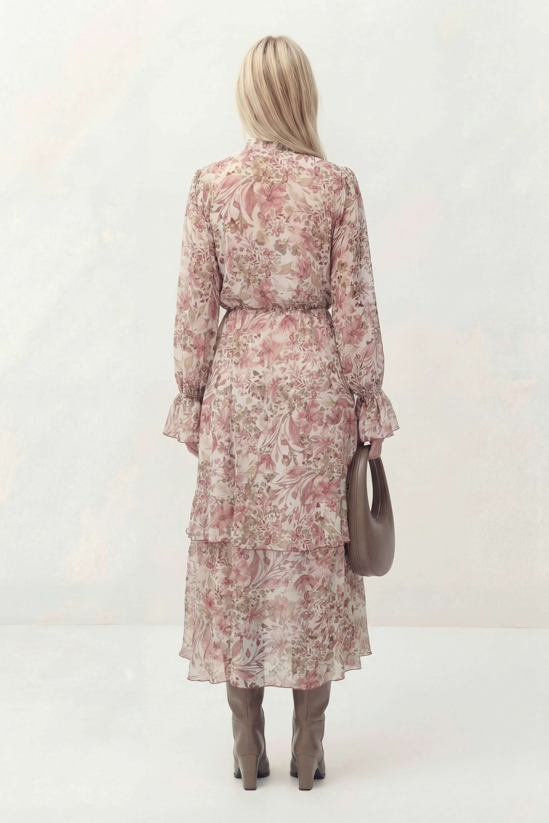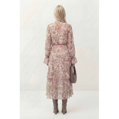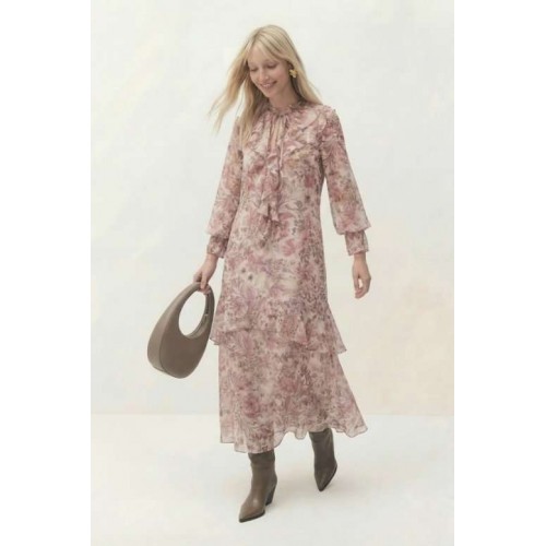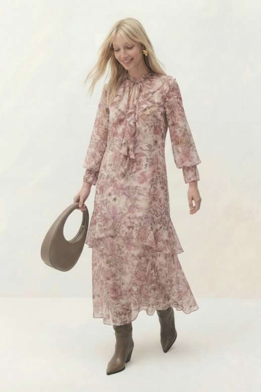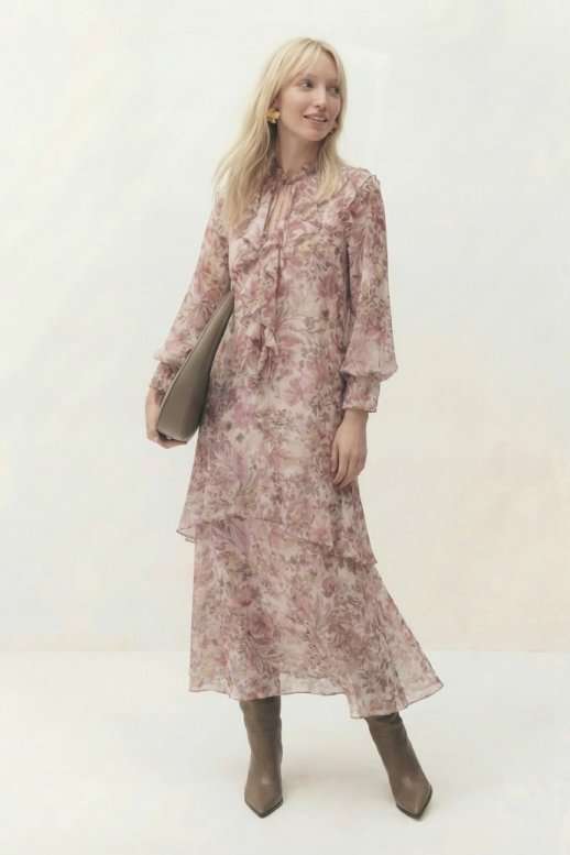 Платье свободного двухпредметное. Верхний слой платья выполнен из шифона. Рукав длинный втачной, по низу рукава резинка, в шов втачивания рукава по переду вставлена рюша. По горловине стойка, собранная на сборку с завязкой. По переду от плеча до линии талии вставлен волан с отлетными концами. По линии талии вставлена кулиса. По низу платья в фигурный подрез вставлен волан. Платье: Длина платья по спинке: 141 см Длина рукава: 69 см ОГ: 106-110-114-118-122-126-130 см (размер 42-44-46-48-50-52-54) Комбинация: Длина платья по спинке: 92 см ОГ: 84-88-92-96-100-104-108 см (размер 42-44-46-48-50-52-54) ОТ: 98-102-106-110-114-118-122 см (размер 42-44-46-48-50-52-54) ОБ: 102-106-110-114-118-122-126 см (размер 42-44-46-48-50-52-54)