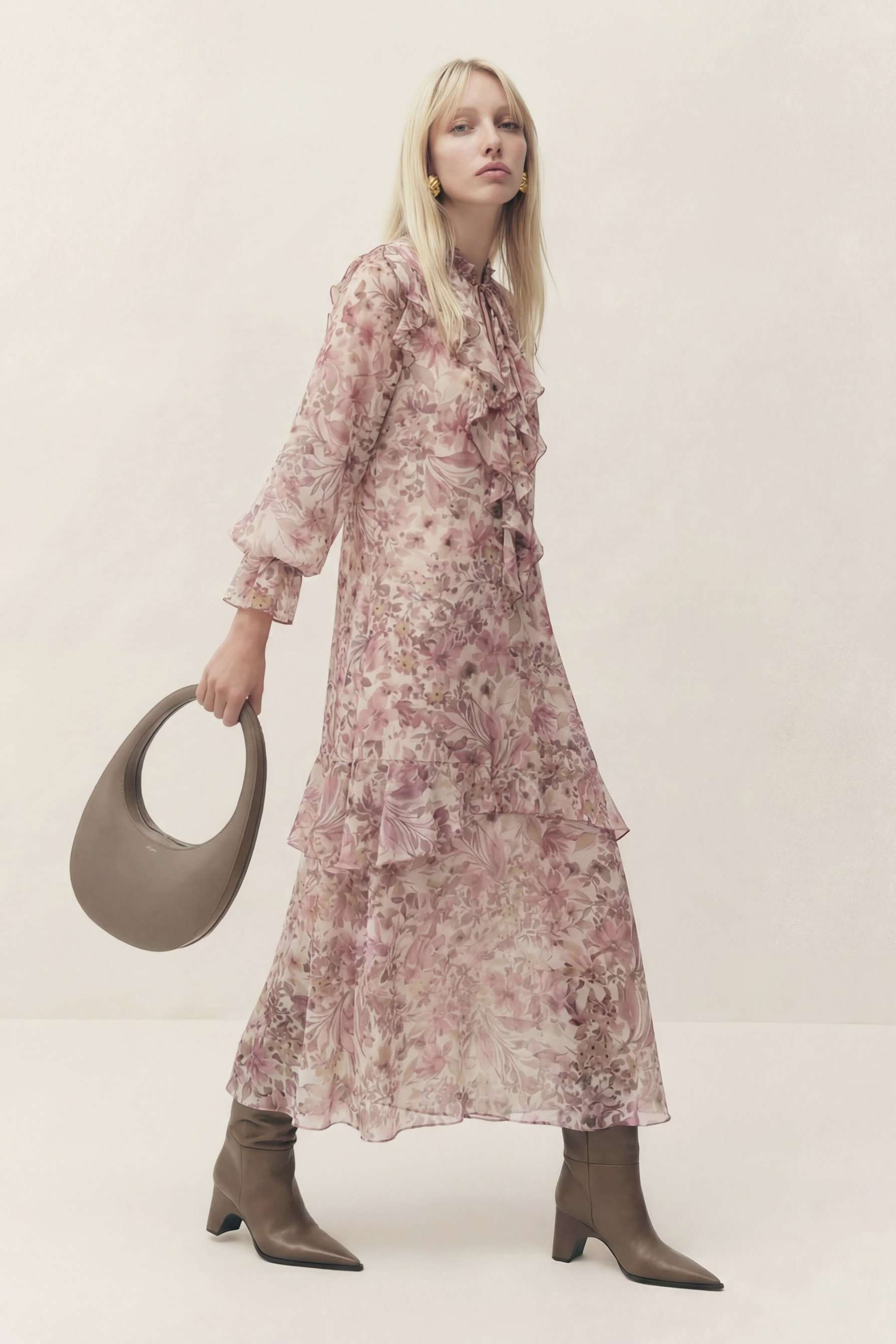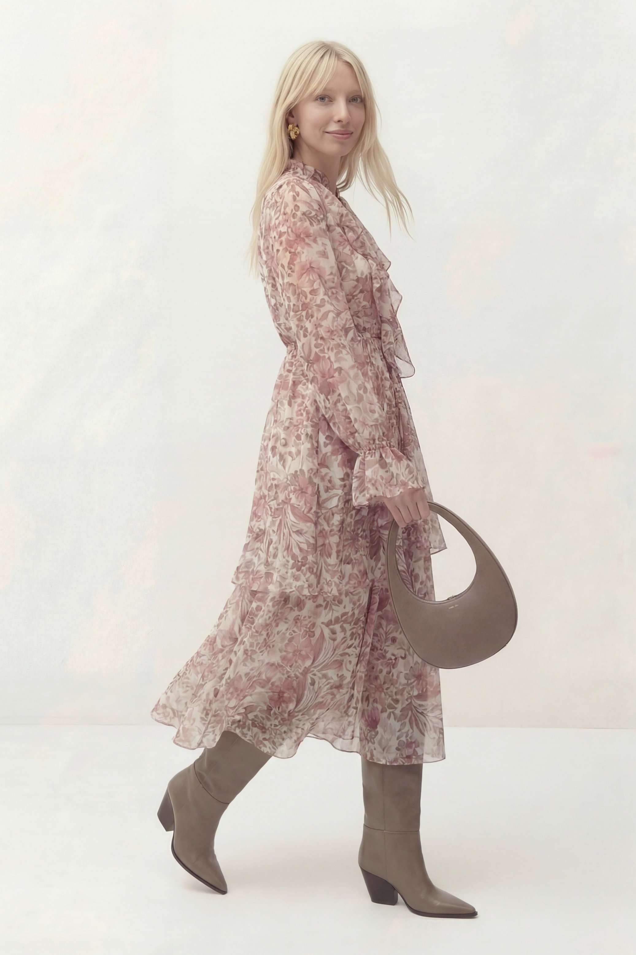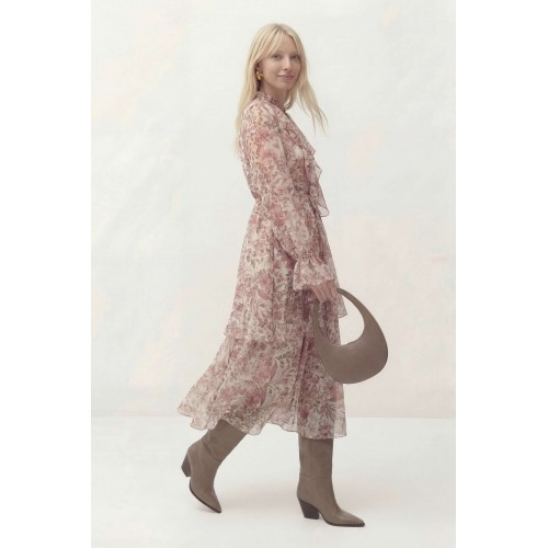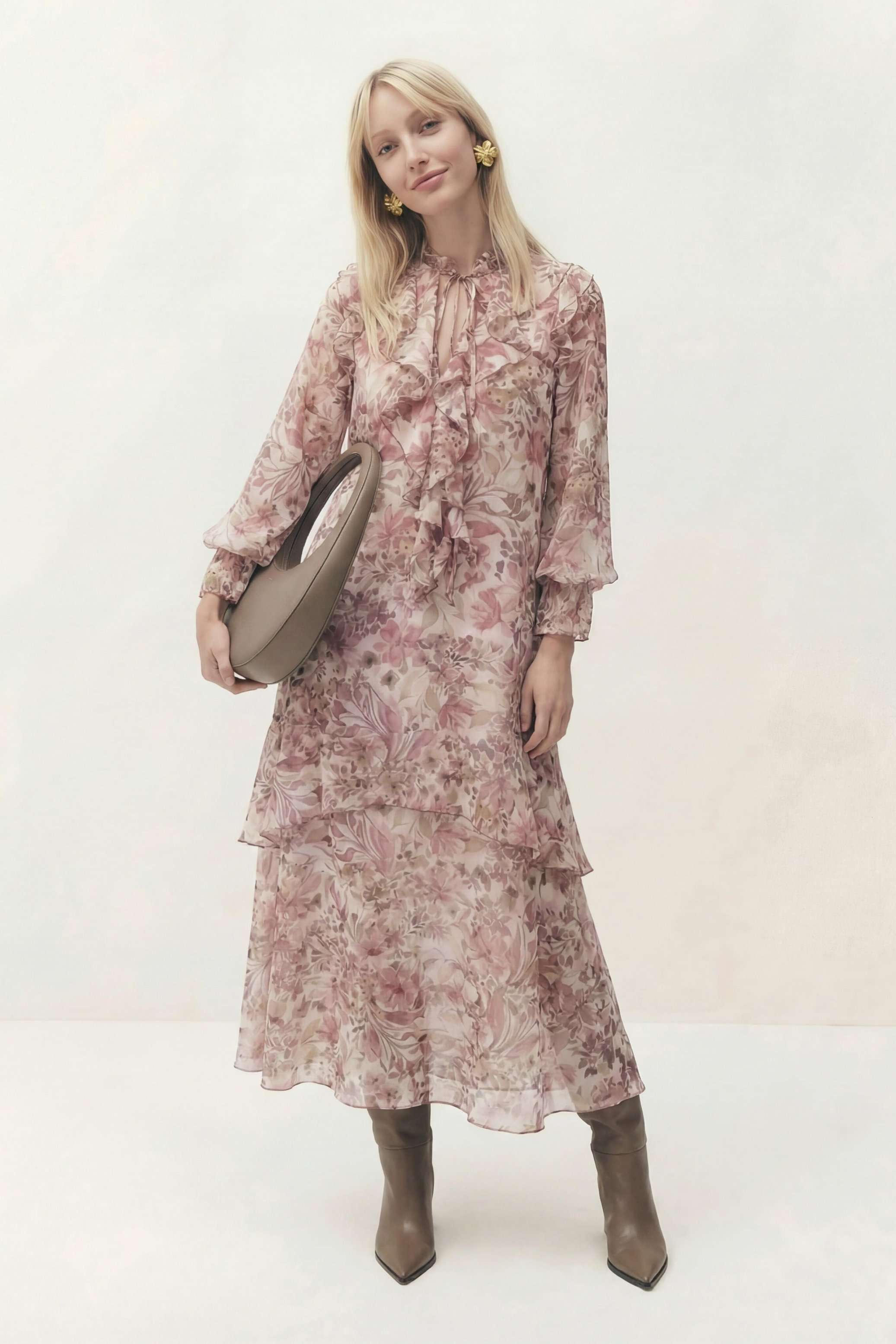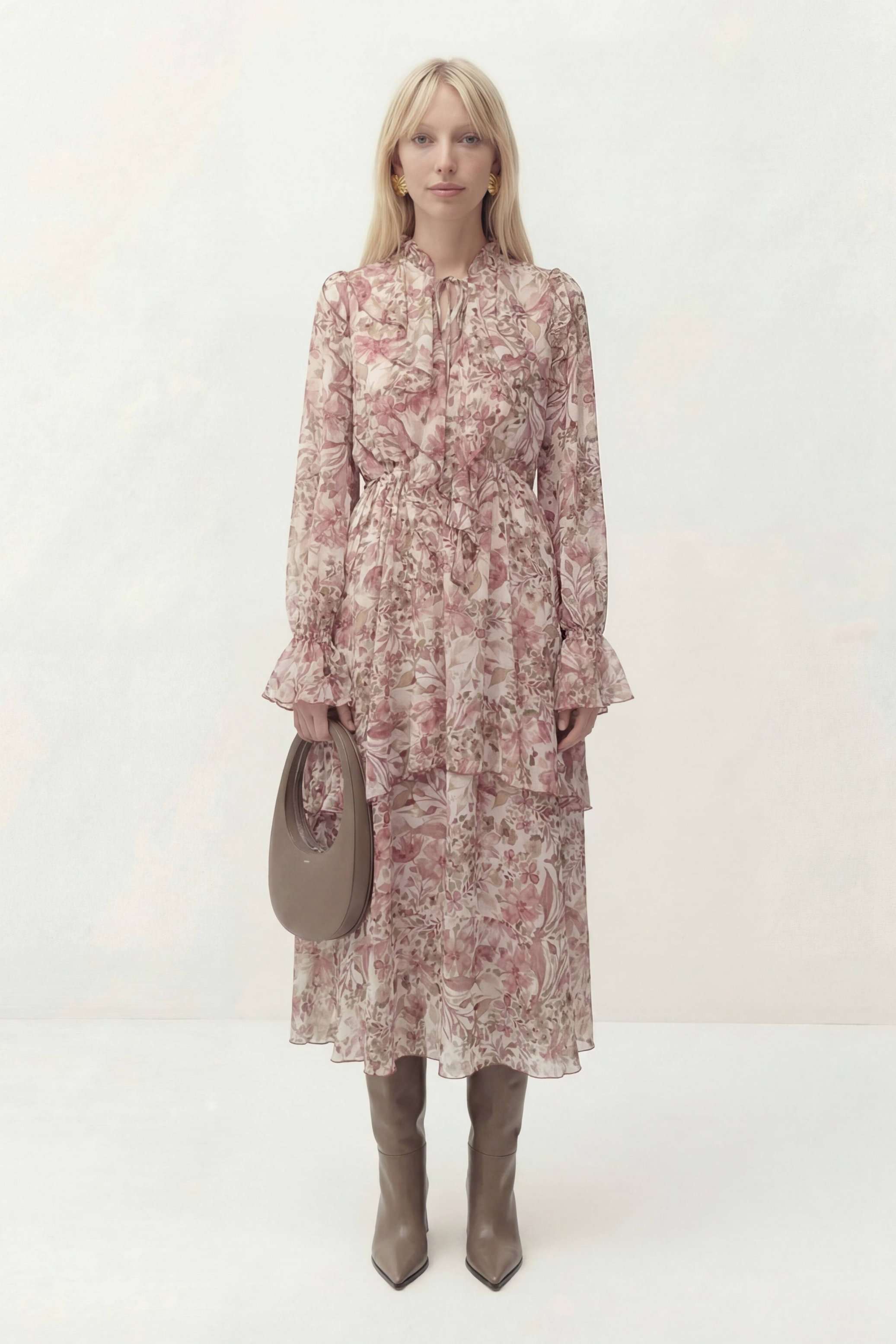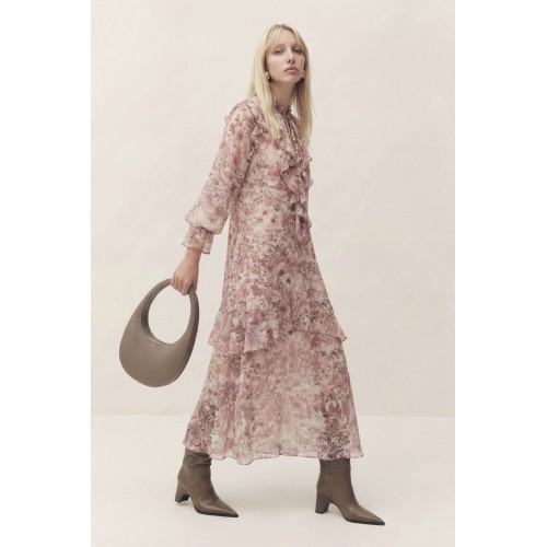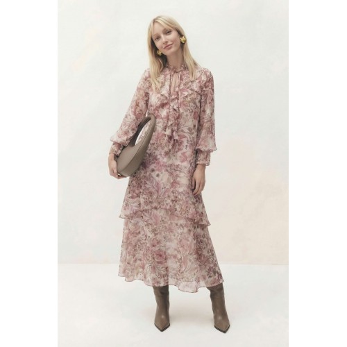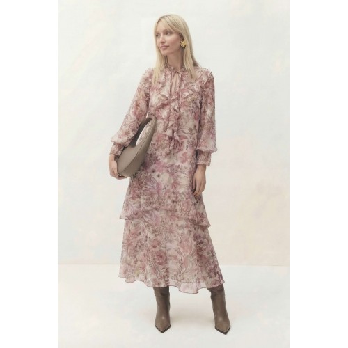 Платье свободного двухпредметное. Верхний слой платья выполнен из шифона. Рукав длинный втачной, по низу рукава резинка, в шов втачивания рукава по переду вставлена рюша. По горловине стойка, собранная на сборку с завязкой. По переду от плеча до линии талии вставлен волан с отлетными концами. По линии талии вставлена кулиса. По низу платья в фигурный подрез вставлен волан. Платье: Длина платья по спинке: 141 см Длина рукава: 69 см ОГ: 106-110-114-118-122-126-130 см (размер 42-44-46-48-50-52-54) Комбинация: Длина платья по спинке: 92 см ОГ: 84-88-92-96-100-104-108 см (размер 42-44-46-48-50-52-54) ОТ: 98-102-106-110-114-118-122 см (размер 42-44-46-48-50-52-54) ОБ: 102-106-110-114-118-122-126 см (размер 42-44-46-48-50-52-54)