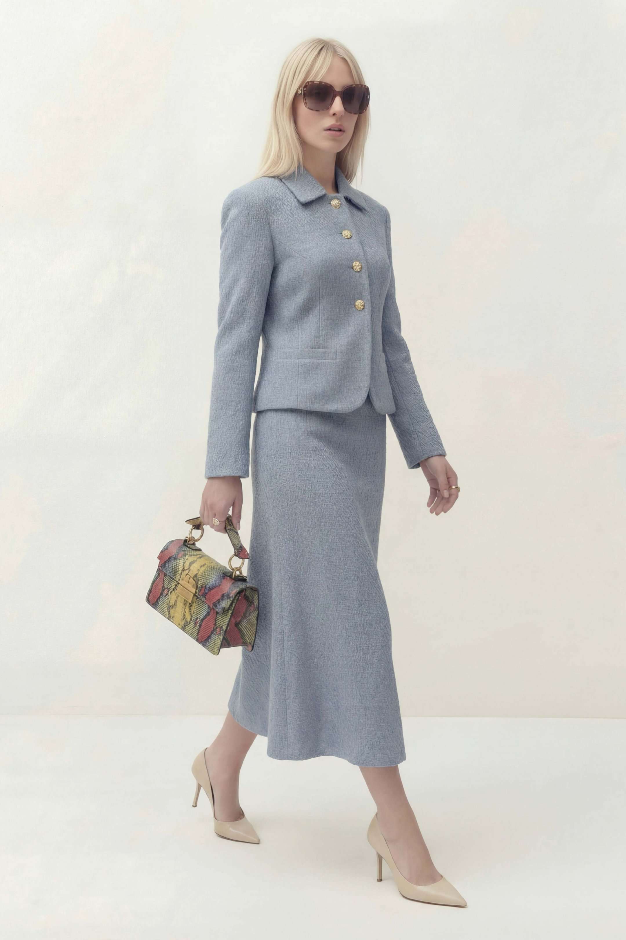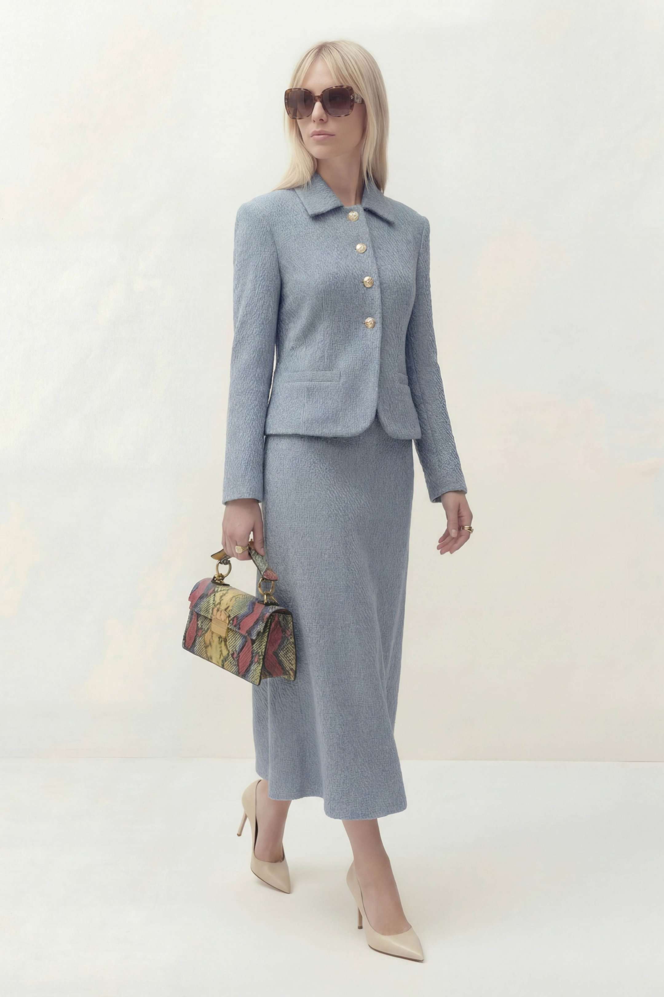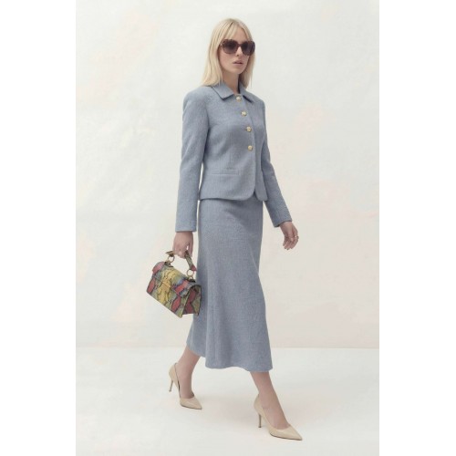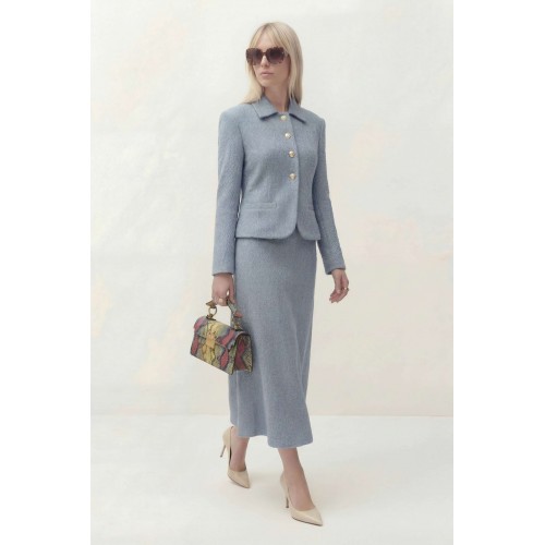 Жакет полуприлегающего силуэта на подкладке. Рукав втачной длинный. Воротник рубашечного кроя. Застежка центральная на петли и пуговицы, по бокам прорезные карманы и листочка. По спинке средний шов. Юбка на притачном поясе на подкладке, застежка по боковому шву на потайную молнию. Жакет: Длина по спинке от высшей точки горловины: 52 см Длина рукава: 60 см ОГ: 102-106-110-114-118 см (размер 42-44-46-48-50) Юбка: ОТ: 70-74-78-82-86 см (размер 42-44-46-48-50) ОБ: 102-106-110-114-118 см (размер 42-44-46-48-50) Длина: 84 см