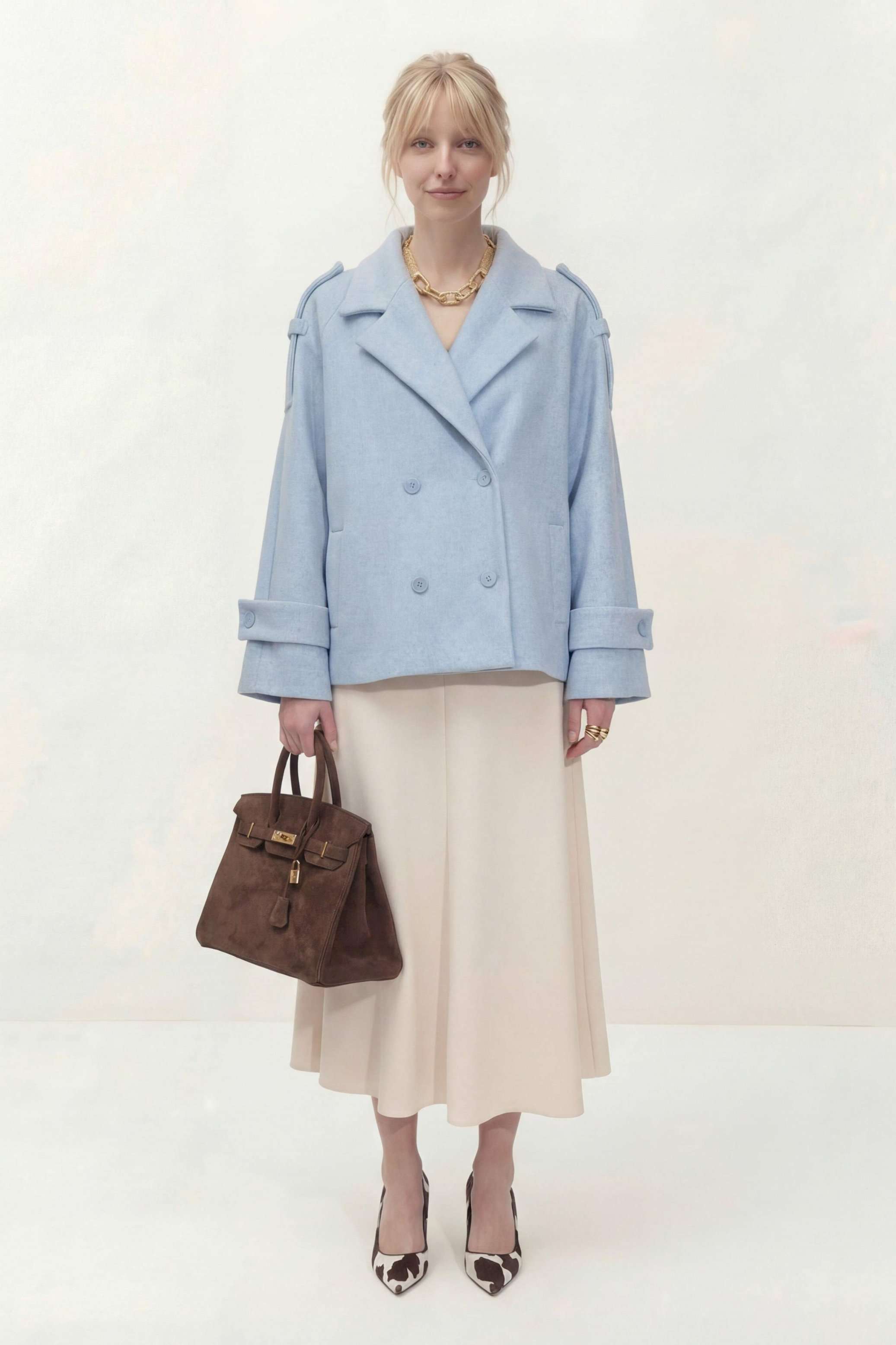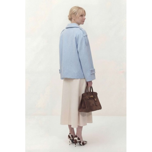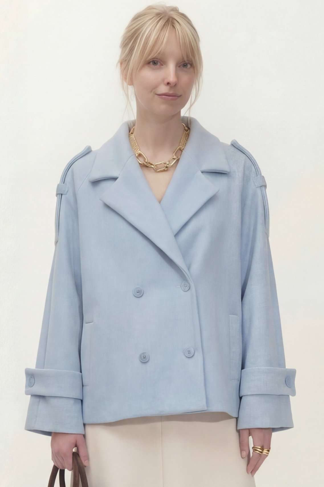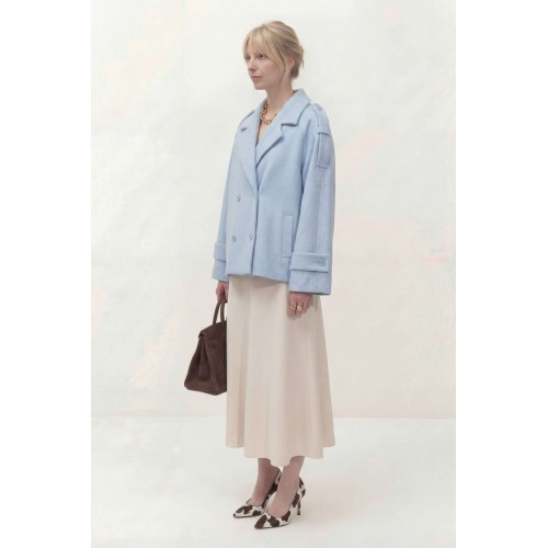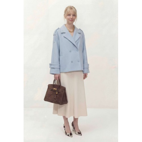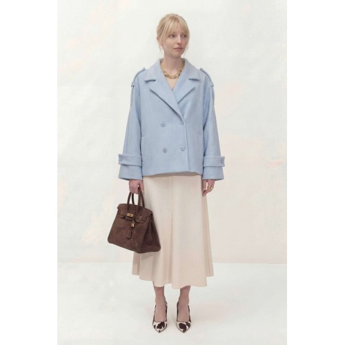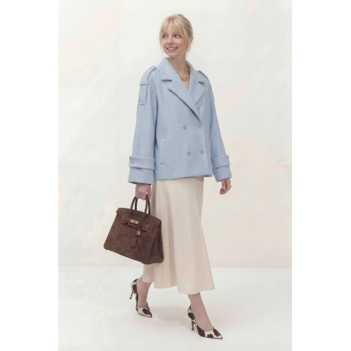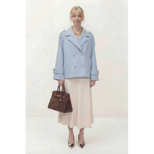 Укороченное двубортное пальто свободного кроя. Широкий английский воротник с заостренными лацканами. Застежка на два ряда пуговиц. Рукав реглан на манжете с пуговицой. На плечах элементы напоминающие погоны. Пальто: Длина пальто по спинке от высшей точки горловины: 67,5 см Длина рукава от горловины: 72 см ОГ: 118-122-126-130-134 см (размер 44-46-48-50-52)