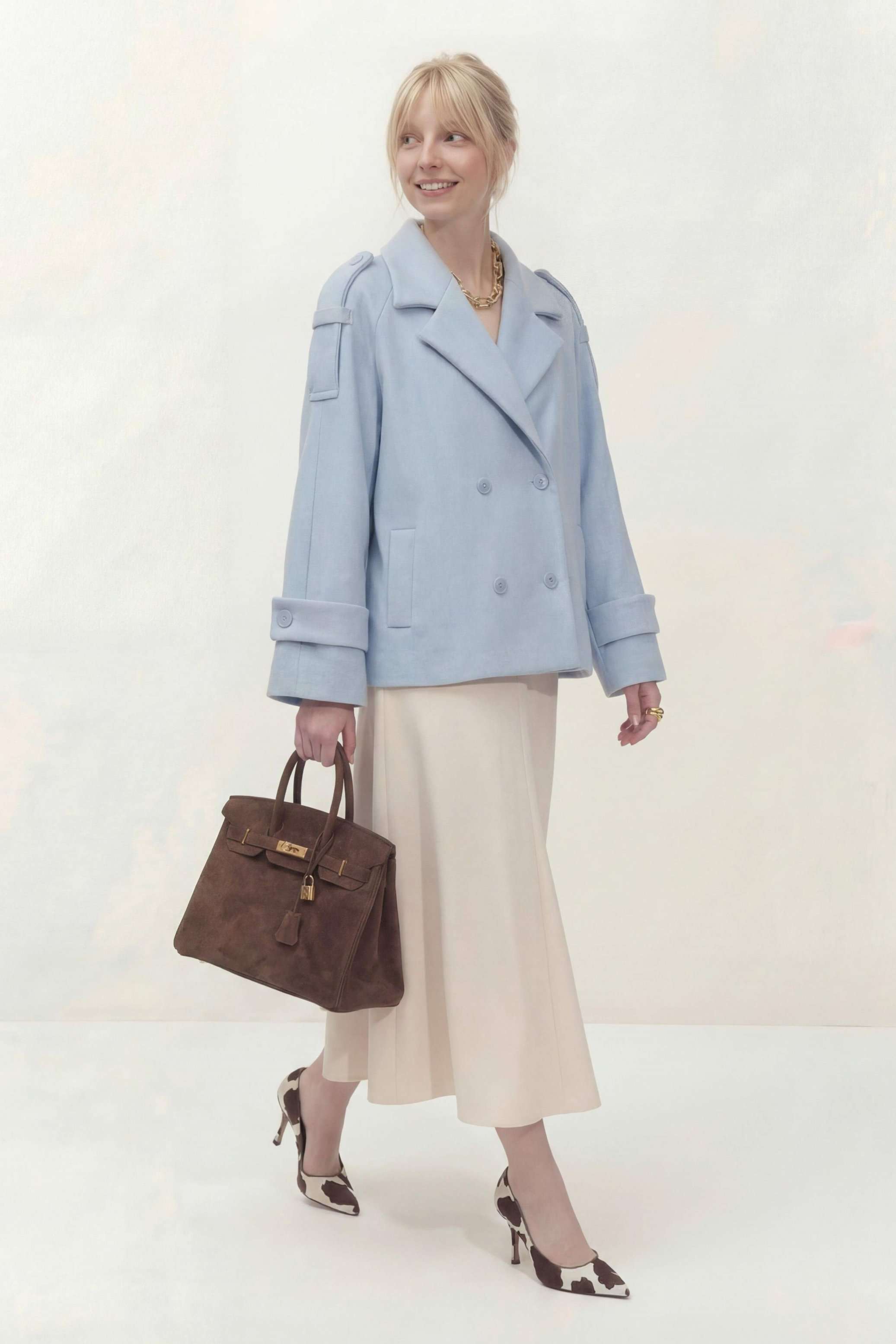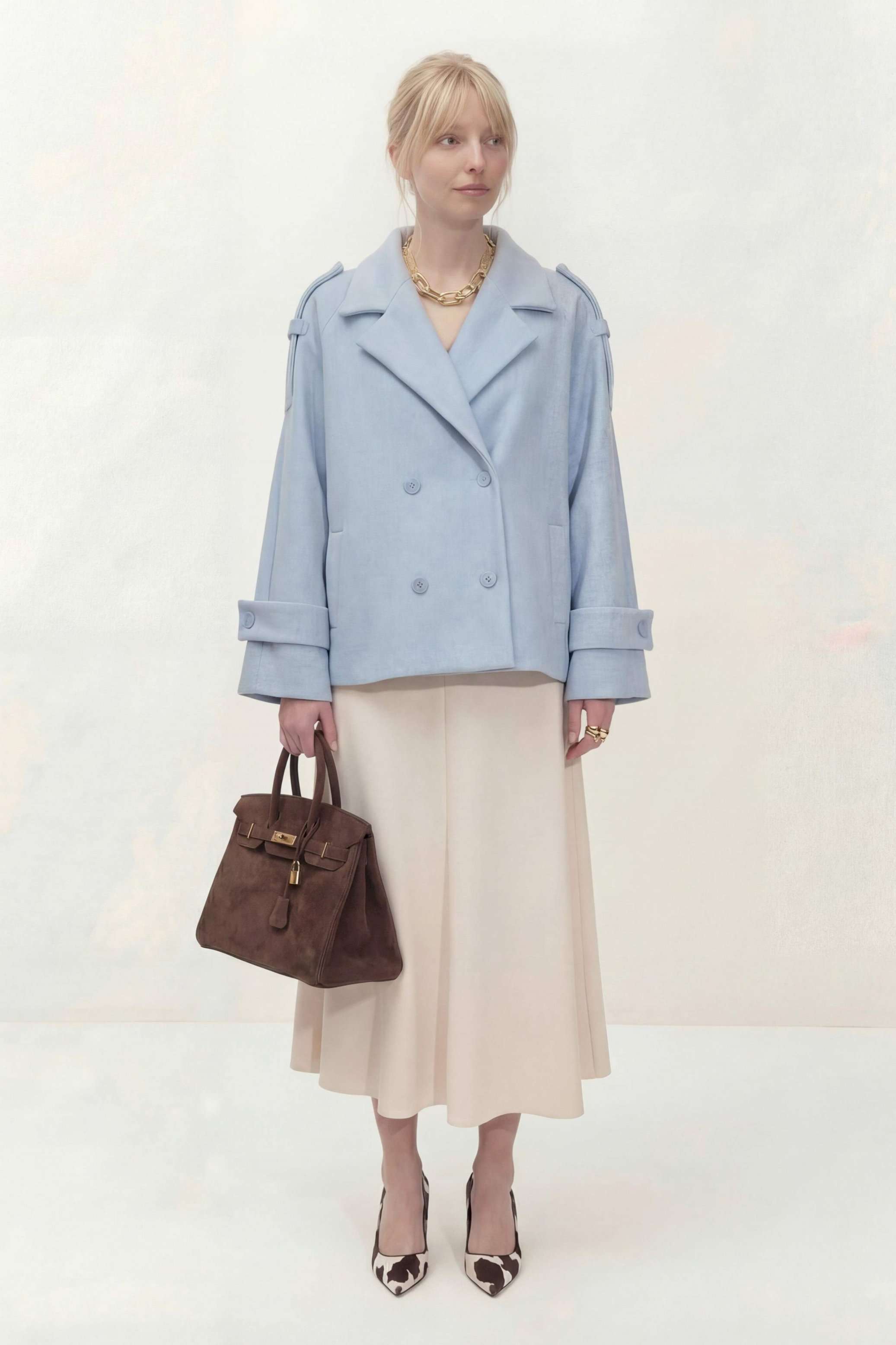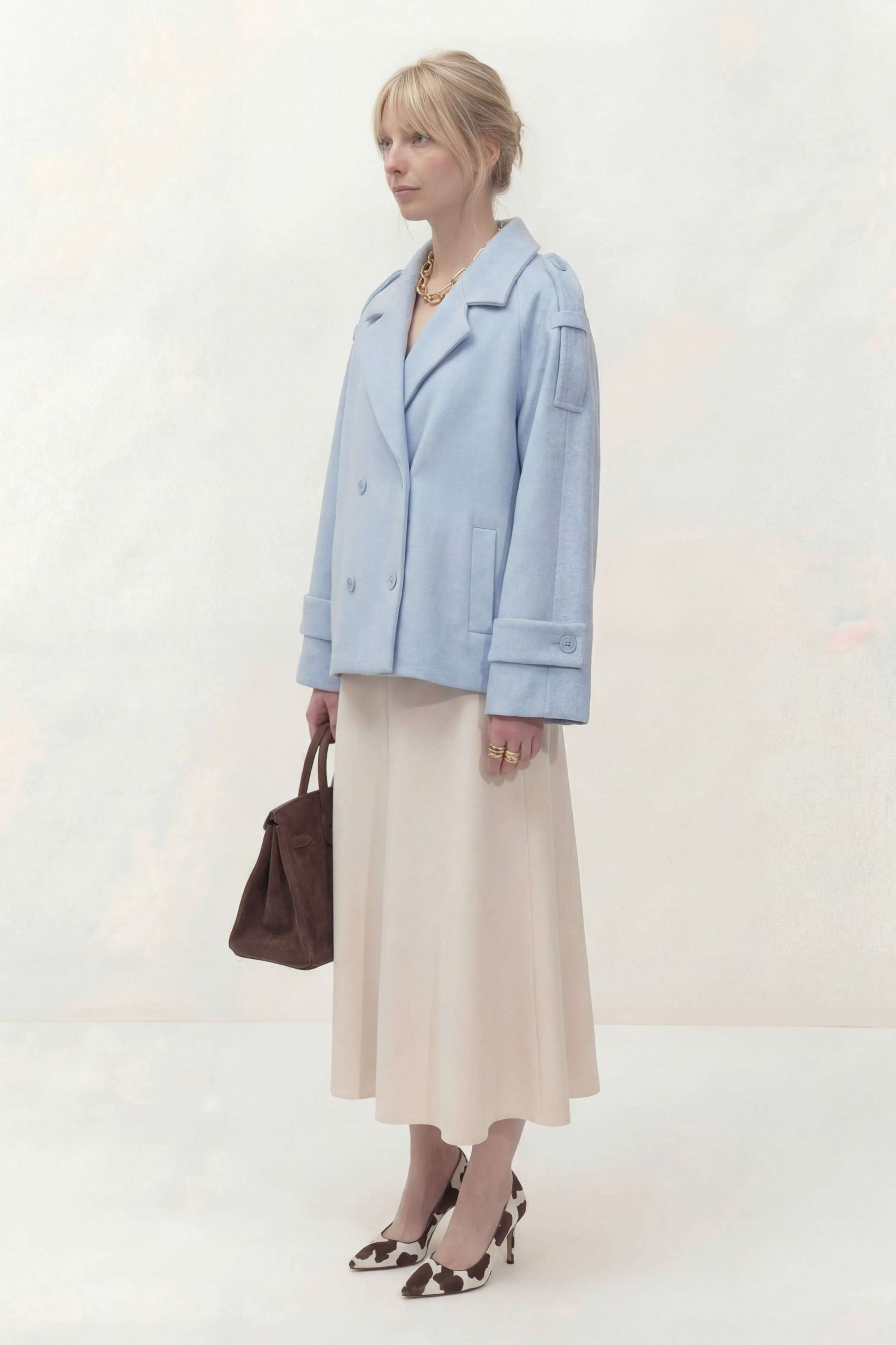Укороченное двубортное пальто свободного кроя. Широкий английский воротник с заостренными лацканами. Застежка на два ряда пуговиц. Рукав реглан на манжете с пуговицой. На плечах элементы напоминающие погоны. Пальто: Длина пальто по спинке от высшей точки горловины: 67,5 см Длина рукава от горловины: 72 см ОГ: 118-122-126-130-134 см (размер 44-46-48-50-52)