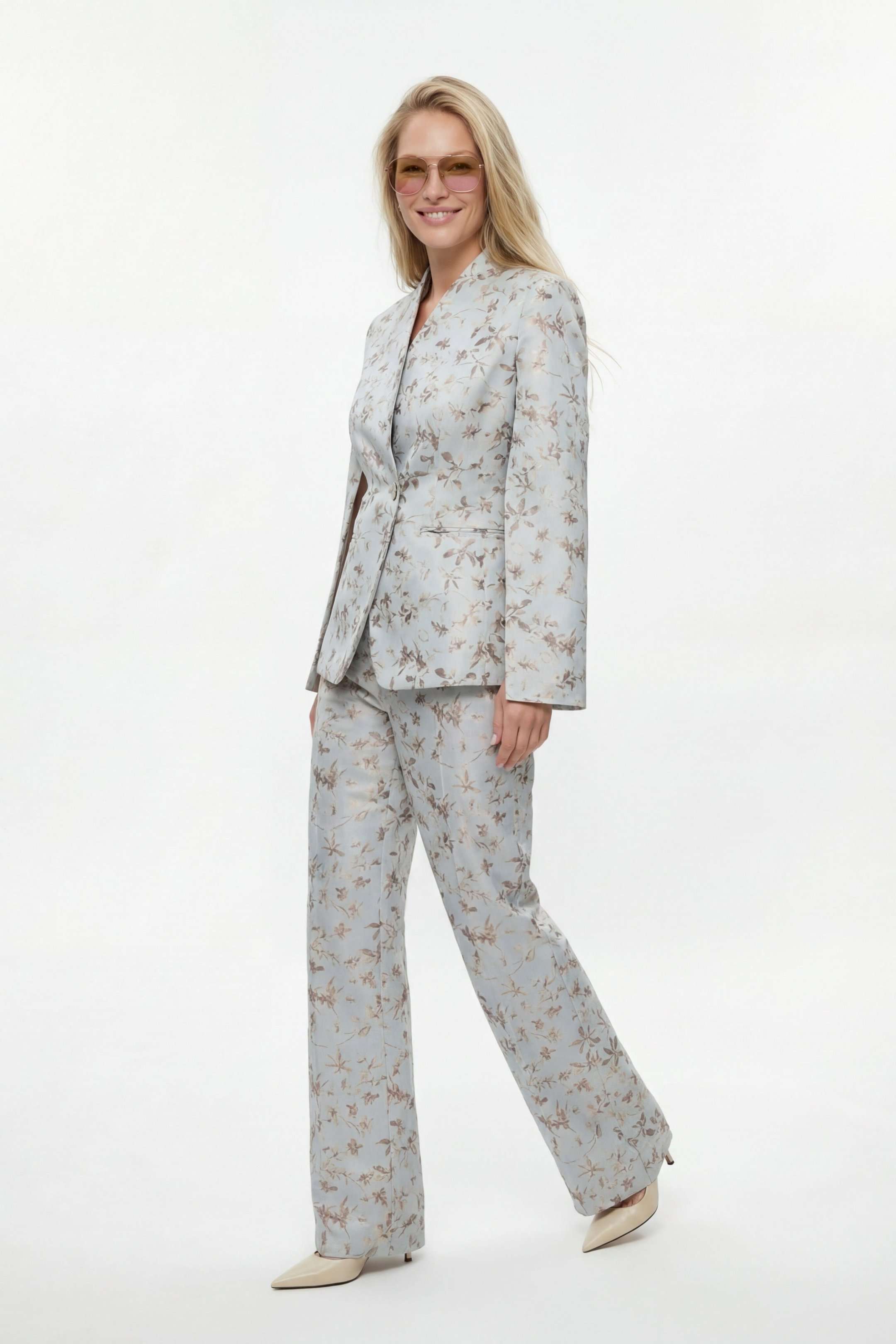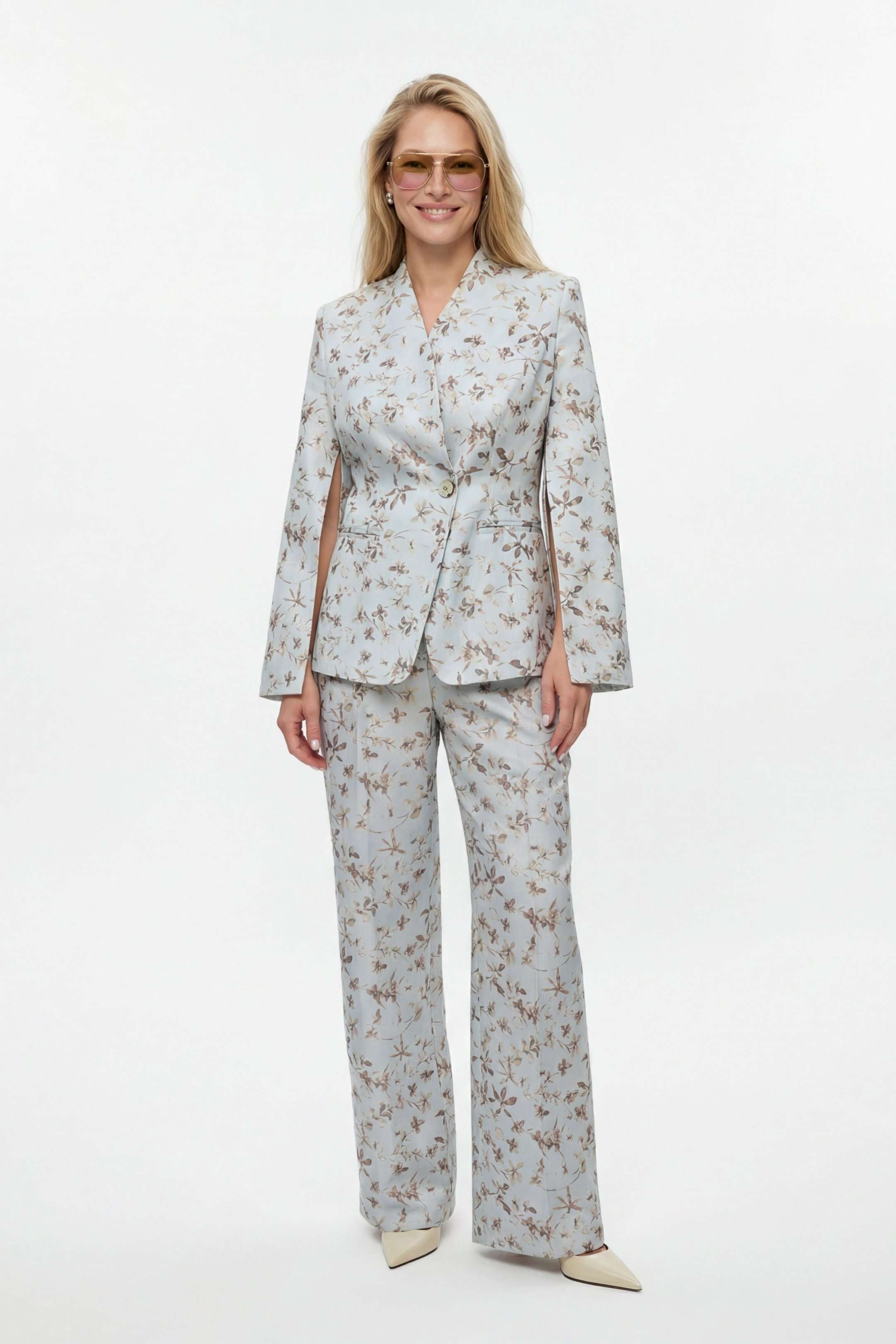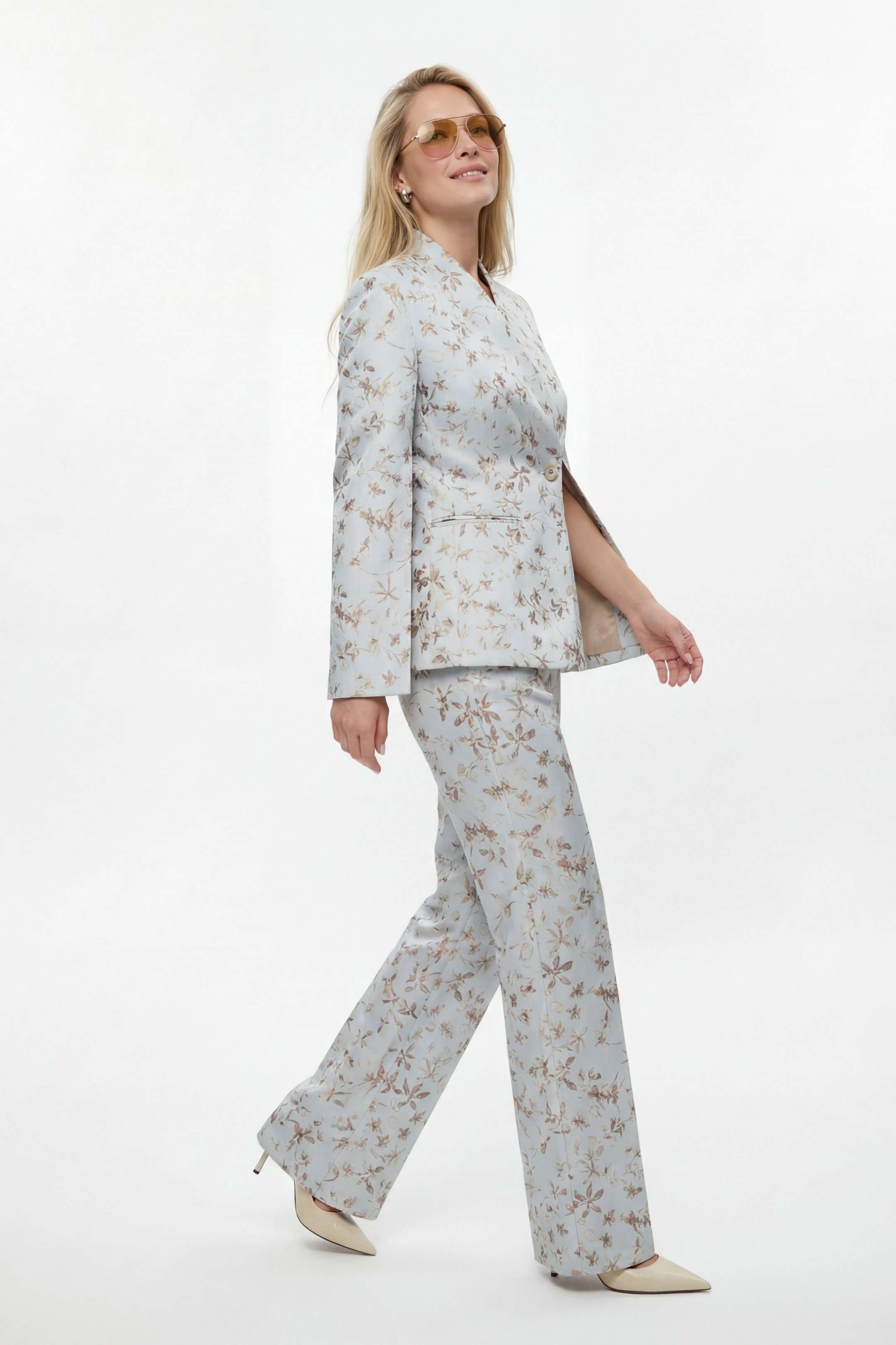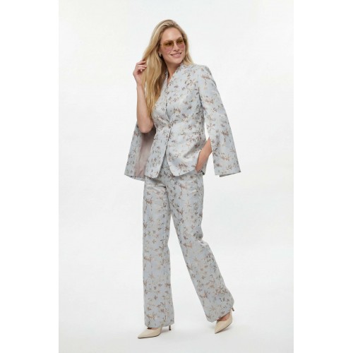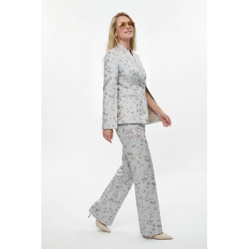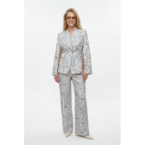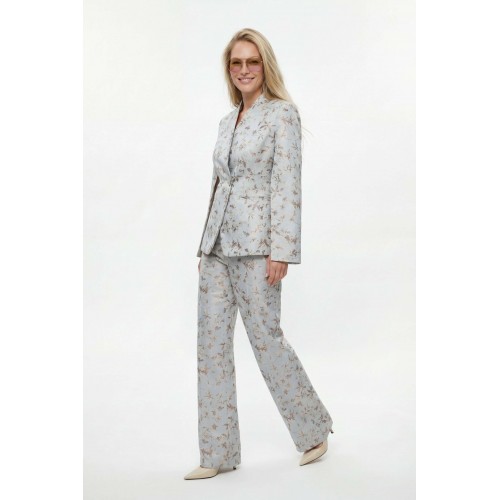 Костюм брючный, выполнен из плательно-костюмной ткани. Жакет полуприлегающего силуэта на подкладке, застежка на одну петлю и пуговицу. Рукав втачной длинный, по шву разрезы. На шлице рукава пуговица. Воротник стойка. Низ борта закругленный. По бокам прорезные карманы в рамку. По спинке средний шов, переходящий в отлетную шлицу, и рельефы. Брюки на притачном поясе с резинкой по спинке, застёжка на молнию и петлю-пуговицу. В боковых швах прорезные карманы. Брюки свободного кроя, прямого силуэта, на притачном поясе. По переду глубокие складки, в боковых швах прорезные карманы. По задней половине брюк талевые вытачки. Жакет: Длина по спинке от высшей точки горловины: 66 см Длина рукава: 62 см ОГ: 98-102-106-110-114 см (размер 44-46-48-50-52) Брюки: ОТ: 78-82-86-90-94 см (размер 44-46-48-50-52) ОБ: 114-118-122-126-130 см (размер 44-46-48-50-52) Длина: 112,5 см