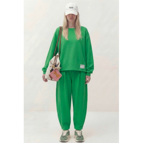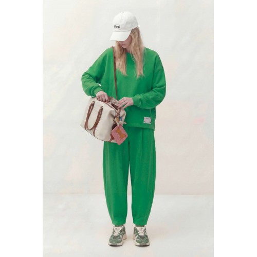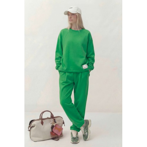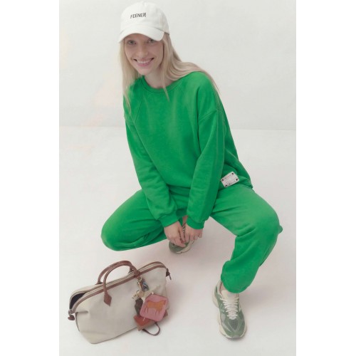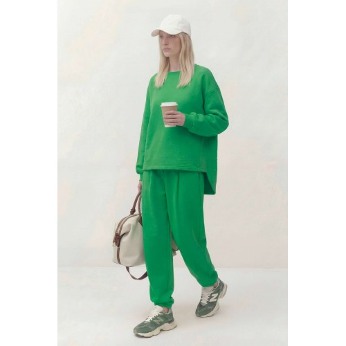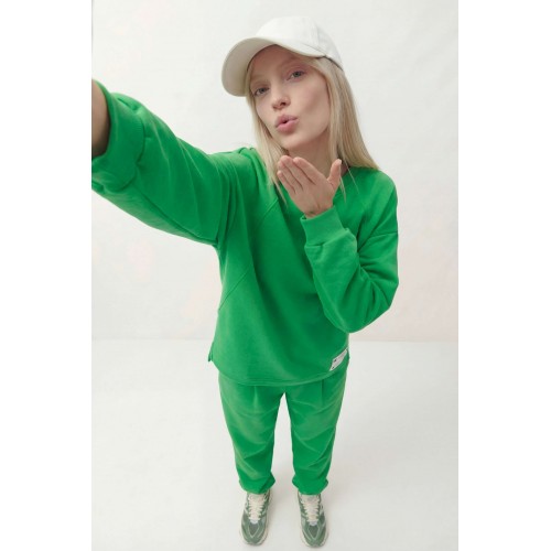Комплект состоит из джемпера и брюк, выполнен из трикотажного полотна (футер). Джемпер свободного кроя. Рукав спущенный, по низу сборка и притачная манжета, по горловине планка, по переду косые рельефы и пришивная нашивка, асимметричный низ. По спинке горизонтальный подрез и округлый низ. Брюки заужены к низу, на притачном поясе, резинка по задней части пояса, в боковых швах карманы. Джемпер: Длина по спинке: 76 см; Длина рукава: 50 см (+20 см плечевой пояс); ОГ: 126-130 см (размер 46-48); Брюки: ОТ (резинка, мин/макс): 76/98-80/98 см (размер 46-48); Длина с поясом: 104 см