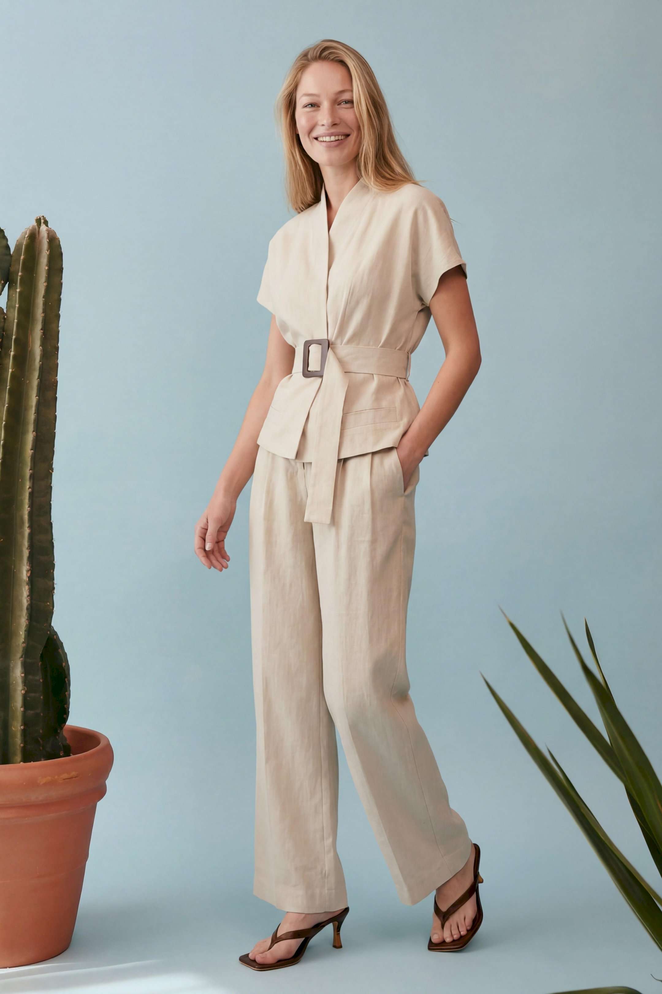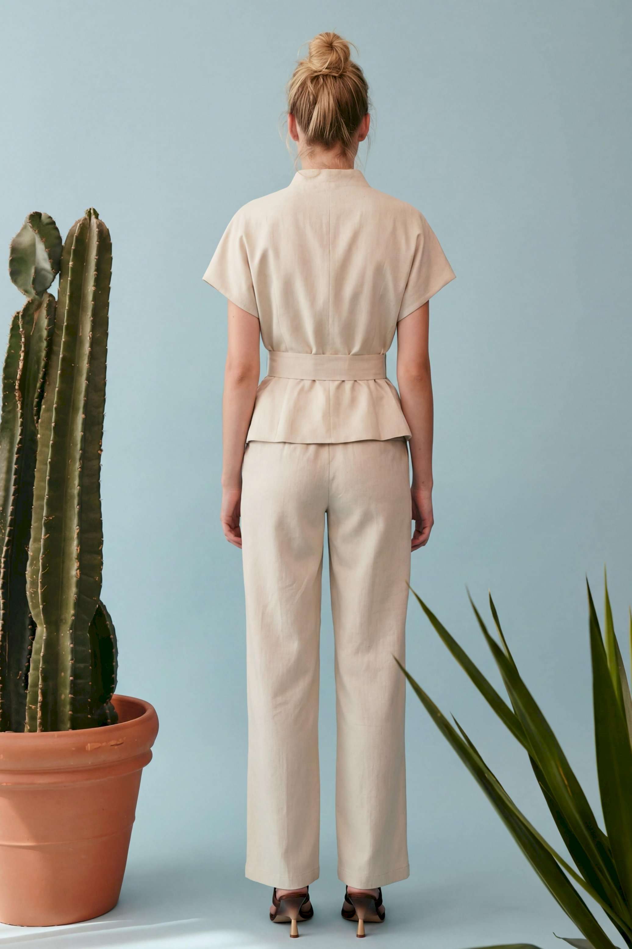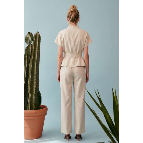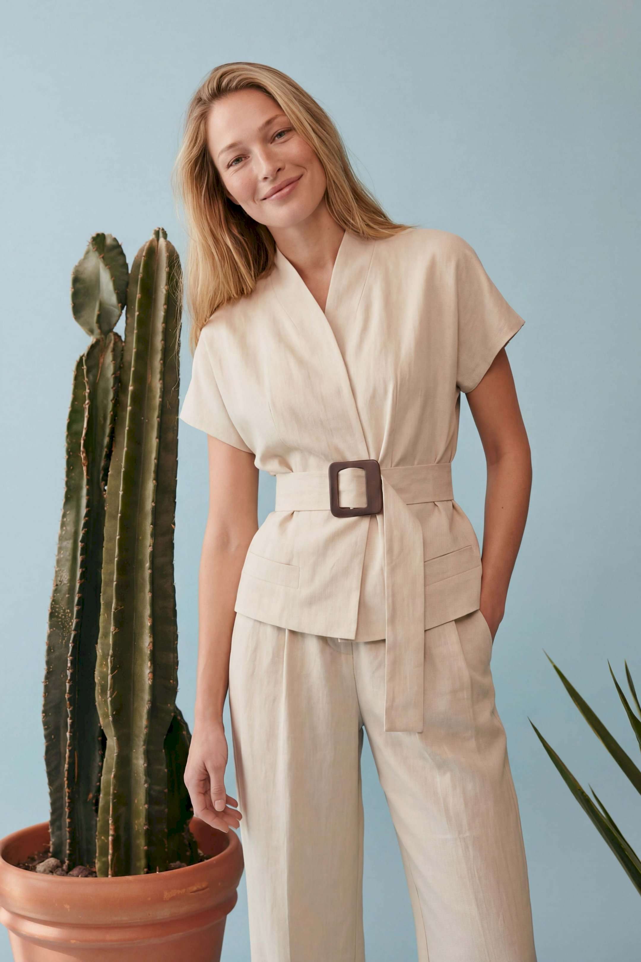 Жакет полуприлегающего силуэта на хлопковой подкладке выполнен изо льна. Модель отличается лаконичным кроем с мягкими, слегка спущенными плечами и коротким цельнокроеным рукавом, создающим плавную линию силуэта. Горловина оформлена в виде стойки с V-образным вырезом, без классического воротника, что придает образу современность и легкость. Скрытая центральная застежка на потайные кнопки, что усиливает чистоту дизайна. По переду по бокам в области бёдер не функциональные карманы-листочки. По спинке средний шов. Брюки прямого свободного силуэта, на притачном поясе, по спинке пояс на резинке. По переду брюк мягкие складки для дополнительного объема. В боковых швах карманы, застёжка на молнию, петлю и пуговицу. Основной акцент — широкий пояс из основной ткани с крупной геометричной пряжкой, который подчеркивает талию и формирует силуэт «песочные часы». Костюм выглядит современно и интеллектуально: минимализм форм сочетается с продуманной конструкцией. Натуральный оттенок и текстура ткани делают модель универсальной — она уместна как в дневных, так и в более формальных образах. Жилет: Длина по среднему шву спинки: 56 см ОГ: 90-94-98-102-106 см (размер 42-44-46-48-50) ОТ: 84-88-92-96-100 см (размер 42-44-46-48-50) ОБ: 94-98-102-106-110 см (размер 42-44-46-48-50) Длина плеча от шва притачивания стойки: 26 см Брюки: ОТ: 68-72-76-80-84 см (размер 42-44-46-48-50) ОБ: 102-106-110-114-118 см (размер 42-44-46-48-50) Длина с учетом пояса: 102,5 см